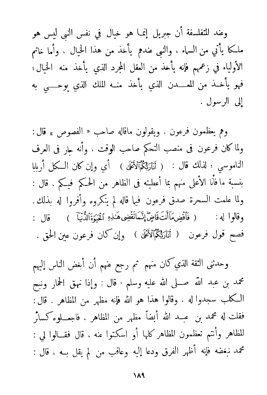 وَعِنْدَ الْمُتَفَلْسِفَةِ أَنَّ جِبْرِيلَ إنَّمَا هُوَ خَيَالٌ فِي نَفْسِ النَّبِيِّ لَيْسَ هُوَ مَلَكًا يَأْتِي مِنْ السَّمَاءِ وَالنَّبِيُّ عِنْدَهُمْ يَأْخُذُ مِنْ هَذَا الْخَيَالِ وَأَمَّا خَاتَمُ الْأَوْلِيَاءِ فِي زَعْمِهِمْ فَإِنَّهُ يَأْخُذُ مِنْ الْعَقْلِ الْمُجَرَّدِ الَّذِي يَأْخُذُ مِنْهُ الْخَيَالُ؛ فَهُوَ يَأْخُذُ مِنْ الْمَعْدِنِ الَّذِي يَأْخُذُ مِنْهُ الْمَلَكُ الَّذِي يُوحِي بِهِ إلَى الرَّسُولِ. وَهُمْ يُعَظِّمُونَ فِرْعَوْنَ. وَيَقُولُونَ مَا قَالَهُ صَاحِبُ " الْفُصُوصِ " قَالَ: وَلَمَّا كَانَ فِرْعَوْنُ فِي مَنْصِبِ التَّحَكُّمِ صَاحِبِ الْوَقْتِ وَأَنَّهُ جَارٍ فِي الْعُرْفِ الناموسي؛ لِذَلِكَ قَالَ: {أَنَا رَبُّكُمُ الْأَعْلَى} أَيْ وَإِنْ كَانَ الْكُلُّ أَرْبَابًا بِنِسْبَةِ مَا فَأَنَا الْأَعْلَى مِنْهُمْ بِمَا أُعْطِيته فِي الظَّاهِرِ مِنْ الْحُكْمِ فِيكُمْ قَالَ: وَلَمَّا عَلِمَتْ السَّحَرَةُ صِدْقَ فِرْعَوْنَ فِيمَا قَالَهُ لَمْ يُنْكِرُوهُ وَأَقَرُّوا لَهُ بِذَلِكَ. وَقَالُوا لَهُ: {فَاقْضِ مَا أَنْتَ قَاضٍ إنَّمَا تَقْضِي هَذِهِ الْحَيَاةَ الدُّنْيَا} قَالَ: فَصَحَّ قَوْلُ فِرْعَوْنَ {أَنَا رَبُّكُمُ الْأَعْلَى} وَإِنْ كَانَ فِرْعَوْنُ عَيْنَ الْحَقِّ. وَحَدَّثَنِي الثِّقَةُ الَّذِي كَانَ مِنْهُمْ ثُمَّ رَجَعَ عَنْهُمْ أَنَّ أَبْغَضَ النَّاسِ إلَيْهِمْ مُحَمَّدُ بْنُ عَبْدِ اللَّهِ صَلَّى اللَّهُ عَلَيْهِ وَسَلَّمَ. قَالَ: وَإِذَا نَهَقَ الْحِمَارُ وَنَبَحَ الْكَلْبُ سَجَدُوا لَهُ وَقَالُوا هَذَا هُوَ اللَّهُ فَإِنَّهُ مَظْهَرٌ مِنْ الْمَظَاهِرِ. قَالَ: فَقُلْت لَهُ مُحَمَّدُ بْنُ عَبْدِ اللَّهِ أَيْضًا مَظْهَرٌ مِنْ الْمَظَاهِرِ فَاجْعَلُوهُ كَسَائِرِ الْمَظَاهِرِ وَأَنْتُمْ تُعَظِّمُونَ الْمَظَاهِرَ كُلَّهَا أَوْ اُسْكُتُوا عَنْهُ قَالَ فَقَالُوا لِي: مُحَمَّدٌ نُبْغِضُهُ فَإِنَّهُ أَظْهَرَ الْفَرْقَ وَدَعَا إلَيْهِ وَعَاقَبَ مَنْ لَمْ يَقُلْ بِهِ قَالَ: