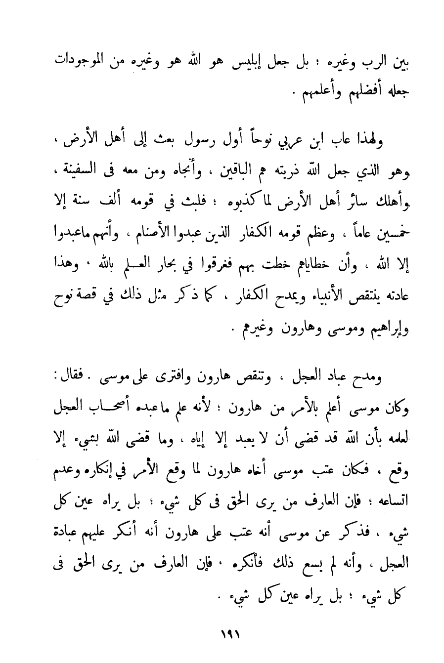 بَيْنَ الرَّبِّ وَغَيْرِهِ؛ بَلْ جَعَلَ إبْلِيسَ هُوَ اللَّهَ هُوَ وَغَيْرُهُ مِنْ الْمَوْجُودَاتِ جَعَلَهُ أَفْضَلَهُمْ وَأَعْلَمَهُمْ. وَلِهَذَا عَابَ ابْنُ عَرَبِيٍّ نُوحًا أَوَّلَ رَسُولٍ بُعِثَ إلَى أَهْلِ الْأَرْضِ وَهُوَ الَّذِي جَعَلَ اللَّهُ ذُرِّيَّتَهُ هُمْ الْبَاقِينَ وَأَنْجَاهُ وَمَنْ مَعَهُ فِي السَّفِينَةِ وَأَهْلَكَ سَائِرَ أَهْلِ الْأَرْضِ لَمَّا كَذَّبُوهُ؛ فَلَبِثَ فِي قَوْمِهِ أَلْفَ سَنَةٍ إلَّا خَمْسِينَ عَامًا وَعَظَّمَ قَوْمه الْكُفَّار الَّذِينَ عَبَدُوا الْأَصْنَامَ وَأَنَّهُمْ مَا عَبَدُوا إلَّا اللَّهَ وَأَنَّ خَطَايَاهُمْ خَطَتْ بِهِمْ فَغَرِقُوا فِي بِحَارِ الْعِلْمِ بِاَللَّهِ وَهَذَا عَادَتُهُ يَنْتَقِصُ الْأَنْبِيَاءَ وَيَمْدَحُ الْكُفَّارَ كَمَا ذَكَرَ مِثْلَ ذَلِكَ فِي قِصَّةِ نُوحٍ وَإِبْرَاهِيمَ وَمُوسَى وَهَارُونَ وَغَيْرِهِمْ. وَمَدَحَ عُبَّادَ الْعِجْلِ وَتَنَقَّصَ هَارُونَ وَافْتَرَى عَلَى مُوسَى. فَقَالَ: وَكَانَ مُوسَى أَعْلَمَ بِالْأَمْرِ مِنْ هَارُونَ؛ لِأَنَّهُ عَلِمَ مَا عَبَدَهُ أَصْحَابُ الْعِجْلِ لِعِلْمِهِ بِأَنَّ اللَّهَ قَدْ قَضَى أَنْ لَا يُعْبَدَ إلَّا إيَّاهُ وَمَا قَضَى اللَّهُ بِشَيْءِ إلَّا وَقَعَ فَكَانَ عَتْبُ مُوسَى أَخَاهُ هَارُونَ لَمَّا وَقَعَ الْأَمْرُ فِي إنْكَارِهِ وَعَدَمِ اتِّسَاعِهِ؛ فَإِنَّ الْعَارِفَ مَنْ يَرَى الْحَقَّ فِي كُلِّ شَيْءٍ؛ بَلْ يَرَاهُ عَيْنَ كُلِّ شَيْءٍ فَذَكَرَ عَنْ مُوسَى أَنَّهُ عَتَبَ عَلَى هَارُونَ أَنَّهُ أَنْكَرَ عَلَيْهِمْ عِبَادَةَ الْعِجْلِ وَأَنَّهُ لَمْ يَسَعْ ذَلِكَ فَأَنْكَرَهُ فَإِنَّ الْعَارِفَ مَنْ يَرَى الْحَقَّ فِي كُلِّ شَيْءٍ؛ بَلْ يَرَاهُ عَيْنَ كُلِّ شَيْءٍ.