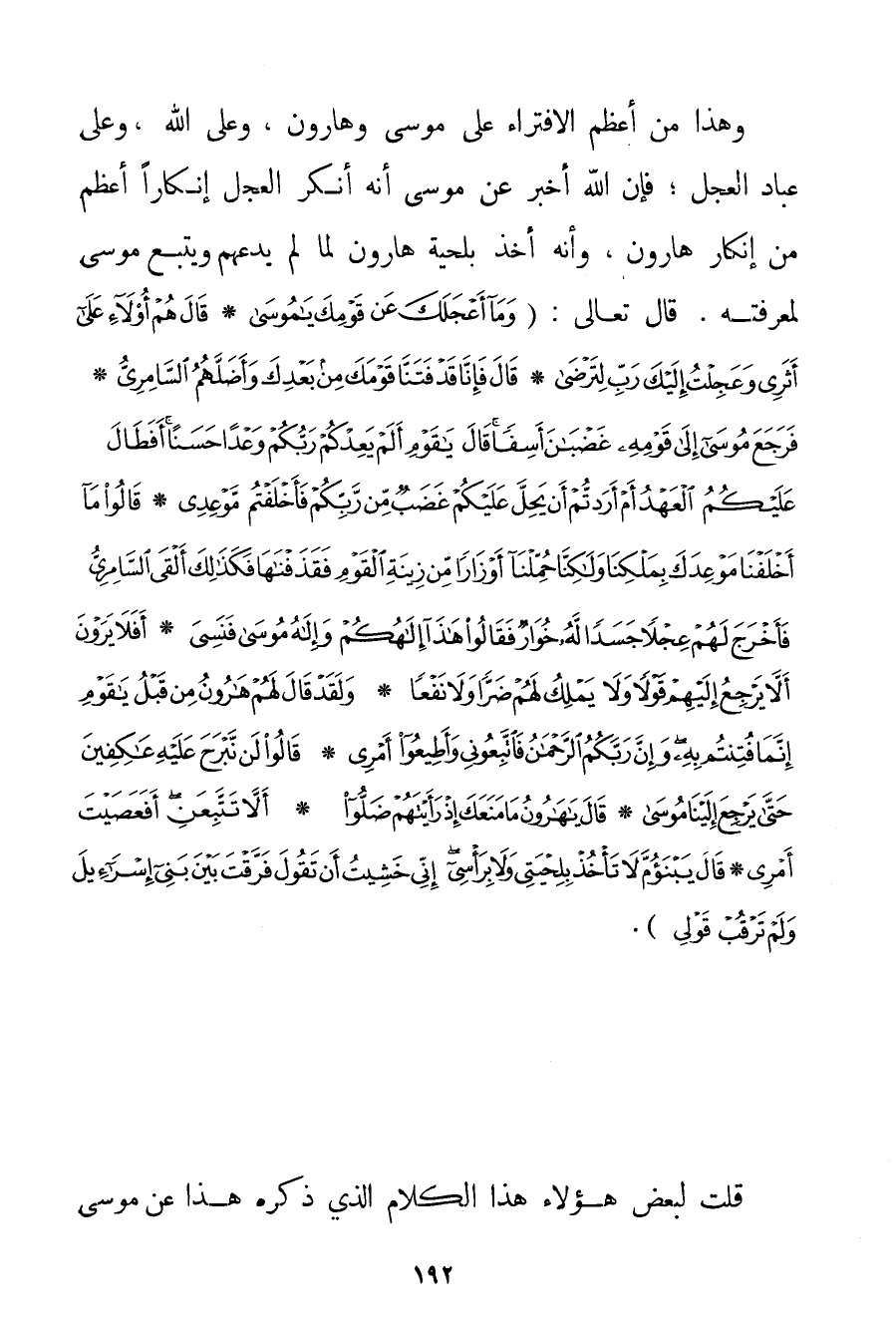 وَهَذَا مِنْ أَعْظَمِ الِافْتِرَاءِ عَلَى مُوسَى وَهَارُونَ وَعَلَى اللَّهِ وَعَلَى عُبَّادِ الْعِجْلِ؛ فَإِنَّ اللَّهَ أَخْبَرَ عَنْ مُوسَى أَنَّهُ أَنْكَرَ الْعِجْلَ إنْكَارًا أَعْظَمَ مِنْ إنْكَارِ هَارُونَ وَأَنَّهُ أَخَذَ بِلِحْيَةِ هَارُونَ لَمَّا لَمْ يَدَعْهُمْ وَيَتَّبِعْ مُوسَى لِمَعْرِفَتِهِ. قَالَ تَعَالَى: {وَمَا أَعْجَلَكَ عَنْ قَوْمِكَ يَا مُوسَى} {قَالَ هُمْ أُولَاءِ عَلَى أَثَرِي وَعَجِلْتُ إلَيْكَ رَبِّ لِتَرْضَى} {قَالَ فَإِنَّا قَدْ فَتَنَّا قَوْمَكَ مِنْ بَعْدِكَ وَأَضَلَّهُمُ السَّامِرِيُّ} {فَرَجَعَ مُوسَى إلَى قَوْمِهِ غَضْبَانَ أَسِفًا قَالَ يَا قَوْمِ أَلَمْ يَعِدْكُمْ رَبُّكُمْ وَعْدًا حَسَنًا أَفَطَالَ عَلَيْكُمُ الْعَهْدُ أَمْ أَرَدْتُمْ أَنْ يَحِلَّ عَلَيْكُمْ غَضَبٌ مِنْ رَبِّكُمْ فَأَخْلَفْتُمْ مَوْعِدِي} {قَالُوا مَا أَخْلَفْنَا مَوْعِدَكَ بِمَلْكِنَا وَلَكِنَّا حُمِّلْنَا أَوْزَارًا مِنْ زِينَةِ الْقَوْمِ فَقَذَفْنَاهَا فَكَذَلِكَ أَلْقَى السَّامِرِيُّ} {فَأَخْرَجَ لَهُمْ عِجْلًا جَسَدًا لَهُ خُوَارٌ فَقَالُوا هَذَا إلَهُكُمْ وَإِلَهُ مُوسَى فَنَسِيَ} {أَفَلَا يَرَوْنَ أَلَّا يَرْجِعُ إلَيْهِمْ قَوْلًا وَلَا يَمْلِكُ لَهُمْ ضَرًّا وَلَا نَفْعًا} {وَلَقَدْ قَالَ لَهُمْ هَارُونُ مِنْ قَبْلُ يَا قَوْمِ إنَّمَا فُتِنْتُمْ بِهِ وَإِنَّ رَبَّكُمُ الرَّحْمَنُ فَاتَّبِعُونِي وَأَطِيعُوا أَمْرِي} {قَالُوا لَنْ نَبْرَحَ عَلَيْهِ عَاكِفِينَ حَتَّى يَرْجِعَ إلَيْنَا مُوسَى} {قَالَ يَا هَارُونُ مَا مَنَعَكَ إذْ رَأَيْتَهُمْ ضَلُّوا} {أَلَّا تَتَّبِعَنِي أَفَعَصَيْتَ أَمْرِي} {قَالَ يَا ابْنَ أُمَّ لَا تَأْخُذْ بِلِحْيَتِي وَلَا بِرَأْسِي إنِّي خَشِيتُ أَنْ تَقُولَ فَرَّقْتَ بَيْنَ بَنِي إسْرَائِيلَ وَلَمْ تَرْقُبْ قَوْلِي} . قُلْت لِبَعْضِ هَؤُلَاءِ: هَذَا الْكَلَامُ الَّذِي ذَكَرَهُ هَذَا عَنْ مُوسَى