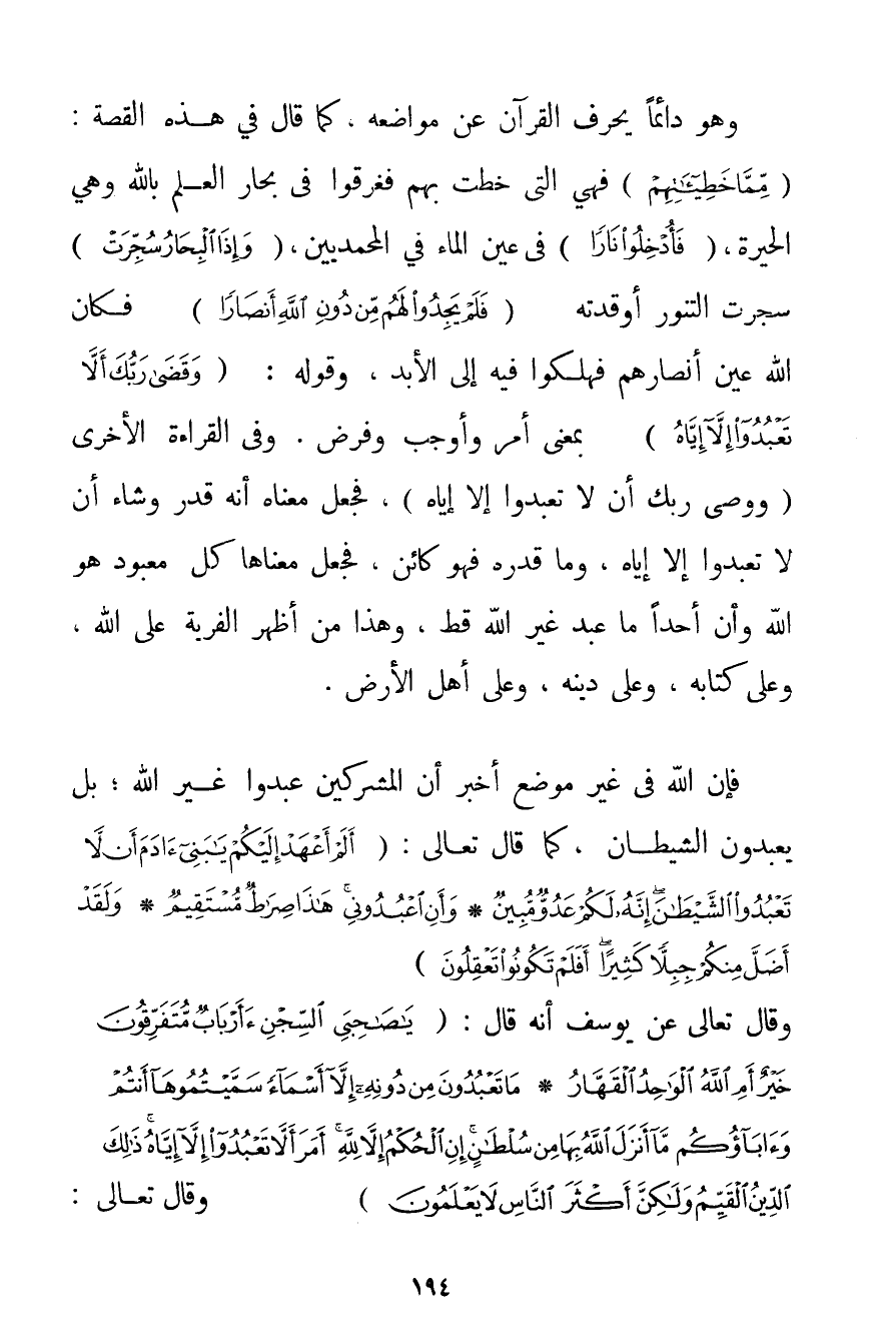 وَهُوَ دَائِمًا يُحَرِّفُ الْقُرْآنَ عَنْ مَوَاضِعِهِ كَمَا قَالَ فِي هَذِهِ الْقِصَّةِ: {مِمَّا خَطِيئَاتِهِمْ} فَهِيَ الَّتِي خَطَتْ بِهِمْ فَغَرِقُوا فِي بِحَارِ الْعِلْمِ بِاَللَّهِ وَهِيَ الْحَيْرَةُ {فَأُدْخِلُوا نَارًا} فِي عَيْنِ الْمَاءِ فِي الْمُحَمَّدِيِّينَ {وَإِذَا الْبِحَارُ سُجِّرَتْ} سَجَرْت التَّنُّورَ أَوْقَدْته {فَلَمْ يَجِدُوا لَهُمْ مِنْ دُونِ اللَّهِ أَنْصَارًا} فَكَانَ اللَّهُ عَيْنَ أَنْصَارِهِمْ فَهَلَكُوا فِيهِ إلَى الْأَبَدِ وَقَوْلُهُ: {وَقَضَى رَبُّكَ أَلَّا تَعْبُدُوا إلَّا إيَّاهُ} بِمَعْنَى أَمَرَ وَأَوْجَبَ وَفَرَضَ. وَفِي الْقِرَاءَةِ الْأُخْرَى (وَوَصَّى رَبُّك أَنْ لَا تَعْبُدُوا إلَّا إيَّاهُ فَجَعَلَ مَعْنَاهُ أَنَّهُ قَدَّرَ وَشَاءَ أَنْ لَا تَعْبُدُوا إلَّا إيَّاهُ وَمَا قَدَرَهُ فَهُوَ كَائِنٌ فَجَعَلَ مَعْنَاهَا كُلُّ مَعْبُودٍ هُوَ اللَّهُ وَأَنَّ أَحَدًا مَا عَبَدَ غَيْرَ اللَّهِ قَطُّ وَهَذَا مِنْ أَظْهَرِ الْفِرْيَةِ عَلَى اللَّهِ وَعَلَى كِتَابِهِ وَعَلَى دِينِهِ وَعَلَى أَهْلِ الْأَرْضِ. فَإِنَّ اللَّهَ فِي غَيْرِ مَوْضِعٍ أَخْبَرَ أَنَّ الْمُشْرِكِينَ عَبَدُوا غَيْرَ اللَّهِ؛ بَلْ يَعْبُدُونَ الشَّيْطَانَ كَمَا قَالَ تَعَالَى: {أَلَمْ أَعْهَدْ إلَيْكُمْ يَا بَنِي آدَمَ أَنْ لَا تَعْبُدُوا الشَّيْطَانَ إنَّهُ لَكُمْ عَدُوٌّ مُبِينٌ} {وَأَنِ اعْبُدُونِي هَذَا صِرَاطٌ مُسْتَقِيمٌ} {وَلَقَدْ أَضَلَّ مِنْكُمْ جِبِلًّا كَثِيرًا أَفَلَمْ تَكُونُوا تَعْقِلُونَ} وَقَالَ تَعَالَى عَنْ يُوسُفَ أَنَّهُ قَالَ: {يَا صَاحِبَيِ السِّجْنِ أَأَرْبَابٌ مُتَفَرِّقُونَ خَيْرٌ أَمِ اللَّهُ الْوَاحِدُ الْقَهَّارُ} {مَا تَعْبُدُونَ مِنْ دُونِهِ إلَّا أَسْمَاءً سَمَّيْتُمُوهَا أَنْتُمْ وَآبَاؤُكُمْ مَا أَنْزَلَ اللَّهُ بِهَا مِنْ سُلْطَانٍ إنِ الْحُكْمُ إلَّا لِلَّهِ أَمَرَ أَلَّا تَعْبُدُوا إلَّا إيَّاهُ ذَلِكَ الدِّينُ الْقَيِّمُ وَلَكِنَّ أَكْثَرَ النَّاسِ لَا يَعْلَمُونَ} وَقَالَ تَعَالَى:
