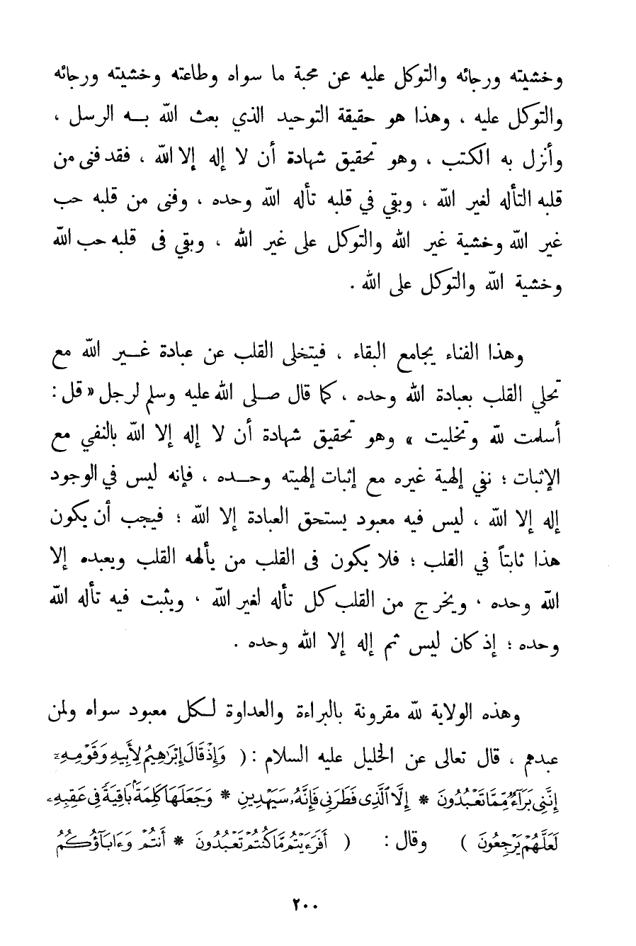 وَخَشْيَتِهِ وَرَجَائِهِ وَالتَّوَكُّلِ عَلَيْهِ عَنْ مَحَبَّةِ مَا سِوَاهُ وَطَاعَتِهِ وَخَشْيَتِهِ وَرَجَائِهِ وَالتَّوَكُّلِ عَلَيْهِ وَهَذَا هُوَ حَقِيقَةِ التَّوْحِيدِ الَّذِي بَعَثَ اللَّهُ بِهِ الرُّسُلَ وَأَنْزَلَ بِهِ الْكُتُبَ وَهُوَ تَحْقِيقُ شَهَادَةِ أَنْ لَا إلَهَ إلَّا اللَّهُ فَقَدْ فَنِيَ مِنْ قَلْبِهِ التَّأَلُّهُ لِغَيْرِ اللَّهِ وَبَقِيَ فِي قَلْبِهِ تَأَلُّهُ اللَّهِ وَحْدَهُ وَفَنِيَ مِنْ قَلْبِهِ حُبُّ غَيْرِ اللَّهِ وَخَشْيَةُ غَيْرِ اللَّهِ وَالتَّوَكُّلُ عَلَى غَيْرِ اللَّهِ وَبَقِيَ فِي قَلْبِهِ حُبُّ اللَّهِ وَخَشْيَةُ اللَّهِ وَالتَّوَكُّلُ عَلَى اللَّهِ. وَهَذَا الْفَنَاءُ يُجَامِعُ الْبَقَاءَ فَيَتَخَلَّى الْقَلْبُ عَنْ عِبَادَةِ غَيْرِ اللَّهِ مَعَ تَحَلِّي الْقَلْبِ بِعِبَادَةِ اللَّهِ وَحْدَهُ كَمَا قَالَ صَلَّى اللَّهُ عَلَيْهِ وَسَلَّمَ لِرَجُلِ {قُلْ: أَسْلَمْت لِلَّهِ وَتَخَلَّيْت} وَهُوَ تَحْقِيقُ شَهَادَةِ أَنْ لَا إلَهَ إلَّا اللَّهُ بِالنَّفْيِ مَعَ الْإِثْبَاتِ؛ نَفْيِ إلَهِيَّةِ غَيْرِهِ مَعَ إثْبَاتِ إلَهِيَّتِهِ وَحْدَهُ فَإِنَّهُ لَيْسَ فِي الْوُجُودِ إلَهٌ إلَّا اللَّهُ لَيْسَ فِيهِ مَعْبُودٌ يَسْتَحِقُّ الْعِبَادَةَ إلَّا اللَّهُ؛ فَيَجِبُ أَنْ يَكُونَ هَذَا ثَابِتًا فِي الْقَلْبِ؛ فَلَا يَكُونُ فِي الْقَلْبِ مَنْ يَأْلَهُهُ الْقَلْبُ وَيَعْبُدُهُ إلَّا اللَّهُ وَحْدَهُ وَيَخْرُجُ مِنْ الْقَلْبِ كُلُّ تَأَلُّهٍ لِغَيْرِ اللَّهِ وَيَثْبُتُ فِيهِ تَأَلُّهُ اللَّهِ وَحْدَهُ؛ إذْ كَانَ لَيْسَ ثَمَّ إلَهٌ إلَّا اللَّهُ وَحْدَهُ. وَهَذِهِ الْوِلَايَةُ لِلَّهِ مَقْرُونَةٌ بِالْبَرَاءَةِ وَالْعَدَاوَةِ لِكُلِّ مَعْبُودٍ سِوَاهُ وَلِمَنْ عَبَدَهُمْ قَالَ تَعَالَى عَنْ الْخَلِيلِ عَلَيْهِ السَّلَامُ {وَإِذْ قَالَ إبْرَاهِيمُ لِأَبِيهِ وَقَوْمِهِ إنَّنِي بَرَاءٌ مِمَّا تَعْبُدُونَ} {إلَّا الَّذِي فَطَرَنِي فَإِنَّهُ سَيَهْدِينِ} {وَجَعَلَهَا كَلِمَةً بَاقِيَةً فِي عَقِبِهِ لَعَلَّهُمْ يَرْجِعُونَ} وَقَالَ: {أَفَرَأَيْتُمْ مَا كُنْتُمْ تَعْبُدُونَ} {أَنْتُمْ وَآبَاؤُكُمُ