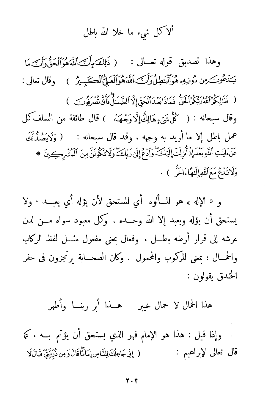 أَلَا كُلُّ شَيْءٍ مَا خَلَا اللَّهَ بَاطِلُ} وَهَذَا تَصْدِيقُ قَوْله تَعَالَى تَعَالَى: {ذَلِكَ بِأَنَّ اللَّهَ هُوَ الْحَقُّ وَأَنَّ مَا يَدْعُونَ مِنْ دُونِهِ هُوَ الْبَاطِلُ وَأَنَّ اللَّهَ هُوَ الْعَلِيُّ الْكَبِيرُ} وَقَالَ تَعَالَى: {فَذَلِكُمُ اللَّهُ رَبُّكُمُ الْحَقُّ فَمَاذَا بَعْدَ الْحَقِّ إلَّا الضَّلَالُ فَأَنَّى تُصْرَفُونَ} وَقَالَ سُبْحَانَهُ: {كُلُّ شَيْءٍ هَالِكٌ إلَّا وَجْهَهُ} قَالَ طَائِفَةٌ مِنْ السَّلَفِ كُلُّ عَمَلٍ بَاطِلٌ إلَّا مَا أُرِيدَ بِهِ وَجْهُهُ وَقَدْ قَالَ سُبْحَانَهُ: {وَلَا يَصُدُّنَّكَ عَنْ آيَاتِ اللَّهِ بَعْدَ إذْ أُنْزِلَتْ إلَيْكَ وَادْعُ إلَى رَبِّكَ وَلَا تَكُونَنَّ مِنَ الْمُشْرِكِينَ} {وَلَا تَدْعُ مَعَ اللَّهِ إلَهًا آخَرَ} .