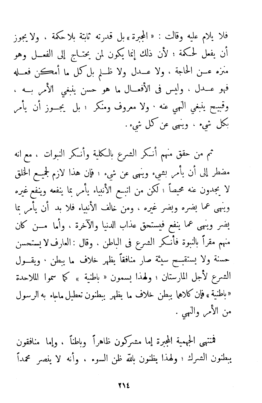 فَلَا يُلَامُ عَلَيْهِ وَقَالَتْ: " الْمُجَبِّرَةُ " بَلْ قُدْرَتُهُ ثَابِتَةٌ بِلَا حِكْمَةٍ وَلَا يَجُوزُ أَنْ يَفْعَلَ لِحِكْمَةِ؛ لِأَنَّ ذَلِكَ إنَّمَا يَكُونُ لِمَنْ يَحْتَاجُ إلَى الْفِعْلِ وَهُوَ مُنَزَّهٌ عَنْ الْحَاجَةِ وَلَا عَدْلَ وَلَا ظُلْمَ بَلْ كُلُّ مَا أَمْكَنَ فِعْلُهُ فَهُوَ عَدْلٌ وَلَيْسَ فِي الْأَفْعَالِ مَا هُوَ حَسَنٌ يَنْبَغِي الْأَمْرُ بِهِ وَقَبِيحٌ يَنْبَغِي النَّهْيُ عَنْهُ وَلَا مَعْرُوفَ وَمُنْكَرَ؛ بَلْ يَجُوزُ أَنْ يَأْمُرَ بِكُلِّ شَيْءٍ وَيَنْهَى عَنْ كُلِّ شَيْءٍ. ثُمَّ مَنْ حَقَّقَ مِنْهُمْ أَنْكَرَ الشَّرْعَ بِالْكُلِّيَّةِ وَأَنْكَرَ النُّبُوَّاتِ مَعَ أَنَّهُ مُضْطَرٌّ إلَى أَنْ يَأْمُرَ بِشَيْءِ وَيَنْهَى عَنْ شَيْءٍ؛ فَإِنَّ هَذَا لَازِمٌ لِجَمِيعِ الْخَلْقِ لَا يَجِدُونَ عَنْهُ مَحِيصًا؛ لَكِنْ مَنْ اتَّبَعَ الْأَنْبِيَاءَ يَأْمُرُ بِمَا يَنْفَعُهُ وَيَنْفَعُ غَيْرَهُ وَيَنْهَى عَمَّا يَضُرُّهُ وَيَضُرُّ غَيْرَهُ وَمَنْ خَالَفَ الْأَنْبِيَاءَ فَلَا بُدَّ أَنْ يَأْمُرَ بِمَا يَضُرُّ وَيَنْهَى عَمَّا يَنْفَعُ فَيَسْتَحِقُّ عَذَابَ الدُّنْيَا وَالْآخِرَةِ وَأَمَّا مَنْ كَانَ مِنْهُمْ مُقِرًّا بِالنُّبُوَّةِ فَأَنْكَرَ الشَّرْعَ فِي الْبَاطِنِ وَقَالَ: الْعَارِفُ لَا يَسْتَحْسِنُ حَسَنَةً وَلَا يَسْتَقْبِحُ سَيِّئَةً صَارَ مُنَافِقًا يُظْهِرُ خِلَافَ مَا يُبْطِنُ وَيَقُولُ الشَّرْعُ لِأَجْلِ الْمَارَسْتَانِ؛ وَلِهَذَا يُسَمَّوْنَ " بَاطِنِيَّةً " كَمَا سَمَّوْا الْمَلَاحِدَةَ " بَاطِنِيَّةً " فَإِنَّ كِلَاهُمَا يُبْطِنُ خِلَافَ مَا يُظْهِرُ يُبْطِنُونَ تَعْطِيلَ مَا جَاءَ بِهِ الرَّسُولُ مِنْ الْأَمْرِ وَالنَّهْيِ. فَمُنْتَهَى الْجَهْمِيَّة الْمُجَبِّرَةِ إمَّا مُشْرِكُونَ ظَاهِرًا وَبَاطِنًا وَإِمَّا مُنَافِقُونَ يُبْطِنُونَ الشِّرْكَ؛ وَلِهَذَا يَظُنُّونَ بِاَللَّهِ ظَنَّ السَّوْءِ وَأَنَّهُ لَا يَنْصُرُ مُحَمَّدًا