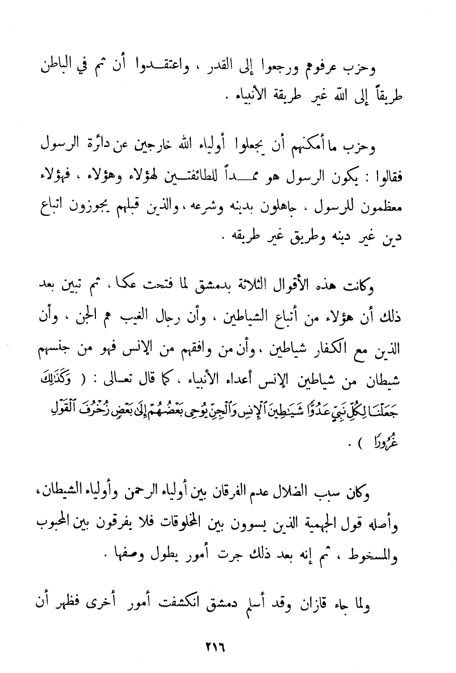 وَحِزْبٌ عَرَفُوهُمْ وَرَجَعُوا إلَى الْقَدَرِ وَاعْتَقَدُوا أَنَّ ثَمَّ فِي الْبَاطِنِ طَرِيقًا إلَى اللَّهِ غَيْرَ طَرِيقَةِ الْأَنْبِيَاءِ. وَحِزْبٌ مَا أَمْكَنَهُمْ أَنْ يَجْعَلُوا أَوْلِيَاءَ اللَّهِ خَارِجِينَ عَنْ دَائِرَةِ الرَّسُولِ فَقَالُوا: يَكُونُ الرَّسُولُ هُوَ مُمِدًّا لِلطَّائِفَتَيْنِ لِهَؤُلَاءِ وَهَؤُلَاءِ فَهَؤُلَاءِ مُعَظِّمُونَ لِلرَّسُولِ جَاهِلُونَ بِدِينِهِ وَشَرْعِهِ وَاَلَّذِينَ قَبْلَهُمْ يُجَوِّزُونَ اتِّبَاعَ دِينٍ غَيْرِ دِينِهِ وَطَرِيقٍ غَيْرِ طَرِيقِهِ. وَكَانَتْ هَذِهِ الْأَقْوَالُ الثَّلَاثَةُ بِدِمَشْقَ لَمَّا فُتِحَتْ عَكَّا ثُمَّ تَبَيَّنَ بَعْدَ ذَلِكَ أَنَّ هَؤُلَاءِ مِنْ أَتْبَاعِ الشَّيَاطِينِ وَأَنَّ رِجَالَ الْغَيْبِ هُمْ الْجِنُّ وَأَنَّ الَّذِينَ مَعَ الْكُفَّارِ شَيَاطِينُ وَأَنَّ مَنْ وَافَقَهُمْ مِنْ الْإِنْسِ فَهُوَ مِنْ جِنْسِهِمْ شَيْطَانٌ مِنْ شَيَاطِينِ الْإِنْسِ أَعْدَاءِ الْأَنْبِيَاءِ كَمَا قَالَ تَعَالَى: {وَكَذَلِكَ جَعَلْنَا لِكُلِّ نَبِيٍّ عَدُوًّا شَيَاطِينَ الْإِنْسِ وَالْجِنِّ يُوحِي بَعْضُهُمْ إلَى بَعْضٍ زُخْرُفَ الْقَوْلِ غُرُورًا} . وَكَانَ سَبَبُ الضَّلَالِ عَدَمَ الْفُرْقَانِ بَيْنَ أَوْلِيَاءِ الرَّحْمَنِ وَأَوْلِيَاءِ الشَّيْطَانِ وَأَصْلُهُ قَوْلُ الْجَهْمِيَّة الَّذِينَ يُسَوُّونَ بَيْنَ الْمَخْلُوقَاتِ فَلَا يُفَرِّقُونَ بَيْنَ الْمَحْبُوبِ وَالْمَسْخُوطِ ثُمَّ إنَّهُ بَعْدَ ذَلِكَ جَرَتْ أُمُورٌ يَطُولُ وَصْفُهَا. وَلَمَّا جَاءَ قازان وَقَدْ أَسْلَمَ دِمَشْقُ انْكَشَفَتْ أُمُورٌ أُخْرَى فَظَهَرَ أَنَّ