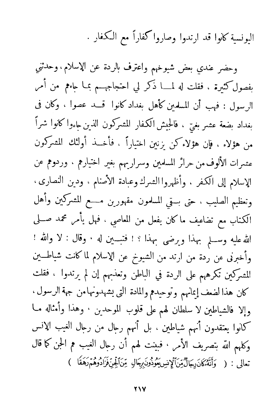 اليونسية كَانُوا قَدْ ارْتَدُّوا وَصَارُوا كُفَّارًا مَعَ الْكُفَّارِ. وَحَضَرَ عِنْدِي بَعْضُ شُيُوخِهِمْ وَاعْتَرَفَ بِالرِّدَّةِ عَنْ الْإِسْلَامِ وَحَدَّثَنِي بِفُصُولِ كَثِيرَةٍ فَقُلْت لَهُ لَمَّا ذَكَرَ لِي احْتِجَاجَهُمْ بِمَا جَاءَهُمْ مِنْ أَمْرِ الرَّسُولِ: فَهَبْ أَنَّ الْمُسْلِمِينَ كَأَهْلِ بَغْدَادَ كَانُوا قَدْ عَصَوْا وَكَانَ فِي بَغْدَادَ بِضْعَةَ عَشَرَ بَغِيًّا فَالْجَيْشُ الْكُفَّارُ الْمُشْرِكُونَ الَّذِينَ جَاءُوا كَانُوا شَرًّا مِنْ هَؤُلَاءِ فَإِنَّ هَؤُلَاءِ كُنَّ يَزْنِينَ اخْتِيَارًا فَأَخَذَ أُولَئِكَ الْمُشْرِكُونَ عَشَرَاتِ الْأُلُوفِ مِنْ حَرَائِرِ الْمُسْلِمِينَ وَسَرَارِيهِمْ بِغَيْرِ اخْتِيَارِهِمْ وَرَدُّوهُمْ عَنْ الْإِسْلَامِ إلَى الْكُفْرِ وَأَظْهَرُوا الشِّرْكَ وَعِبَادَةَ الْأَصْنَامِ وَدِينَ النَّصَارَى وَتَعْظِيمَ الصَّلِيبِ حَتَّى بَقِيَ الْمُسْلِمُونَ مَقْهُورِينَ مَعَ الْمُشْرِكِينَ وَأَهْلِ الْكِتَابِ مَعَ تَضَاعِيفِ مَا كَانَ يَفْعَلُ مِنْ الْمَعَاصِي فَهَلْ يَأْمُرُ مُحَمَّدٌ صَلَّى اللَّهُ عَلَيْهِ وَسَلَّمَ بِهَذَا وَيَرْضَى بِهَذَا فَتَبَيَّنَ لَهُ وَقَالَ: لَا وَاَللَّهِ وَأَخْبَرَنِي عَنْ رِدَّةِ مَنْ ارْتَدَّ مِنْ الشُّيُوخِ عَنْ الْإِسْلَامِ لَمَّا كَانَتْ شَيَاطِينُ الْمُشْرِكِينَ تُكْرِهُهُمْ عَلَى الرِّدَّةِ فِي الْبَاطِنِ وَتُعَذِّبُهُمْ إنْ لَمْ يَرْتَدُّوا فَقُلْت كَانَ هَذَا لِضَعْفِ إيمَانِهِمْ وَتَوْحِيدِهِمْ وَالْمَادَّةِ الَّتِي يَشْهَدُونَهَا مِنْ جِهَةِ الرَّسُولِ وَإِلَّا فَالشَّيَاطِينُ لَا سُلْطَانَ لَهُمْ عَلَى قُلُوبِ الْمُوَحِّدِينَ وَهَذَا وَأَمْثَالُهُ مَا كَانُوا يَعْتَقِدُونَ أَنَّهُمْ شَيَاطِينُ بَلْ أَنَّهُمْ رِجَالٌ مِنْ رِجَالِ الْغَيْبِ الْإِنْسِ وَكَّلَهُمْ اللَّهُ بِتَصْرِيفِ الْأَمْرِ فَبَيَّنْت لَهُمْ أَنَّ رِجَالَ الْغَيْبِ هُمْ الْجِنُّ كَمَا قَالَ تَعَالَى: {وَأَنَّهُ كَانَ رِجَالٌ مِنَ الْإِنْسِ يَعُوذُونَ بِرِجَالٍ مِنَ الْجِنِّ فَزَادُوهُمْ
