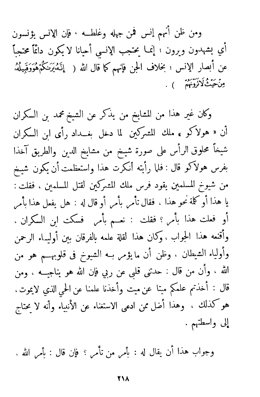 رَهَقًا} وَمَنْ ظَنَّ أَنَّهُمْ إنْسٌ فَمِنْ جَهْلِهِ وَغَلَطِهِ فَإِنَّ الْإِنْسَ يُؤْنِسُونَ أَيْ يَشْهَدُونَ وَيَرَوْنَ؛ إنَّمَا يَحْتَجِبُ الْإِنْسِيُّ أَحْيَانًا لَا يَكُونُ دَائِمًا مُحْتَجِبًا عَنْ أَبْصَارِ الْإِنْسِ؛ بِخِلَافِ الْجِنِّ فَإِنَّهُمْ كَمَا قَالَ اللَّهُ {إنَّهُ يَرَاكُمْ هُوَ وَقَبِيلُهُ مِنْ حَيْثُ لَا تَرَوْنَهُمْ} . وَكَانَ غَيْرَ هَذَا مِنْ الْمَشَايِخِ مَنْ يَذْكُرُ عَنْ الشَّيْخِ مُحَمَّدِ بْنِ السَّكْرَانِ أَنَّ " هُولَاكُو " مَلِكَ الْمُشْرِكِينَ لَمَّا دَخَلَ بَغْدَادَ رَأَى ابْنَ السَّكْرَانِ شَيْخًا مَحْلُوقَ الرَّأْسِ عَلَى صُورَةِ شَيْخٍ مِنْ مَشَايِخِ الدِّينِ وَالطَّرِيقِ آخِذًا بِفَرَسِ هُولَاكُو قَالَ: فَلَمَّا رَأَيْته أَنْكَرْت هَذَا وَاسْتَعْظَمْت أَنْ يَكُونَ شَيْخٌ مِنْ شُيُوخِ الْمُسْلِمِينَ يَقُودُ فَرَسَ مَلِكِ الْمُشْرِكِينَ لِقَتْلِ الْمُسْلِمِينَ فَقُلْت: يَا هَذَا أَوْ كَلِمَةٌ نَحْوُ هَذَا فَقَالَ تَأْمُرُ بِأَمْرِ أَوْ قَالَ لَهُ: هَلْ يَفْعَلُ هَذَا بِأَمْرِ أَوْ فَعَلْت هَذَا بِأَمْرِ؟ فَقُلْت: نَعَمْ بِأَمْرِ فَسَكَتَ ابْنُ السَّكْرَانِ وَأَقْنَعَهُ هَذَا الْجَوَابُ وَكَانَ هَذَا لِقِلَّةِ عِلْمِهِ بِالْفُرْقَانِ بَيْنَ أَوْلِيَاءِ الرَّحْمَنِ وَأَوْلِيَاءِ الشَّيْطَانِ وَظَنَّ أَنَّ مَا يُؤْمَرُ بِهِ الشُّيُوخُ فِي قُلُوبِهِمْ هُوَ مِنْ اللَّهِ وَأَنَّ مَنْ قَالَ: حَدَّثَنِي قَلْبِي عَنْ رَبِّي فَإِنَّ اللَّهَ هُوَ يُنَاجِيهِ وَمَنْ قَالَ: أَخَذْتُمْ عِلْمَكُمْ مَيِّتًا عَنْ مَيِّتٍ وَأَخَذْنَا عِلْمَنَا عَنْ الْحَيِّ الَّذِي لَا يَمُوتُ هُوَ كَذَلِكَ وَهَذَا أَضَلُّ مِمَّنْ ادَّعَى الِاسْتِغْنَاءَ عَنْ الْأَنْبِيَاءِ وَأَنَّهُ لَا يَحْتَاجُ إلَى وَاسِطَتِهِمْ. وَجَوَابُ هَذَا أَنْ يُقَالَ لَهُ: بِأَمْرِ مَنْ تَأْمُرُ؟ فَإِنْ قَالَ: بِأَمْرِ اللَّهِ