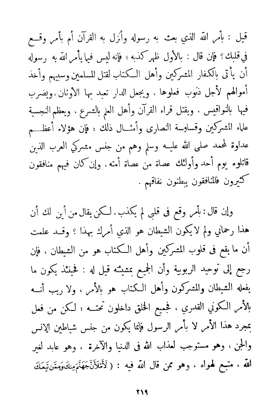 قِيلَ: بِأَمْرِ اللَّهِ الَّذِي بَعَثَ بِهِ رَسُولَهُ وَأَنْزَلَ بِهِ الْقُرْآنَ أَمْ بِأَمْرِ وَقَعَ فِي قَلْبِك؟ فَإِنْ قَالَ: بِالْأَوَّلِ ظَهَرَ كَذِبُهُ؛ فَإِنَّهُ لَيْسَ فِيمَا يَأْمُرُ اللَّهُ بِهِ رَسُولَهُ أَنْ يَأْتِيَ بِالْكُفَّارِ الْمُشْرِكِينَ وَأَهْلِ الْكِتَابِ لِقَتْلِ الْمُسْلِمِينَ وَسَبْيِهِمْ وَأَخْذِ أَمْوَالِهِمْ لِأَجْلِ ذُنُوبٍ فَعَلُوهَا وَيَجْعَلَ الدَّارَ تُعْبَدُ بِهَا الْأَوْثَانُ وَيُضْرَبُ فِيهَا بِالنَّوَاقِيسِ وَيُقْتَلُ قُرَّاءُ الْقُرْآنِ وَأَهْلُ الْعِلْمِ بِالشَّرْعِ وَيُعَظَّمُ النجسية عُلَمَاءُ الْمُشْرِكِينَ وَقَسَاوِسَةُ النَّصَارَى وَأَمْثَالُ ذَلِكَ؛ فَإِنَّ هَؤُلَاءِ أَعْظَمُ عَدَاوَةً لِمُحَمَّدِ صَلَّى اللَّهُ عَلَيْهِ وَسَلَّمَ وَهُمْ مِنْ جِنْسِ مُشْرِكِي الْعَرَبِ الَّذِينَ قَاتَلُوهُ يَوْمَ أُحُدٍ وَأُولَئِكَ عُصَاةٌ مِنْ عُصَاةِ أُمَّتِهِ وَإِنْ كَانَ فِيهِمْ مُنَافِقُونَ كَثِيرُونَ فَالْمُنَافِقُونَ يُبْطِنُونَ نِفَاقَهُمْ. وَإِنْ قَالَ: بِأَمْرِ وَقَعَ فِي قَلْبِي لَمْ يَكْذِبْ لَكِنْ يُقَالُ مِنْ أَيْنَ لَك أَنَّ هَذَا رَحْمَانِيٌّ وَلِمَ لَا يَكُونُ الشَّيْطَانُ هُوَ الَّذِي أَمَرَك بِهَذَا؟ وَقَدْ عَلِمْت أَنَّ مَا يَقَعُ فِي قُلُوبِ الْمُشْرِكِينَ وَأَهْلِ الْكِتَابِ هُوَ مِنْ الشَّيْطَانِ فَإِنْ رَجَعَ إلَى تَوْحِيدِ الرُّبُوبِيَّةِ وَأَنَّ الْجَمِيعَ بِمَشِيئَتِهِ قِيلَ لَهُ: فَحِينَئِذٍ يَكُونُ مَا يَفْعَلُهُ الشَّيْطَانُ وَالْمُشْرِكُونَ وَأَهْلُ الْكِتَابِ هُوَ بِالْأَمْرِ وَلَا رَيْبَ أَنَّهُ بِالْأَمْرِ الْكَوْنِيِّ الْقَدَرِيِّ فَجَمِيعُ الْخَلْقِ دَاخِلُونَ تَحْتَهُ؛ لَكِنْ مَنْ فَعَلَ بِمُجَرَّدِ هَذَا الْأَمْرِ لَا بِأَمْرِ الرَّسُولِ فَإِنَّمَا يَكُونُ مِنْ جِنْسِ شَيَاطِينِ الْإِنْسِ وَالْجِنِّ وَهُوَ مُسْتَوْجِبٌ لِعَذَابِ اللَّهِ فِي الدُّنْيَا وَالْآخِرَةِ وَهُوَ عَابِدٌ لِغَيْرِ اللَّهِ مُتَّبِعٌ لِهَوَاهُ وَهُوَ مِمَّنْ قَالَ اللَّهُ فِيهِ: {لَأَمْلَأَنَّ جَهَنَّمَ مِنْكَ وَمِمَّنْ