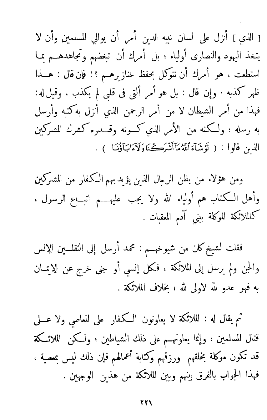 الَّذِي أَنْزَلَ عَلَى لِسَانِ نَبِيِّهِ الدِّينَ أَمَرَ أَنْ يُوَالِيَ الْمُسْلِمِينَ وَأَنْ لَا يَتَّخِذَ الْيَهُودَ وَالنَّصَارَى أَوْلِيَاءَ؛ بَلْ أَمَرَك أَنْ تُبْغِضَهُمْ وَتُجَاهِدَهُمْ بِمَا اسْتَطَعْت هُوَ أَمَرَك أَنْ تَتَوَكَّلَ بِحِفْظِ خَنَازِيرِهِمْ فَإِنْ قَالَ: هَذَا ظَهَرَ كَذِبُهُ وَإِنْ قَالَ: بَلْ هُوَ أَمْرٌ أُلْقِيَ فِي قَلْبِي لَمْ يَكْذِبْ وَقِيلَ لَهُ: فَهَذَا مِنْ أَمْرِ الشَّيْطَانِ لَا مِنْ أَمْرِ الرَّحْمَنِ الَّذِي أَنْزَلَ بِهِ كُتُبَهُ وَأَرْسَلَ بِهِ رُسُلَهُ؛ وَلَكِنَّهُ مِنْ الْأَمْرِ الَّذِي كَوَّنَهُ وَقَدَّرَهُ كَشِرْكِ الْمُشْرِكِينَ الَّذِينَ قَالُوا: {لَوْ شَاءَ اللَّهُ مَا أَشْرَكْنَا وَلَا آبَاؤُنَا} . وَمِنْ هَؤُلَاءِ مَنْ يَظُنُّ الرِّجَالَ الَّذِينَ يُؤَيَّدُ بِهِمْ الْكُفَّارُ مِنْ الْمُشْرِكِينَ وَأَهْلِ الْكِتَابِ هُمْ أَوْلِيَاءُ اللَّهِ وَلَا يَجِبُ عَلَيْهِمْ اتِّبَاعُ الرَّسُولِ كَالْمَلَائِكَةِ الْمُوَكَّلَةِ بِبَنِي آدَمَ الْمُعَقِّبَاتِ. فَقُلْت لِشَيْخِ كَانَ مِنْ شُيُوخِهِمْ: مُحَمَّدٌ أُرْسِلَ إلَى الثَّقَلَيْنِ الْإِنْسِ وَالْجِنِّ وَلَمْ يُرْسَلْ إلَى الْمَلَائِكَةِ فَكُلُّ إنْسِيٍّ أَوْ جِنِّيٍّ خَرَجَ عَنْ الْإِيمَانِ بِهِ فَهُوَ عَدُوٌّ لِلَّهِ لَا وَلِيٌّ لِلَّهِ؛ بِخِلَافِ الْمَلَائِكَةِ. ثُمَّ يُقَالُ لَهُ: الْمَلَائِكَةُ لَا يُعَاوِنُونَ الْكُفَّارَ عَلَى الْمَعَاصِي وَلَا عَلَى قِتَالِ الْمُسْلِمِينَ؛ وَإِنَّمَا يُعَاوِنُهُمْ عَلَى ذَلِكَ الشَّيَاطِينُ؛ وَلَكِنَّ الْمَلَائِكَةَ قَدْ تَكُونُ مُوَكَّلَةً بِخَلْقِهِمْ وَرِزْقِهِمْ وَكِتَابَةِ أَعْمَالِهِمْ فَإِنَّ ذَلِكَ لَيْسَ بِمَعْصِيَةِ فَهَذَا الْجَوَابُ بِالْفَرْقِ بَيْنَهُمْ وَبَيْنَ الْمَلَائِكَةِ مِنْ هَذَيْنِ الْوَجْهَيْنِ.