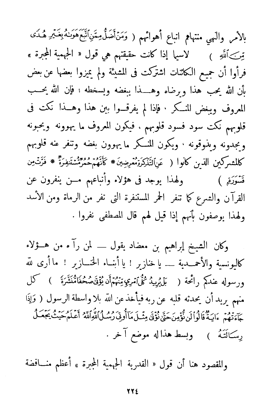 بِالْأَمْرِ وَالنَّهْيِ مُنْتَهَاهُمْ اتِّبَاعُ أَهْوَائِهِمْ {وَمَنْ أَضَلُّ مِمَّنَ اتَّبَعَ هَوَاهُ بِغَيْرِ هُدًى مِنَ اللَّهِ} لَا سِيَّمَا إذَا كَانَتْ حَقِيقَتُهُمْ هِيَ قَوْلَ " الْجَهْمِيَّة الْمُجَبِّرَةِ " فَرَأَوْا أَنَّ جَمِيعَ الْكَائِنَاتِ اشْتَرَكَتْ فِي الْمَشِيئَةِ وَلَمْ يُمَيِّزُوا بَعْضَهَا عَنْ بَعْضٍ بِأَنَّ اللَّهَ يُحِبُّ هَذَا وَيَرْضَاهُ وَهَذَا يُبْغِضُهُ وَيُسْخِطُهُ؛ فَإِنَّ اللَّهَ يُحِبُّ الْمَعْرُوفَ وَيُبْغِضُ الْمُنْكَرَ فَإِذَا لَمْ يُفَرِّقُوا بَيْنَ هَذَا وَهَذَا نُكِتَ فِي قُلُوبِهِمْ نُكَتٌ سُودٌ فَسُوِّدَ قُلُوبُهُمْ فَيَكُونُ الْمَعْرُوفُ مَا يَهْوَوْنَهُ وَيُحِبُّونَهُ وَيَجِدُونَهُ وَيَذُوقُونَهُ وَيَكُونُ الْمُنْكَرُ مَا يَهْوَوْنَ بُغْضَهُ وَتَنْفِرُ عَنْهُ قُلُوبُهُمْ كَالْمُشْرِكِينَ الَّذِينَ كَانُوا {عَنِ التَّذْكِرَةِ مُعْرِضِينَ} {كَأَنَّهُمْ حُمُرٌ مُسْتَنْفِرَةٌ} {فَرَّتْ مِنْ قَسْوَرَةٍ} وَلِهَذَا يُوجَدُ فِي هَؤُلَاءِ وَأَتْبَاعِهِمْ مَنْ يَنْفِرُونَ عَنْ الْقُرْآنِ وَالشَّرْعِ كَمَا تَنْفِرُ الْحُمُرُ الْمُسْتَنْفِرَةُ الَّتِي تَفِرُّ مِنْ الرُّمَاةِ وَمِنْ الْأَسَدِ وَلِهَذَا يُوصَفُونَ بِأَنَّهُمْ إذَا قِيلَ لَهُمْ قَالَ الْمُصْطَفَى نَفَرُوا. وَكَانَ الشَّيْخُ إبْرَاهِيمُ بْنُ مِعْضَادٍ يَقُولُ - لِمَنْ رَآهُ مِنْ هَؤُلَاءِ كاليونسية وَالْأَحْمَدِيَّةِ - يَا خَنَازِيرُ يَا أَبْنَاءَ الْخَنَازِيرِ مَا أَرَى لِلَّهِ وَرَسُولِهِ عِنْدَكُمْ رَائِحَةً {بَلْ يُرِيدُ كُلُّ امْرِئٍ مِنْهُمْ أَنْ يُؤْتَى صُحُفًا مُنَشَّرَةً} كُلٌّ مِنْهُمْ يُرِيدُ أَنْ يُحَدِّثَهُ قَلْبُهُ عَنْ رَبِّهِ فَيَأْخُذُ عَنْ اللَّهِ بِلَا وَاسِطَةِ الرَّسُولِ {وَإِذَا جَاءَتْهُمْ آيَةٌ قَالُوا لَنْ نُؤْمِنَ حَتَّى نُؤْتَى مِثْلَ مَا أُوتِيَ رُسُلُ اللَّهِ اللَّهُ أَعْلَمُ حَيْثُ يَجْعَلُ رِسَالَتَهُ} وَبَسْطُ هَذَا لَهُ مَوْضِعٌ آخَرُ.