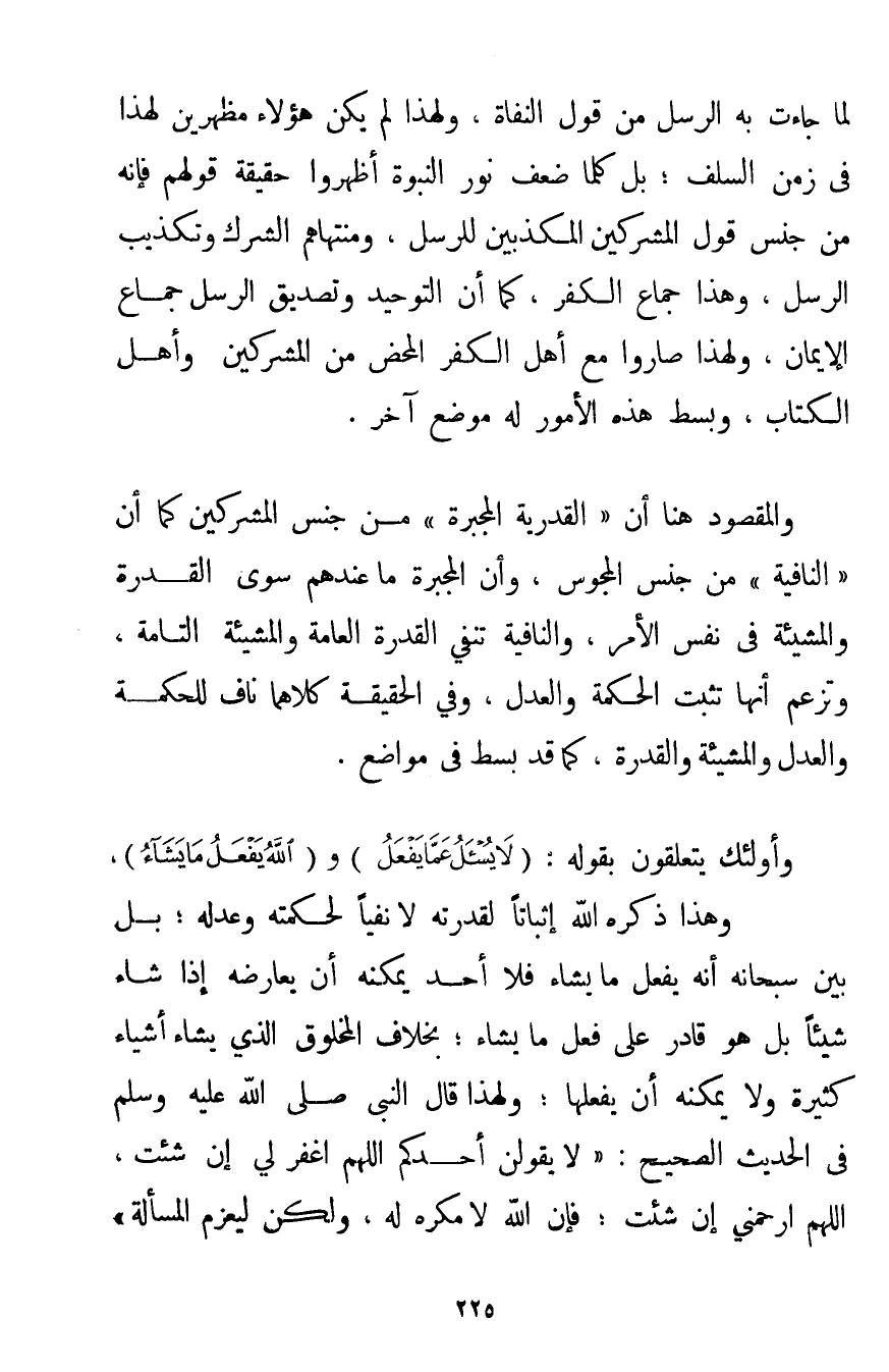 لِمَا جَاءَتْ بِهِ الرُّسُلُ مِنْ قَوْلِ الْنُّفَاةِ وَلِهَذَا لَمْ يَكُنْ هَؤُلَاءِ مُظْهِرِينَ لِهَذَا فِي زَمَنِ السَّلَفِ؛ بَلْ كُلَّمَا ضَعُفَ نُورُ النُّبُوَّةِ أَظْهَرُوا حَقِيقَةَ قَوْلِهِمْ فَإِنَّهُ مِنْ جِنْسِ قَوْلِ الْمُشْرِكِينَ الْمُكَذِّبِينَ لِلرُّسُلِ وَمُنْتَهَاهُمْ الشِّرْكُ وَتَكْذِيبُ الرُّسُلِ وَهَذَا جِمَاعُ الْكُفْرِ كَمَا أَنَّ التَّوْحِيدَ وَتَصْدِيقَ الرُّسُلِ جِمَاعُ الْإِيمَانِ وَلِهَذَا صَارُوا مَعَ أَهْلِ الْكُفْرِ الْمَحْضِ مِنْ الْمُشْرِكِينَ وَأَهْلِ الْكِتَابِ وَبَسْطُ هَذِهِ الْأُمُورِ لَهُ مَوْضِعٌ آخَرُ. وَالْمَقْصُودُ هُنَا أَنَّ " الْقَدَرِيَّةَ الْمُجَبِّرَةَ " مِنْ جِنْسِ الْمُشْرِكِينَ كَمَا أَنَّ " النَّافِيَةَ " مِنْ جِنْسِ الْمَجُوسِ وَأَنَّ الْمُجَبِّرَةَ مَا عِنْدَهُمْ سِوَى الْقُدْرَةِ وَالْمَشِيئَةِ فِي نَفْسِ الْأَمْرِ وَالنَّافِيَةُ تَنْفِي الْقُدْرَةَ الْعَامَّةَ وَالْمَشِيئَةَ التَّامَّةَ وَتَزْعُمُ أَنَّهَا تُثْبِتُ الْحِكْمَةَ وَالْعَدْلَ وَفِي الْحَقِيقَةِ كِلَاهُمَا نَافٍ لِلْحِكْمَةِ وَالْعَدْلِ وَالْمَشِيئَةِ وَالْقُدْرَةِ كَمَا قَدْ بُسِطَ فِي مَوَاضِعَ. وَأُولَئِكَ يَتَعَلَّقُونَ بِقَوْلِهِ: {لَا يُسْأَلُ عَمَّا يَفْعَلُ} و {اللَّهُ يَفْعَلُ مَا يَشَاءُ} وَهَذَا ذَكَرَهُ اللَّهُ إثْبَاتًا لِقُدْرَتِهِ لَا نَفْيًا لِحِكْمَتِهِ وَعَدْلِهِ؛ بَلْ بَيَّنَ سُبْحَانَهُ أَنَّهُ يَفْعَلُ مَا يَشَاءُ فَلَا أَحَدَ يُمْكِنُهُ أَنْ يُعَارِضَهُ إذَا شَاءَ شَيْئًا بَلْ هُوَ قَادِرٌ عَلَى فِعْلِ مَا يَشَاءُ؛ بِخِلَافِ الْمَخْلُوقِ الَّذِي يَشَاءُ أَشْيَاءَ كَثِيرَةً وَلَا يُمْكِنُهُ أَنْ يَفْعَلَهَا؛ وَلِهَذَا قَالَ النَّبِيُّ صَلَّى اللَّهُ عَلَيْهِ وَسَلَّمَ فِي الْحَدِيثِ الصَّحِيحِ: {لَا يَقُولَن أَحَدُكُمْ اللَّهُمَّ اغْفِرْ لِي إنْ شِئْت اللَّهُمَّ ارْحَمْنِي إنْ شِئْت؛ فَإِنَّ اللَّهَ لَا مُكْرِهَ لَهُ وَلَكِنْ لِيَعْزِمْ الْمَسْأَلَةَ}