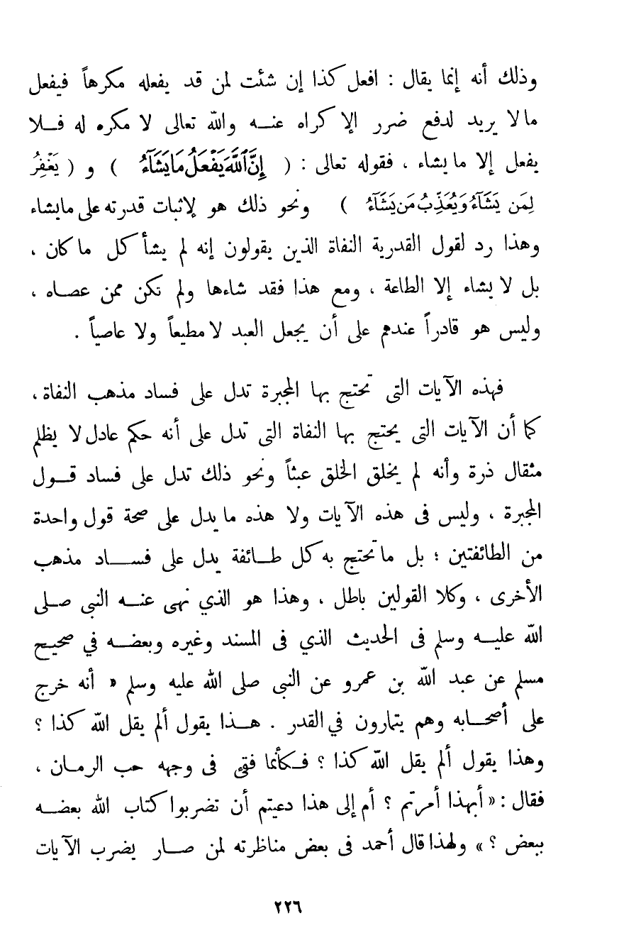وَذَلِكَ أَنَّهُ إنَّمَا يُقَالُ: افْعَلْ كَذَا إنْ شِئْت لِمَنْ قَدْ يَفْعَلُهُ مُكْرَهًا فَيَفْعَلُ مَا لَا يُرِيدُ لِدَفْعِ ضَرَرِ الْإِكْرَاهِ عَنْهُ وَاَللَّهُ تَعَالَى لَا مُكْرِهَ لَهُ فَلَا يَفْعَلُ إلَّا مَا يَشَاءُ فَقَوْلُهُ تَعَالَى: {إنَّ اللَّهَ يَفْعَلُ مَا يَشَاءُ} و {يَغْفِرُ لِمَنْ يَشَاءُ وَيُعَذِّبُ مَنْ يَشَاءُ} وَنَحْوُ ذَلِكَ هُوَ لِإِثْبَاتِ قُدْرَتِهِ عَلَى مَا يَشَاءُ وَهَذَا رَدٌّ لِقَوْلِ الْقَدَرِيَّةِ الْنُّفَاةِ الَّذِينَ يَقُولُونَ إنَّهُ لَمْ يَشَأْ كُلَّ مَا كَانَ بَلْ لَا يَشَاءُ إلَّا الطَّاعَةَ وَمَعَ هَذَا فَقَدْ شَاءَهَا وَلَمْ تَكُنْ مِمَّنْ عَصَاهُ وَلَيْسَ هُوَ قَادِرًا عِنْدَهُمْ عَلَى أَنْ يَجْعَلَ الْعَبْدَ لَا مُطِيعًا وَلَا عَاصِيًا. فَهَذِهِ الْآيَاتُ الَّتِي تَحْتَجُّ بِهَا الْمُجَبِّرَةُ تَدُلُّ عَلَى فَسَادِ مَذْهَبِ الْنُّفَاةِ كَمَا أَنَّ الْآيَاتِ الَّتِي يَحْتَجُّ بِهَا الْنُّفَاةِ الَّتِي تَدُلُّ عَلَى أَنَّهُ حَكَمٌ عَادِلٌ لَا يَظْلِمُ مِثْقَالَ ذَرَّةٍ وَأَنَّهُ لَمْ يَخْلُقْ الْخَلْقَ عَبَثًا وَنَحْوَ ذَلِكَ تَدُلُّ عَلَى فَسَادِ قَوْلِ الْمُجَبِّرَةِ وَلَيْسَ فِي هَذِهِ الْآيَاتِ وَلَا هَذِهِ مَا يَدُلُّ عَلَى صِحَّةِ قَوْلِ وَاحِدَةٍ مِنْ الطَّائِفَتَيْنِ؛ بَلْ مَا تَحْتَجُّ بِهِ كُلُّ طَائِفَةٍ يَدُلُّ عَلَى فَسَادِ مَذْهَبِ الْأُخْرَى وَكِلَا الْقَوْلَيْنِ بَاطِلٌ وَهَذَا هُوَ الَّذِي نَهَى عَنْهُ النَّبِيُّ صَلَّى اللَّهُ عَلَيْهِ وَسَلَّمَ فِي الْحَدِيثِ الَّذِي فِي الْمُسْنَدِ وَغَيْرِهِ وَبَعْضُهُ فِي صَحِيحِ مُسْلِمٍ عَنْ عَبْدِ اللَّهِ بْنِ عَمْرٍو عَنْ النَّبِيِّ صَلَّى اللَّهُ عَلَيْهِ وَسَلَّمَ {أَنَّهُ خَرَجَ عَلَى أَصْحَابِهِ وَهُمْ يَتَمَارَوْنَ فِي الْقَدَرِ. هَذَا يَقُولُ أَلَمْ يَقُلْ اللَّهُ كَذَا؟ وَهَذَا يَقُولُ أَلَمْ يَقُلْ اللَّهُ كَذَا؟ فَكَأَنَّمَا فُقِئَ فِي وَجْهِهِ حَبُّ الرُّمَّانِ فَقَالَ: أَبِهَذَا أُمِرْتُمْ؟ أَمْ إلَى هَذَا دُعِيتُمْ أَنْ تَضْرِبُوا كِتَابَ اللَّهِ بَعْضَهُ بِبَعْضِ؟} وَلِهَذَا قَالَ أَحْمَد فِي بَعْضِ مُنَاظَرَتِهِ لِمَنْ صَارَ يَضْرِبُ الْآيَاتِ