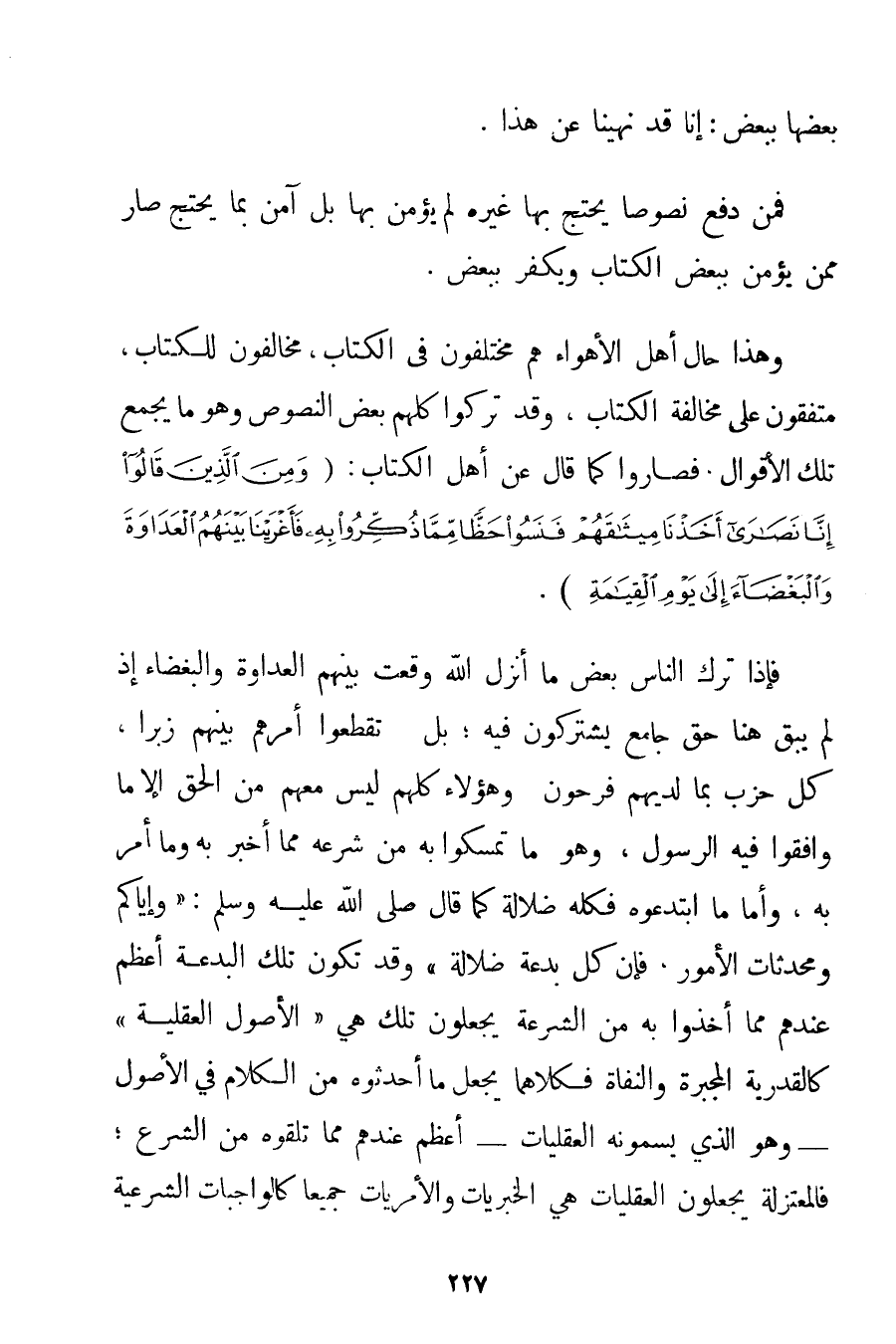 بَعْضَهَا بِبَعْضِ: إنَّا قَدْ نُهِينَا عَنْ هَذَا. فَمَنْ دَفَعَ نُصُوصًا يَحْتَجُّ بِهَا غَيْرُهُ لَمْ يُؤْمِنْ بِهَا بَلْ آمَنَ بِمَا يَحْتَجُّ صَارَ مِمَّنْ يُؤْمِنُ بِبَعْضِ الْكِتَابِ وَيَكْفُرُ بِبَعْضِ. وَهَذَا حَالُ أَهْلِ الْأَهْوَاءِ هُمْ مُخْتَلِفُونَ فِي الْكِتَابِ مُخَالِفُونَ لِلْكِتَابِ مُتَّفِقُونَ عَلَى مُخَالَفَةِ الْكِتَابِ وَقَدْ تَرَكُوا كُلُّهُمْ بَعْضَ النُّصُوصِ وَهُوَ مَا يَجْمَعُ تِلْكَ الْأَقْوَالَ فَصَارُوا كَمَا قَالَ عَنْ أَهْلِ الْكِتَابِ: {وَمِنَ الَّذِينَ قَالُوا إنَّا نَصَارَى أَخَذْنَا مِيثَاقَهُمْ فَنَسُوا حَظًّا مِمَّا ذُكِّرُوا بِهِ فَأَغْرَيْنَا بَيْنَهُمُ الْعَدَاوَةَ وَالْبَغْضَاءَ إلَى يَوْمِ الْقِيَامَةِ} . فَإِذَا تَرَكَ النَّاسُ بَعْضَ مَا أَنْزَلَ اللَّهُ وَقَعَتْ بَيْنَهُمْ الْعَدَاوَةُ وَالْبَغْضَاءُ إذْ لَمْ يَبْقَ هُنَا حَقٌّ جَامِعٌ يَشْتَرِكُونَ فِيهِ؛ بَلْ {فَتَقَطَّعُوا أَمْرَهُمْ بَيْنَهُمْ زُبُرًا كُلُّ حِزْبٍ بِمَا لَدَيْهِمْ فَرِحُونَ} وَهَؤُلَاءِ كُلُّهُمْ لَيْسَ مَعَهُمْ مِنْ الْحَقِّ إلَّا مَا وَافَقُوا فِيهِ الرَّسُولَ وَهُوَ مَا تَمَسَّكُوا بِهِ مِنْ شَرْعِهِ مِمَّا أَخْبَرَ بِهِ وَمَا أَمَرَ بِهِ وَأَمَّا مَا ابْتَدَعُوهُ فَكُلُّهُ ضَلَالَةٌ كَمَا قَالَ صَلَّى اللَّهُ عَلَيْهِ وَسَلَّمَ {وَإِيَّاكُمْ وَمُحْدَثَاتِ الْأُمُورِ فَإِنَّ كُلَّ بِدْعَةٍ ضَلَالَةٌ} وَقَدْ تَكُونُ تِلْكَ الْبِدْعَةُ أَعْظَمَ عِنْدَهُمْ مِمَّا أَخَذُوا بِهِ مِنْ الشِّرْعَةِ يَجْعَلُونَ تِلْكَ هِيَ " الْأُصُولَ الْعَقْلِيَّةَ " كَالْقَدَرِيَّةِ الْمُجَبِّرَةِ والْنُّفَاةِ فَكِلَاهُمَا يَجْعَلُ مَا أَحْدَثُوهُ مِنْ الْكَلَامِ فِي الْأُصُولِ - وَهُوَ الَّذِي يُسَمُّونَهُ الْعَقْلِيَّاتِ - أَعْظَمَ عِنْدَهُمْ مِمَّا تَلَقَّوْهُ مِنْ الشَّرْعِ؛ فَالْمُعْتَزِلَةُ يَجْعَلُونَ الْعَقْلِيَّاتِ هِيَ الْخَبَرِيَّاتِ وَالْأَمْرِيَّاتِ جَمِيعًا كَالْوَاجِبَاتِ الشَّرْعِيَّةِ