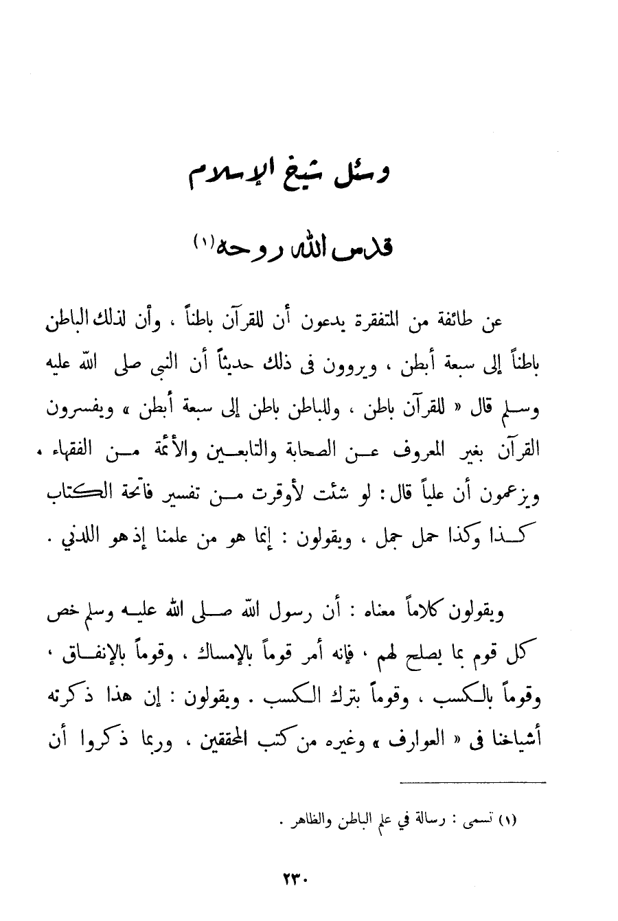 عَنْ طَائِفَةٍ مِنْ الْمُتَفَقِّرَةِ يَدَّعُونَ أَنَّ لِلْقُرْآنِ بَاطِنًا وَأَنَّ لِذَلِكَ الْبَاطِنِ بَاطِنًا إلَى سَبْعَةِ أَبْطُنٍ وَيَرْوُونَ فِي ذَلِكَ حَدِيثًا أَنَّ النَّبِيَّ صَلَّى اللَّهُ عَلَيْهِ وَسَلَّمَ قَالَ {لِلْقُرْآنِ بَاطِنٌ وَلِلْبَاطِنِ بَاطِنٌ إلَى سَبْعَةِ أَبْطُنٍ} وَيُفَسِّرُونَ الْقُرْآنَ بِغَيْرِ الْمَعْرُوفِ عَنْ الصَّحَابَةِ وَالتَّابِعِينَ وَالْأَئِمَّةِ مِنْ الْفُقَهَاءِ وَيَزْعُمُونَ أَنَّ عَلِيًّا قَالَ: لَوْ شِئْت لأوقرت مِنْ تَفْسِيرِ فَاتِحَةِ الْكِتَابِ كَذَا وَكَذَا حِمْلَ جَمَلٍ وَيَقُولُونَ: إنَّمَا هُوَ مِنْ عِلْمِنَا إذْ هُوَ اللدني. وَيَقُولُونَ كَلَامًا مَعْنَاهُ: أَنَّ رَسُولَ اللَّهِ صَلَّى اللَّهُ عَلَيْهِ وَسَلَّمَ خَصَّ كُلَّ قَوْمٍ بِمَا يَصْلُحُ لَهُمْ فَإِنَّهُ أَمَرَ قَوْمًا بِالْإِمْسَاكِ وَقَوْمًا بِالْإِنْفَاقِ وَقَوْمًا بِالْكَسْبِ وَقَوْمًا بِتَرْكِ الْكَسْبِ. وَيَقُولُونَ: إنَّ هَذَا ذَكَرَتْهُ أَشْيَاخُنَا فِي " الْعَوَارِفِ " وَغَيْرِهِ مِنْ كُتُبِ الْمُحَقِّقِينَ وَرُبَّمَا ذَكَرُوا أَنَّ