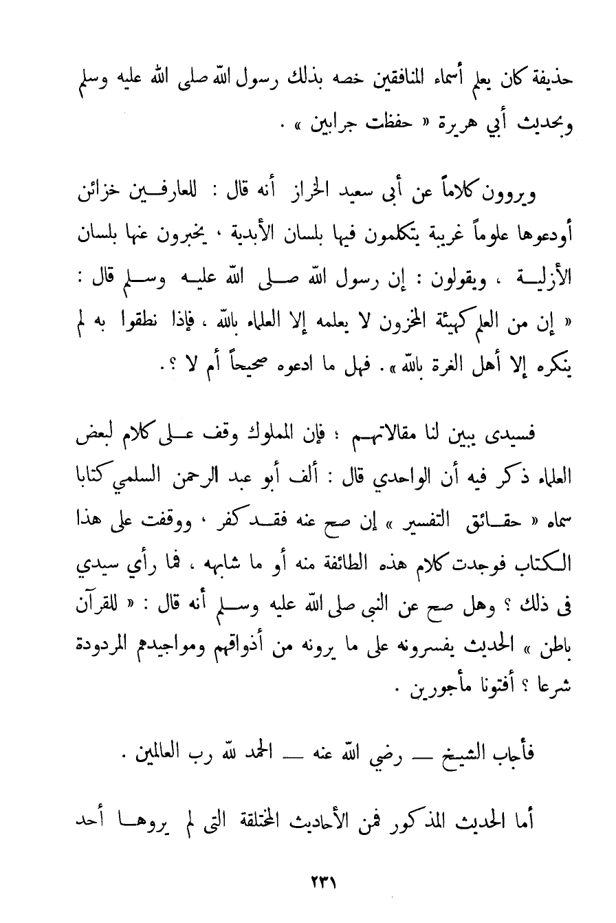 حُذَيْفَةَ كَانَ يَعْلَمُ أَسْمَاءَ الْمُنَافِقِينَ خَصَّهُ بِذَلِكَ رَسُولُ اللَّهِ صَلَّى اللَّهُ عَلَيْهِ وَسَلَّمَ وَبِحَدِيثِ أَبِي هُرَيْرَةَ {حَفِظْت جِرَابَيْنِ} . وَيَرْوُونَ كَلَامًا عَنْ أَبِي سَعِيدٍ الْخَرَّازِ أَنَّهُ قَالَ: لِلْعَارِفِينَ خَزَائِنُ أَوْدَعُوهَا عُلُومًا غَرِيبَةً يَتَكَلَّمُونَ فِيهَا بِلِسَانِ الْأَبَدِيَّةِ يُخْبِرُونَ عَنْهَا بِلِسَانِ الْأَزَلِيَّةِ وَيَقُولُونَ: إنَّ رَسُولَ اللَّهِ صَلَّى اللَّهُ عَلَيْهِ وَسَلَّمَ قَالَ: {إنَّ مِنْ الْعِلْمِ كَهَيْئَةِ الْمَخْزُونِ لَا يَعْلَمُهُ إلَّا الْعُلَمَاءُ بِاَللَّهِ فَإِذَا نَطَقُوا بِهِ لَمْ يُنْكِرْهُ إلَّا أَهِلُ الْغِرَّةِ بِاَللَّهِ} . فَهَلْ مَا ادَّعَوْهُ صَحِيحًا أَمْ لَا؟ . فَسَيِّدِي يُبَيِّنُ لَنَا مَقَالَاتِهِمْ؛ فَإِنَّ الْمَمْلُوكَ وَقَفَ عَلَى كَلَامٍ لِبَعْضِ الْعُلَمَاءِ ذَكَرَ فِيهِ أَنَّ الْوَاحِدِيَّ قَالَ: أَلَّفَ أَبُو عَبْدِ الرَّحْمَنِ السُّلَمِي كِتَابًا سَمَّاهُ " حَقَائِقُ التَّفْسِيرِ " إنْ صَحَّ عَنْهُ فَقَدْ كَفَرَ وَوَقَفْت عَلَى هَذَا الْكِتَابِ فَوَجَدْت كَلَامَ هَذِهِ الطَّائِفَةِ مِنْهُ أَوْ مَا شَابَهَهُ فَمَا رَأْيُ سَيِّدِي فِي ذَلِكَ؟ وَهَلْ صَحَّ عَنْ النَّبِيِّ صَلَّى اللَّهُ عَلَيْهِ وَسَلَّمَ أَنَّهُ قَالَ: {لِلْقُرْآنِ بَاطِنٌ} الْحَدِيثُ يُفَسِّرُونَهُ عَلَى مَا يَرَوْنَهُ مِنْ أَذْوَاقِهِمْ وَمَوَاجِيدِهِمْ الْمَرْدُودَةِ شَرْعًا؟ أَفْتُونَا مَأْجُورِينَ.