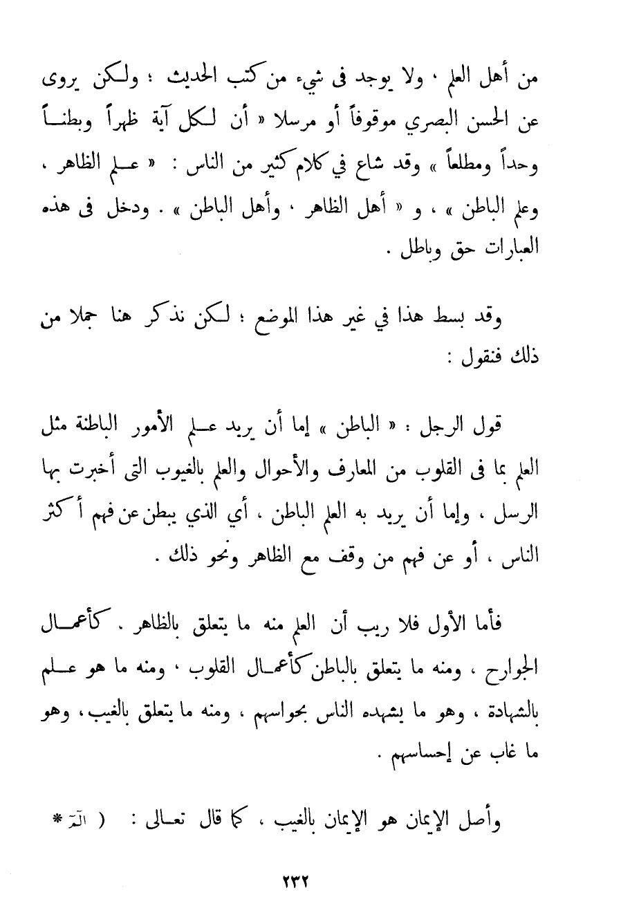 مِنْ أَهْلِ الْعِلْمِ وَلَا يُوجَدُ فِي شَيْءٍ مِنْ كُتُبِ الْحَدِيثِ؛ وَلَكِنْ يُرْوَى عَنْ الْحَسَنِ الْبَصْرِيِّ مَوْقُوفًا أَوْ مُرْسَلًا {إنَّ لِكُلِّ آيَةٍ ظَهْرًا وَبَطْنًا وَحَدًّا وَمَطْلَعًا} وَقَدْ شَاعَ فِي كَلَامِ كَثِيرٍ مِنْ النَّاسِ: " عِلْمُ الظَّاهِرِ وَعِلْمُ الْبَاطِنِ " و " أَهْلُ الظَّاهِرِ وَأَهْلُ الْبَاطِنِ ". وَدَخَلَ فِي هَذِهِ الْعِبَارَاتِ حَقٌّ وَبَاطِلٌ. وَقَدْ بُسِطَ هَذَا فِي غَيْرِ هَذَا الْمَوْضِعِ؛ لَكِنْ نَذْكُرُ هُنَا جُمَلًا مِنْ ذَلِكَ فَنَقُولُ: قَوْلُ الرَّجُلِ: " الْبَاطِنُ " إمَّا أَنْ يُرِيدَ عِلْمَ الْأُمُورِ الْبَاطِنَةِ مِثْلَ الْعِلْمِ بِمَا فِي الْقُلُوبِ مِنْ الْمَعَارِفِ وَالْأَحْوَالِ وَالْعِلْمِ بِالْغُيُوبِ الَّتِي أَخْبَرَتْ بِهَا الرُّسُلُ وَإِمَّا أَنْ يُرِيدَ بِهِ الْعِلْمَ الْبَاطِنَ أَيْ الَّذِي يَبْطُنُ عَنْ فَهْمِ أَكْثَرِ النَّاسِ أَوْ عَنْ فَهْمِ مَنْ وَقَفَ مَعَ الظَّاهِرِ وَنَحْوِ ذَلِكَ. فَأَمَّا الْأَوَّلُ فَلَا رَيْبَ أَنَّ الْعِلْمَ مِنْهُ مَا يَتَعَلَّقُ بِالظَّاهِرِ كَأَعْمَالِ الْجَوَارِحِ وَمِنْهُ مَا يَتَعَلَّقُ بِالْبَاطِنِ كَأَعْمَالِ الْقُلُوبِ وَمِنْهُ مَا هُوَ عِلْمٌ بِالشَّهَادَةِ وَهُوَ مَا يَشْهَدُهُ النَّاسُ بِحَوَاسِّهِمْ وَمِنْهُ مَا يَتَعَلَّقُ بِالْغَيْبِ وَهُوَ مَا غَابَ عَنْ إحْسَاسِهِمْ. وَأَصْلُ الْإِيمَانِ هُوَ الْإِيمَانُ بِالْغَيْبِ كَمَا قَالَ تَعَالَى: {الم} {ذَلِكَ
