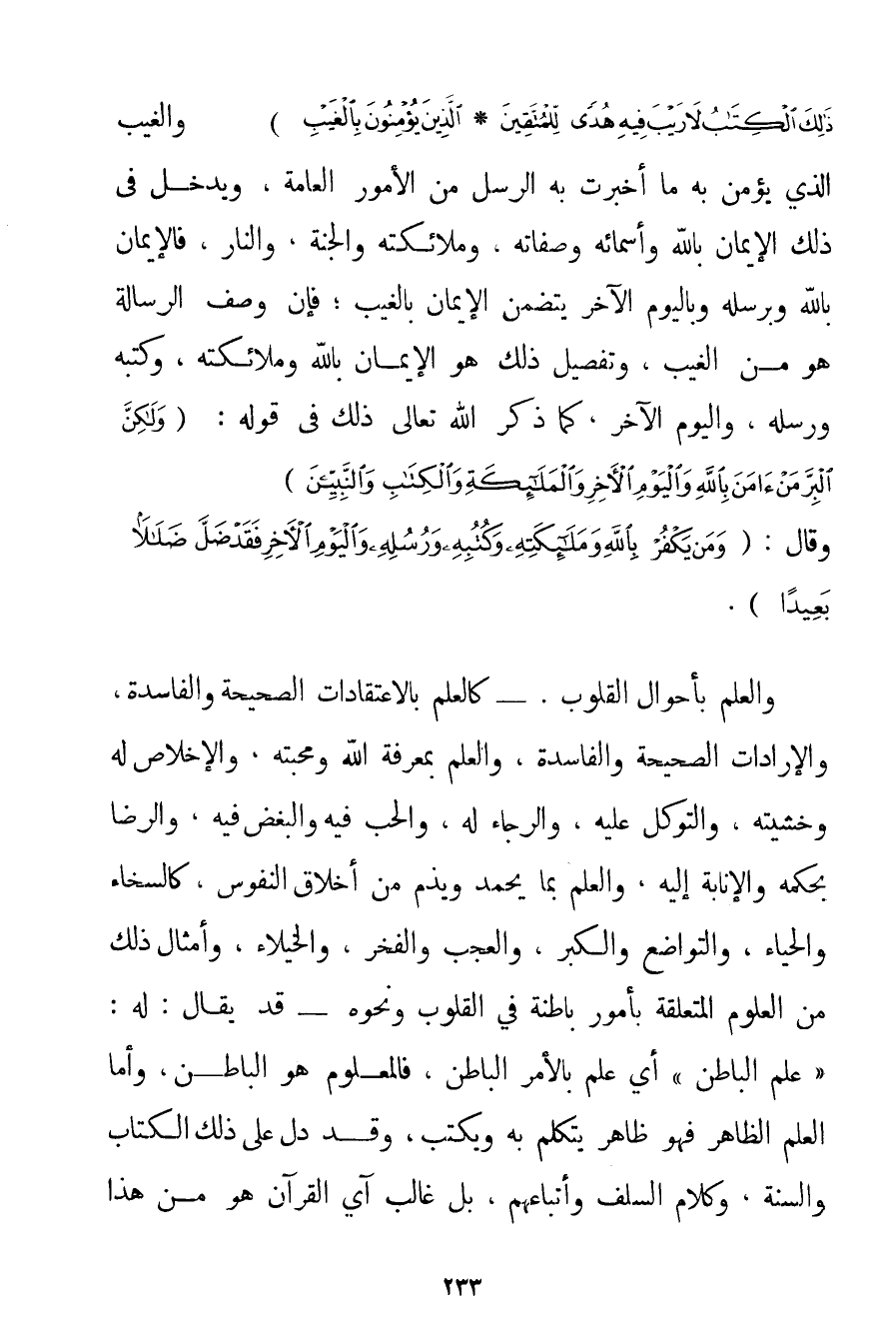 الْكِتَابُ لَا رَيْبَ فِيهِ هُدًى لِلْمُتَّقِينَ} {الَّذِينَ يُؤْمِنُونَ بِالْغَيْبِ} وَالْغَيْبُ الَّذِي يُؤْمِنُ بِهِ مَا أَخْبَرَتْ بِهِ الرُّسُلُ مِنْ الْأُمُورِ الْعَامَّةِ وَيَدْخُلُ فِي ذَلِكَ الْإِيمَانُ بِاَللَّهِ وَأَسْمَائِهِ وَصِفَاتِهِ وَمَلَائِكَتِهِ وَالْجَنَّةِ وَالنَّارِ فَالْإِيمَانُ بِاَللَّهِ وَبِرُسُلِهِ وَبِالْيَوْمِ الْآخِرِ يَتَضَمَّنُ الْإِيمَانَ بِالْغَيْبِ؛ فَإِنَّ وَصْفَ الرِّسَالَةِ هُوَ مِنْ الْغَيْبِ وَتَفْصِيلُ ذَلِكَ هُوَ الْإِيمَانُ بِاَللَّهِ وَمَلَائِكَتِهِ وَكُتُبِهِ وَرُسُلِهِ وَالْيَوْمِ الْآخِرِ كَمَا ذَكَرَ اللَّهُ تَعَالَى ذَلِكَ فِي قَوْلِهِ: {وَلَكِنَّ الْبِرَّ مَنْ آمَنَ بِاللَّهِ وَالْيَوْمِ الْآخِرِ وَالْمَلَائِكَةِ وَالْكِتَابِ وَالنَّبِيِّينَ} وَقَالَ: {وَمَنْ يَكْفُرْ بِاللَّهِ وَمَلَائِكَتِهِ وَكُتُبِهِ وَرُسُلِهِ وَالْيَوْمِ الْآخِرِ فَقَدْ ضَلَّ ضَلَالًا بَعِيدًا} . وَالْعِلْمُ بِأَحْوَالِ الْقُلُوبِ. - كَالْعِلْمِ بِالِاعْتِقَادَاتِ الصَّحِيحَةِ وَالْفَاسِدَةِ وَالْإِرَادَاتِ الصَّحِيحَةِ وَالْفَاسِدَةِ وَالْعِلْمِ بِمَعْرِفَةِ اللَّهِ وَمَحَبَّتِهِ وَالْإِخْلَاصِ لَهُ وَخَشْيَتِهِ وَالتَّوَكُّلِ عَلَيْهِ وَالرَّجَاءِ لَهُ وَالْحُبِّ فِيهِ وَالْبُغْضِ فِيهِ وَالرِّضَا بِحُكْمِهِ وَالْإِنَابَةِ إلَيْهِ وَالْعِلْمِ بِمَا يُحْمَدُ وَيُذَمُّ مِنْ أَخْلَاقِ النُّفُوسِ كَالسَّخَاءِ وَالْحَيَاءِ وَالتَّوَاضُعِ وَالْكِبْرِ وَالْعُجْبِ وَالْفَخْرِ وَالْخُيَلَاءِ وَأَمْثَالِ ذَلِكَ مِنْ الْعُلُومِ الْمُتَعَلِّقَةِ بِأُمُورِ بَاطِنَةٍ فِي الْقُلُوبِ وَنَحْوِهِ - قَدْ يُقَالُ: لَهُ: " عِلْمُ الْبَاطِنِ " أَيْ عِلْمٌ بِالْأَمْرِ الْبَاطِنِ فَالْمَعْلُومُ هُوَ الْبَاطِنُ وَأَمَّا الْعِلْمُ الظَّاهِرُ فَهُوَ ظَاهِرٌ يُتَكَلَّمُ بِهِ وَيُكْتَبُ وَقَدْ دَلَّ عَلَى ذَلِكَ الْكِتَابُ وَالسُّنَّةُ وَكَلَامُ السَّلَفِ وَأَتْبَاعُهُمْ بَلْ غَالِبُ آيِ الْقُرْآنِ هُوَ مِنْ هَذَا