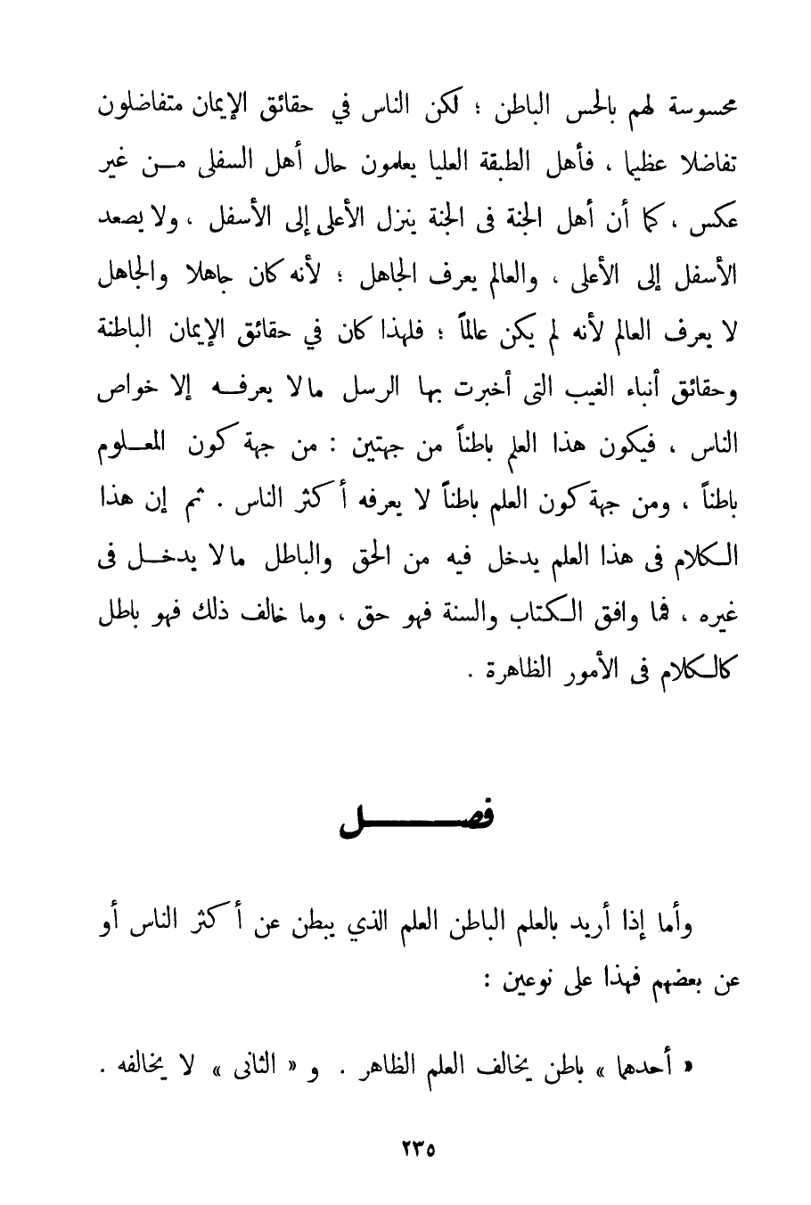 مَحْسُوسَةً لَهُمْ بِالْحِسِّ الْبَاطِنِ؛ لَكِنَّ النَّاسَ فِي حَقَائِقِ الْإِيمَانِ مُتَفَاضِلُونَ تَفَاضُلًا عَظِيمًا فَأَهْلُ الطَّبَقَةِ الْعُلْيَا يَعْلَمُونَ حَالَ أَهْلِ السُّفْلَى مِنْ غَيْرِ عَكْسٍ كَمَا أَنَّ أَهْلَ الْجَنَّةِ فِي الْجَنَّةِ يَنْزِلُ الْأَعْلَى إلَى الْأَسْفَلِ وَلَا يَصْعَدُ الْأَسْفَلُ إلَى الْأَعْلَى وَالْعَالِمُ يَعْرِفُ الْجَاهِلَ؛ لِأَنَّهُ كَانَ جَاهِلًا وَالْجَاهِلُ لَا يَعْرِفُ الْعَالِمَ لِأَنَّهُ لَمْ يَكُنْ عَالِمًا؛ فَلِهَذَا كَانَ فِي حَقَائِقِ الْإِيمَانِ الْبَاطِنَةِ وَحَقَائِقِ أَنْبَاءِ الْغَيْبِ الَّتِي أَخْبَرَتْ بِهَا الرُّسُلُ مَا لَا يَعْرِفُهُ إلَّا خَوَاصُّ النَّاسِ فَيَكُونُ هَذَا الْعِلْمُ بَاطِنًا مِنْ جِهَتَيْنِ: مِنْ جِهَةِ كَوْنِ الْمَعْلُومِ بَاطِنًا وَمِنْ جِهَةِ كَوْنِ الْعِلْمِ بَاطِنًا لَا يَعْرِفُهُ أَكْثَرُ النَّاسِ. ثُمَّ إنَّ هَذَا الْكَلَامَ فِي هَذَا الْعِلْمِ يَدْخُلُ فِيهِ مِنْ الْحَقِّ وَالْبَاطِلِ مَا لَا يَدْخُلُ فِي غَيْرِهِ فَمَا وَافَقَ الْكِتَابَ وَالسُّنَّةَ فَهُوَ حَقٌّ وَمَا خَالَفَ ذَلِكَ فَهُوَ بَاطِلٌ كَالْكَلَامِ فِي الْأُمُورِ الظَّاهِرَةِ.