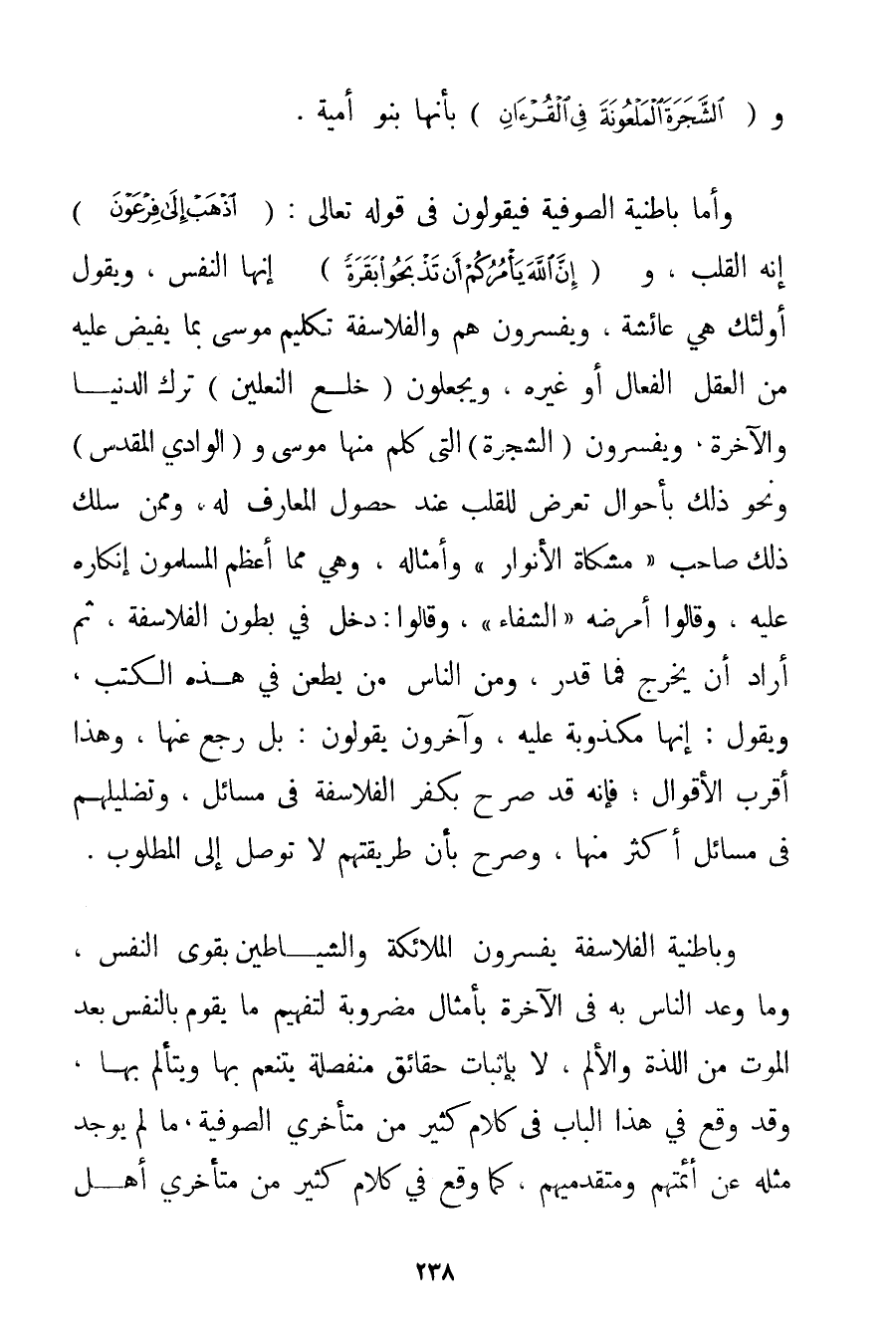 {وَالشَّجَرَةَ الْمَلْعُونَةَ فِي الْقُرْآنِ} بِأَنَّهَا بَنُو أُمَيَّةَ. وَأَمَّا بَاطِنِيَّةُ الصُّوفِيَّةِ فَيَقُولُونَ فِي قَوْله تَعَالَى {اذْهَبْ إلَى فِرْعَوْنَ} إنَّهُ الْقَلْبُ و {إنَّ اللَّهَ يَأْمُرُكُمْ أَنْ تَذْبَحُوا بَقَرَةً} إنَّهَا النَّفْسُ وَيَقُولُ أُولَئِكَ هِيَ عَائِشَةُ وَيُفَسِّرُونَ هُمْ وَالْفَلَاسِفَةُ تَكْلِيمَ مُوسَى بِمَا يَفِيضُ عَلَيْهِ مِنْ الْعَقْلِ الْفَعَّالِ أَوْ غَيْرِهِ وَيَجْعَلُونَ (خَلْعَ النَّعْلَيْنِ تَرْكَ الدُّنْيَا وَالْآخِرَةِ وَيُفَسِّرُونَ (الشَّجَرَةَ الَّتِي كُلِّمَ مِنْهَا مُوسَى و (الْوَادِيَ الْمُقَدَّسَ وَنَحْوَ ذَلِكَ بِأَحْوَالِ تَعْرِضُ لِلْقَلْبِ عِنْدَ حُصُولِ الْمَعَارِفِ لَهُ وَمِمَّنْ سَلَكَ ذَلِكَ صَاحِبُ " مِشْكَاةِ الْأَنْوَارِ " وَأَمْثَالُهُ وَهِيَ مِمَّا أَعْظَمَ الْمُسْلِمُونَ إنْكَارَهُ عَلَيْهِ وَقَالُوا أَمْرَضَهُ " الشِّفَاءُ " وَقَالُوا: دَخَلَ فِي بُطُونِ الْفَلَاسِفَةِ ثُمَّ أَرَادَ أَنْ يَخْرُجَ فَمَا قَدَرَ وَمِنْ النَّاسِ مَنْ يَطْعَنُ فِي هَذِهِ الْكُتُبِ وَيَقُولُ: إنَّهَا مَكْذُوبَةٌ عَلَيْهِ وَآخَرُونَ يَقُولُونَ: بَلْ رَجَعَ عَنْهَا وَهَذَا أَقْرَبُ الْأَقْوَالِ؛ فَإِنَّهُ قَدْ صَرَّحَ بِكُفْرِ الْفَلَاسِفَةِ فِي مَسَائِلَ وَتَضْلِيلِهِمْ فِي مَسَائِلَ أَكْثَرَ مِنْهَا وَصَرَّحَ بِأَنَّ طَرِيقَتَهُمْ لَا تُوَصِّلُ إلَى الْمَطْلُوبِ. وَبَاطِنِيَّةُ الْفَلَاسِفَةِ يُفَسِّرُونَ الْمَلَائِكَةَ وَالشَّيَاطِينَ بِقُوَى النَّفْسِ وَمَا وُعِدَ النَّاسُ بِهِ فِي الْآخِرَةِ بِأَمْثَالِ مَضْرُوبَةٍ لِتَفْهِيمِ مَا يَقُومُ بِالنَّفْسِ بَعْدَ الْمَوْتِ مِنْ اللَّذَّةِ وَالْأَلَمِ لَا بِإِثْبَاتِ حَقَائِقَ مُنْفَصِلَةٍ يَتَنَعَّمُ بِهَا وَيَتَأَلَّمُ بِهَا وَقَدْ وَقَعَ فِي هَذَا الْبَابِ فِي كَلَامِ كَثِيرٍ مِنْ مُتَأَخِّرِي الصُّوفِيَّةِ مَا لَمْ يُوجَدْ مِثْلُهُ عَنْ أَئِمَّتِهِمْ وَمُتَقَدِّمِيهِمْ كَمَا وَقَعَ فِي كَلَامِ كَثِيرٍ مِنْ مُتَأَخِّرِي أَهْلِ