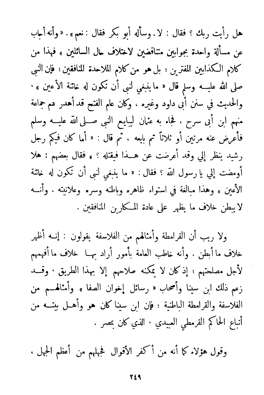 هَلْ رَأَيْت رَبَّك؟ فَقَالَ: لَا. وَسَأَلَهُ أَبُو بَكْرٍ فَقَالَ: نَعَمْ} . " وَأَنَّهُ أَجَابَ عَنْ مَسْأَلَةٍ وَاحِدَةٍ بِجَوَابَيْنِ مُتَنَاقِضَيْنِ لِاخْتِلَافِ حَالِ السَّائِلَيْنِ " فَهَذَا مِنْ كَلَامِ الْكَذَّابِينَ الْمُفْتَرِينَ؛ بَلْ هُوَ مِنْ كَلَامِ الْمَلَاحِدَةِ الْمُنَافِقِينَ؛ فَإِنَّ النَّبِيَّ صَلَّى اللَّهُ عَلَيْهِ وَسَلَّمَ قَالَ {مَا يَنْبَغِي لِنَبِيِّ أَنْ تَكُونَ لَهُ خَائِنَةُ الْأَعْيُنِ} وَالْحَدِيثُ فِي سُنَنِ أَبِي دَاوُد وَغَيْرِهِ {وَكَانَ عَامَ الْفَتْحِ قَدْ أَهْدَرَ دَمَ جَمَاعَةٍ مِنْهُمْ ابْنُ أَبِي سَرْحٍ فَجَاءَ بِهِ عُثْمَانُ لِيُبَايِعَ النَّبِيَّ صَلَّى اللَّهُ عَلَيْهِ وَسَلَّمَ فَأَعْرَضَ عَنْهُ مَرَّتَيْنِ أَوْ ثَلَاثًا ثُمَّ بَايَعَهُ ثُمَّ قَالَ: أَمَا كَانَ فِيكُمْ رَجُلٌ رَشِيدٌ يَنْظُرُ إلَيَّ وَقَدْ أَعْرَضْت عَنْ هَذَا فَيَقْتُلُهُ؟ فَقَالَ بَعْضُهُمْ: هَلَّا أَوْمَضْت إلَيَّ يَا رَسُولَ اللَّهِ؟ فَقَالَ: مَا يَنْبَغِي لِنَبِيِّ أَنْ تَكُونَ لَهُ خَائِنَةُ الْأَعْيُنِ} وَهَذَا مُبَالَغَةٌ فِي اسْتِوَاءِ ظَاهِرِهِ وَبَاطِنِهِ وَسِرِّهِ وَعَلَانِيَتِهِ وَأَنَّهُ لَا يُبْطِنُ خِلَافَ مَا يُظْهِرُ عَلَى عَادَةِ الْمَكَّارِينَ الْمُنَافِقِينَ. وَلَا رَيْبَ أَنَّ الْقَرَامِطَةَ وَأَمْثَالَهُمْ مِنْ الْفَلَاسِفَةِ يَقُولُونَ: إنَّهُ أَظْهَرَ خِلَافَ مَا أَبْطَنَ وَأَنَّهُ خَاطَبَ الْعَامَّةَ بِأُمُورِ أَرَادَ بِهَا خِلَافَ مَا أَفْهَمَهُمْ لِأَجْلِ مَصْلَحَتِهِمْ؛ إذْ كَانَ لَا يُمْكِنُهُ صَلَاحُهُمْ إلَّا بِهَذَا الطَّرِيقِ وَقَدْ زَعَمَ ذَلِكَ ابْنُ سِينَا وَأَصْحَابُ " رَسَائِلِ إخْوَانِ الصَّفَا " وَأَمْثَالُهُمْ مِنْ الْفَلَاسِفَةِ وَالْقَرَامِطَةِ الْبَاطِنِيَّةِ؛ فَإِنَّ ابْنَ سِينَا كَانَ هُوَ وَأَهْلُ بَيْتِهِ مِنْ أَتْبَاعِ الْحَاكِمِ القرمطي العبيدي الَّذِي كَانَ بِمِصْرِ. وَقَوْلُ هَؤُلَاءِ كَمَا أَنَّهُ مِنْ أَكْفَرِ الْأَقْوَالِ فَجَهْلُهُمْ مِنْ أَعْظَمِ الْجَهْلِ