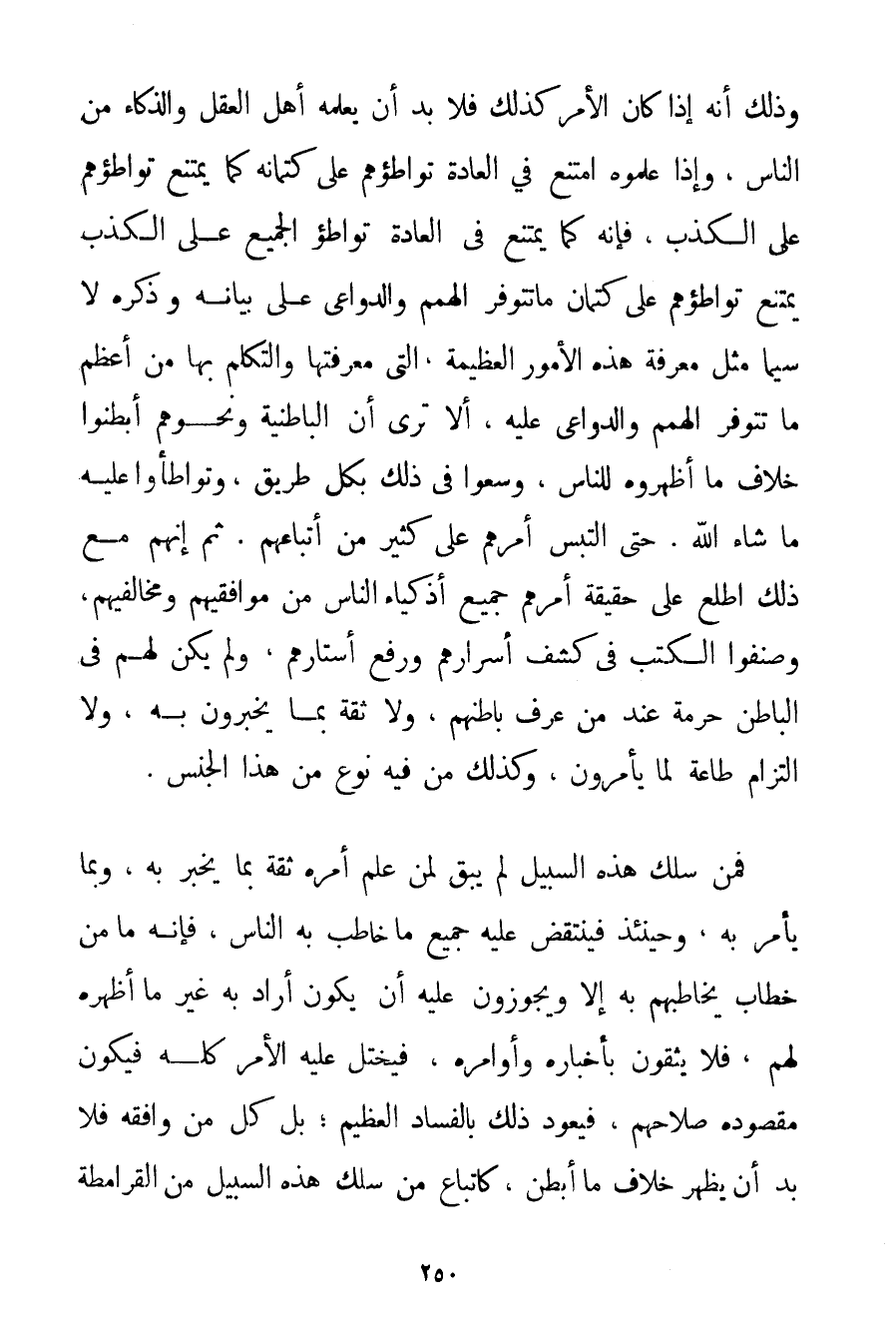 وَذَلِكَ أَنَّهُ إذَا كَانَ الْأَمْرُ كَذَلِكَ فَلَا بُدَّ أَنْ يَعْلَمَهُ أَهْلُ الْعَقْلِ وَالذَّكَاءِ مِنْ النَّاسِ وَإِذَا عَلِمُوهُ امْتَنَعَ فِي الْعَادَةِ تَوَاطُؤُهُمْ عَلَى كِتْمَانِهِ كَمَا يَمْتَنِعُ تَوَاطُؤُهُمْ عَلَى الْكَذِبِ فَإِنَّهُ كَمَا يَمْتَنِعُ فِي الْعَادَةِ تَوَاطُؤُ الْجَمِيعِ عَلَى الْكَذِبِ يَمْتَنِعُ تَوَاطُؤُهُمْ عَلَى كِتْمَانِ مَا تَتَوَفَّرُ الْهِمَمُ وَالدَّوَاعِي عَلَى بَيَانِهِ وَذِكْرِهِ لَا سِيَّمَا مِثْلُ مَعْرِفَةِ هَذِهِ الْأُمُورِ الْعَظِيمَةِ الَّتِي مَعْرِفَتُهَا وَالتَّكَلُّمُ بِهَا مِنْ أَعْظَمِ مَا تَتَوَفَّرُ الْهِمَمُ وَالدَّوَاعِي عَلَيْهِ أَلَا تَرَى أَنَّ الْبَاطِنِيَّةَ وَنَحْوَهُمْ أَبْطَنُوا خِلَافَ مَا أَظْهَرُوهُ لِلنَّاسِ وَسَعَوْا فِي ذَلِكَ بِكُلِّ طَرِيقٍ وَتَوَاطَئُوا عَلَيْهِ مَا شَاءَ اللَّهُ. حَتَّى الْتَبَسَ أَمْرُهُمْ عَلَى كَثِيرٍ مِنْ أَتْبَاعِهِمْ. ثُمَّ إنَّهُمْ مَعَ ذَلِكَ اطَّلَعَ عَلَى حَقِيقَةِ أَمْرِهِمْ جَمِيعُ أَذْكِيَاءِ النَّاسِ مِنْ مُوَافَقِيهِمْ وَمُخَالِفِيهِمْ وَصَنَّفُوا الْكُتُبَ فِي كَشْفِ أَسْرَارِهِمْ وَرَفْعِ أَسْتَارِهِمْ وَلَمْ يَكُنْ لَهُمْ فِي الْبَاطِنِ حُرْمَةٌ عِنْدَ مَنْ عَرَفَ بَاطِنَهُمْ وَلَا ثِقَةٌ بِمَا يُخْبِرُونَ بِهِ وَلَا الْتِزَامُ طَاعَةٍ لِمَا يَأْمُرُونَ وَكَذَلِكَ مَنْ فِيهِ نَوْعٌ مِنْ هَذَا الْجِنْسِ. فَمَنْ سَلَكَ هَذِهِ السَّبِيلَ لَمْ يَبْقَ لِمَنْ عَلِمَ أَمْرَهُ ثِقَةٌ بِمَا يُخْبِرُ بِهِ وَبِمَا يَأْمُرُ بِهِ وَحِينَئِذٍ فَيُنْتَقَضُ عَلَيْهِ جَمِيعُ مَا خَاطَبَ بِهِ النَّاسَ فَإِنَّهُ مَا مِنْ خِطَابٍ يُخَاطِبُهُمْ بِهِ إلَّا وَيُجَوِّزُونَ عَلَيْهِ أَنْ يَكُونَ أَرَادَ بِهِ غَيْرَ مَا أَظْهَرَهُ لَهُمْ فَلَا يَثِقُونَ بِأَخْبَارِهِ وَأَوَامِرِهِ فَيَخْتَلُّ عَلَيْهِ الْأَمْرُ كُلُّهُ فَيَكُونُ مَقْصُودُهُ صَلَاحَهُمْ فَيَعُودُ ذَلِكَ بِالْفَسَادِ الْعَظِيمِ؛ بَلْ كُلُّ مَنْ وَافَقَهُ فَلَا بُدَّ أَنْ يُظْهِرَ خِلَافَ مَا أَبْطَنَ كَاتِّبَاعِ مَنْ سَلَكَ هَذِهِ السَّبِيلَ مِنْ الْقَرَامِطَةِ