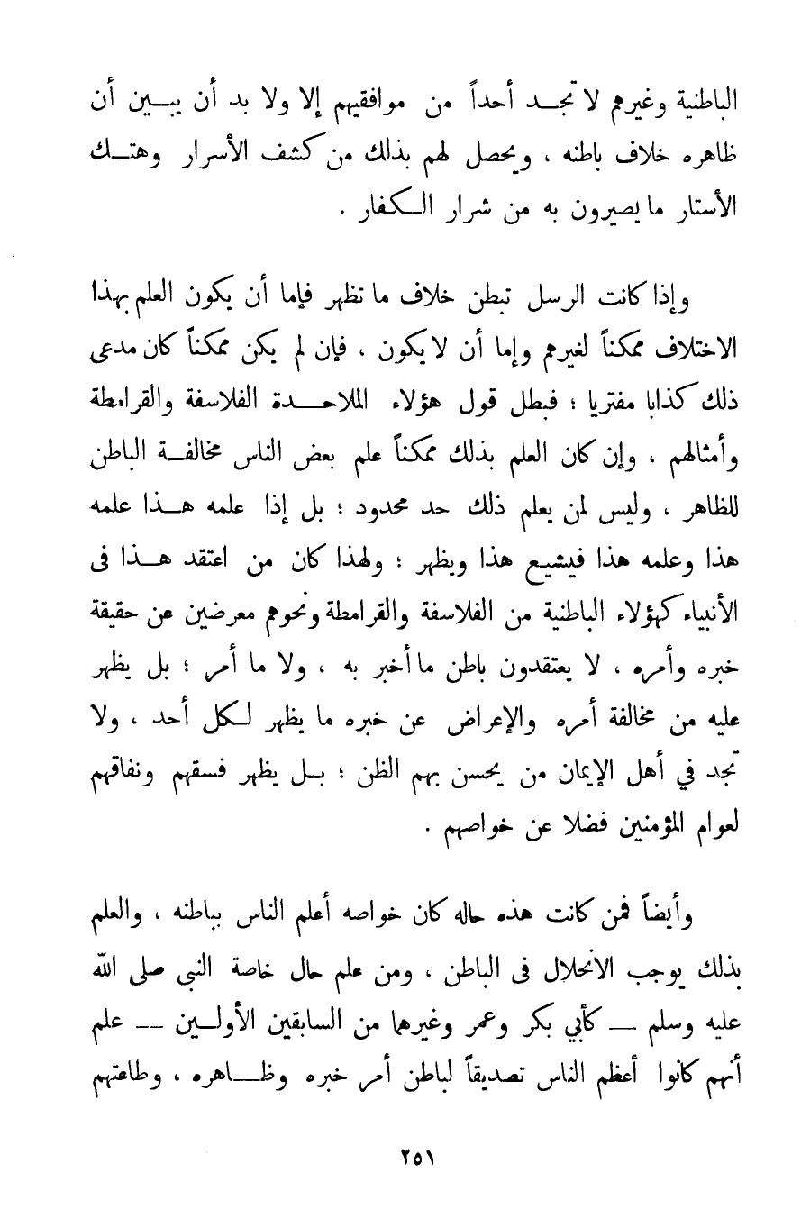 الْبَاطِنِيَّةِ وَغَيْرِهِمْ لَا تَجِدُ أَحَدًا مِنْ مُوَافِقِيهِمْ إلَّا وَلَا بُدَّ أَنْ يُبَيِّنَ أَنَّ ظَاهِرَهُ خِلَافُ بَاطِنِهِ وَيَحْصُلُ لَهُمْ بِذَلِكَ مِنْ كَشْفِ الْأَسْرَارِ وَهَتْكِ الْأَسْتَارِ مَا يَصِيرُونَ بِهِ مِنْ شِرَارِ الْكُفَّارِ. وَإِذَا كَانَتْ الرُّسُلُ تُبْطِنُ خِلَافَ مَا تُظْهِرُ فَإِمَّا أَنْ يَكُونَ الْعِلْمُ بِهَذَا الِاخْتِلَافِ مُمْكِنًا لِغَيْرِهِمْ وَإِمَّا أَنْ لَا يَكُونَ فَإِنْ لَمْ يَكُنْ مُمْكِنًا كَانَ مُدَّعِي ذَلِكَ كَذَّابًا مُفْتَرِيًا؛ فَبَطَلَ قَوْلُ هَؤُلَاءِ الْمَلَاحِدَةِ الْفَلَاسِفَةِ وَالْقَرَامِطَةِ وَأَمْثَالِهِمْ وَإِنْ كَانَ الْعِلْمُ بِذَلِكَ مُمْكِنًا عَلِمَ بَعْضُ النَّاسِ مُخَالَفَةَ الْبَاطِنِ لِلظَّاهِرِ وَلَيْسَ لِمَنْ يَعْلَمُ ذَلِكَ حَدٌّ مَحْدُودٌ؛ بَلْ إذَا عَلِمَهُ هَذَا عَلَّمَهُ هَذَا وَعَلَّمَهُ هَذَا فَيَشِيعُ هَذَا وَيَظْهَرُ؛ وَلِهَذَا كَانَ مَنْ اعْتَقَدَ هَذَا فِي الْأَنْبِيَاءِ كَهَؤُلَاءِ الْبَاطِنِيَّةِ مِنْ الْفَلَاسِفَةِ وَالْقَرَامِطَةِ وَنَحْوِهِمْ مُعْرِضِينَ عَنْ حَقِيقَةِ خَبَرِهِ وَأَمْرِهِ لَا يَعْتَقِدُونَ بَاطِنَ مَا أَخْبَرَ بِهِ وَلَا مَا أَمَرَ؛ بَلْ يَظْهَرُ عَلَيْهِ مِنْ مُخَالَفَةِ أَمْرِهِ وَالْإِعْرَاضِ عَنْ خَبَرِهِ مَا يَظْهَرُ لِكُلِّ أَحَدٍ وَلَا تَجِدُ فِي أَهْلِ الْإِيمَانِ مَنْ يُحْسِنُ بِهِمْ الظَّنَّ؛ بَلْ يَظْهَرُ فِسْقُهُمْ وَنِفَاقُهُمْ لِعَوَامِّ الْمُؤْمِنِينَ فَضْلًا عَنْ خَوَاصِّهِمْ. وَأَيْضًا فَمَنْ كَانَتْ هَذِهِ حَالَهُ كَانَ خَوَاصُّهُ أَعْلَمَ النَّاسِ بِبَاطِنِهِ وَالْعِلْمُ بِذَلِكَ يُوجِبُ الِانْحِلَالَ فِي الْبَاطِنِ وَمَنْ عَلِمَ حَالَ خَاصَّةِ النَّبِيِّ صَلَّى اللَّهُ عَلَيْهِ وَسَلَّمَ - كَأَبِي بَكْرٍ وَعُمَرَ وَغَيْرِهِمَا مِنْ السَّابِقِينَ الْأَوَّلِينَ - عَلِمَ أَنَّهُمْ كَانُوا أَعْظَمَ النَّاسِ تَصْدِيقًا لِبَاطِنِ أَمْرِ خَبَرِهِ وَظَاهِرِهِ وَطَاعَتَهُمْ