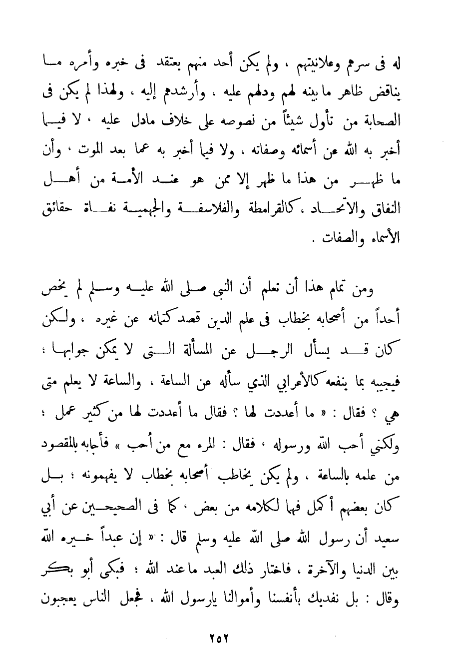 لَهُ فِي سِرِّهِمْ وَعَلَانِيَتِهِمْ وَلَمْ يَكُنْ أَحَدٌ مِنْهُمْ يَعْتَقِدُ فِي خَبَرِهِ وَأَمْرِهِ مَا يُنَاقِضُ ظَاهِرَ مَا بَيَّنَهُ لَهُمْ وَدَلَّهُمْ عَلَيْهِ وَأَرْشَدَهُمْ إلَيْهِ وَلِهَذَا لَمْ يَكُنْ فِي الصَّحَابَةِ مَنْ تَأَوَّلَ شَيْئًا مِنْ نُصُوصِهِ عَلَى خِلَافِ مَا دَلَّ عَلَيْهِ لَا فِيمَا أَخْبَرَ بِهِ اللَّهُ عَنْ أَسْمَائِهِ وَصِفَاتِهِ وَلَا فِيمَا أَخْبَرَ بِهِ عَمَّا بَعْدَ الْمَوْتِ وَأَنَّ مَا ظَهَرَ مِنْ هَذَا مَا ظَهَرَ إلَّا مِمَّنْ هُوَ عِنْدَ الْأَئِمَّةِ مِنْ أَهْلِ النِّفَاقِ وَالِاتِّحَادِ كَالْقَرَامِطَةِ وَالْفَلَاسِفَةِ وَالْجَهْمِيَّة نفاة حَقَائِقِ الْأَسْمَاءِ وَالصِّفَاتِ. وَمِنْ تَمَامِ هَذَا أَنْ تَعْلَمَ أَنَّ النَّبِيَّ صَلَّى اللَّهُ عَلَيْهِ وَسَلَّمَ لَمْ يَخُصَّ أَحَدًا مِنْ أَصْحَابِهِ بِخِطَابِ فِي عِلْمِ الدِّينِ قَصَدَ كِتْمَانَهُ عَنْ غَيْرِهِ وَلَكِنْ كَانَ قَدْ يَسْأَلُ الرَّجُلَ عَنْ الْمَسْأَلَةِ الَّتِي لَا يُمْكِنُ جَوَابُهَا؛ فَيُجِيبُهُ بِمَا يَنْفَعُهُ {كَالْأَعْرَابِيِّ الَّذِي سَأَلَهُ عَنْ السَّاعَةِ وَالسَّاعَةُ لَا يُعْلَمُ مَتَى هِيَ؟ فَقَالَ: مَا أَعْدَدْت لَهَا؟ فَقَالَ مَا أَعْدَدْت لَهَا مِنْ كَثِيرِ عَمَلٍ؛ وَلَكِنِّي أُحِبُّ اللَّهَ وَرَسُولَهُ فَقَالَ: الْمَرْءُ مَعَ مَنْ أَحَبَّ} فَأَجَابَهُ بِالْمَقْصُودِ مِنْ عِلْمِهِ بِالسَّاعَةِ وَلَمْ يَكُنْ يُخَاطِبُ أَصْحَابَهُ بِخِطَابِ لَا يَفْهَمُونَهُ؛ بَلْ كَانَ بَعْضُهُمْ أَكْمَلَ فَهْمًا لِكَلَامِهِ مِنْ بَعْضٍ كَمَا فِي الصَّحِيحَيْنِ عَنْ أَبِي سَعِيدٍ أَنَّ رَسُولَ اللَّهِ صَلَّى اللَّهُ عَلَيْهِ وَسَلَّمَ قَالَ: {إنَّ عَبْدًا خَيَّرَهُ اللَّهُ بَيْنَ الدُّنْيَا وَالْآخِرَةِ فَاخْتَارَ ذَلِكَ الْعَبْدُ مَا عِنْدَ اللَّهِ؛ فَبَكَى أَبُو بَكْرٍ وَقَالَ: بَلْ نَفْدِيك بِأَنْفُسِنَا وَأَمْوَالِنَا يَا رَسُولَ اللَّهِ فَجَعَلَ النَّاسُ يَعْجَبُونَ
