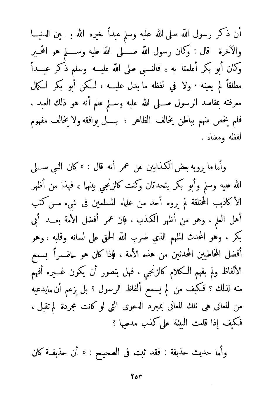 وَأَمَّا مَا يَرْوِيهِ بَعْضُ الْكَذَّابِينَ {عَنْ عُمَرَ أَنَّهُ قَالَ: كَانَ النَّبِيُّ صَلَّى اللَّهُ عَلَيْهِ وَسَلَّمَ وَأَبُو بَكْرٍ يَتَحَدَّثَانِ وَكُنْت كَالزِّنْجِيِّ بَيْنَهُمَا} فَهَذَا مِنْ أَظْهَرِ الْأَكَاذِيبِ الْمُخْتَلَقَةِ لَمْ يَرْوِهِ أَحَدٌ مِنْ عُلَمَاءِ الْمُسْلِمِينَ فِي شَيْءٍ مِنْ كُتُبِ أَهْلِ الْعِلْمِ وَهُوَ مِنْ أَظْهَرِ الْكَذِبِ فَإِنَّ عُمَرَ أَفْضَلُ الْأُمَّةِ بَعْدَ أَبِي بَكْرٍ وَهُوَ الْمُحَدَّثُ الْمُلْهَمُ الَّذِي ضَرَبَ اللَّهُ الْحَقَّ عَلَى لِسَانِهِ وَقَلْبِهِ وَهُوَ أَفْضَلُ الْمُخَاطَبِينَ الْمُحَدَّثِينَ مِنْ هَذِهِ الْأُمَّةِ فَإِذَا كَانَ هُوَ حَاضِرًا يَسْمَعُ الْأَلْفَاظَ وَلَمْ يَفْهَمْ الْكَلَامَ كَالزِّنْجِيِّ فَهَلْ يُتَصَوَّرُ أَنْ يَكُونَ غَيْرُهُ أَفْهَمَ مِنْهُ لِذَلِكَ؟ فَكَيْفَ مَنْ لَمْ يَسْمَعْ أَلْفَاظَ الرَّسُولِ؟ بَلْ يَزْعُمُ أَنَّ مَا يَدَّعِيهِ مِنْ الْمَعَانِي هِيَ تِلْكَ الْمَعَانِي بِمُجَرَّدِ الدَّعْوَى الَّتِي لَوْ كَانَتْ مُجَرَّدَةً لَمْ تُقْبَلْ فَكَيْفَ إذَا قَامَتْ الْبَيِّنَةُ عَلَى كَذِبِ مُدَّعِيهَا؟ . وَأَمَّا حَدِيثُ حُذَيْفَةَ: فَقَدْ ثَبَتَ فِي الصَّحِيحِ: {أَنَّ حُذَيْفَةَ كَانَ
