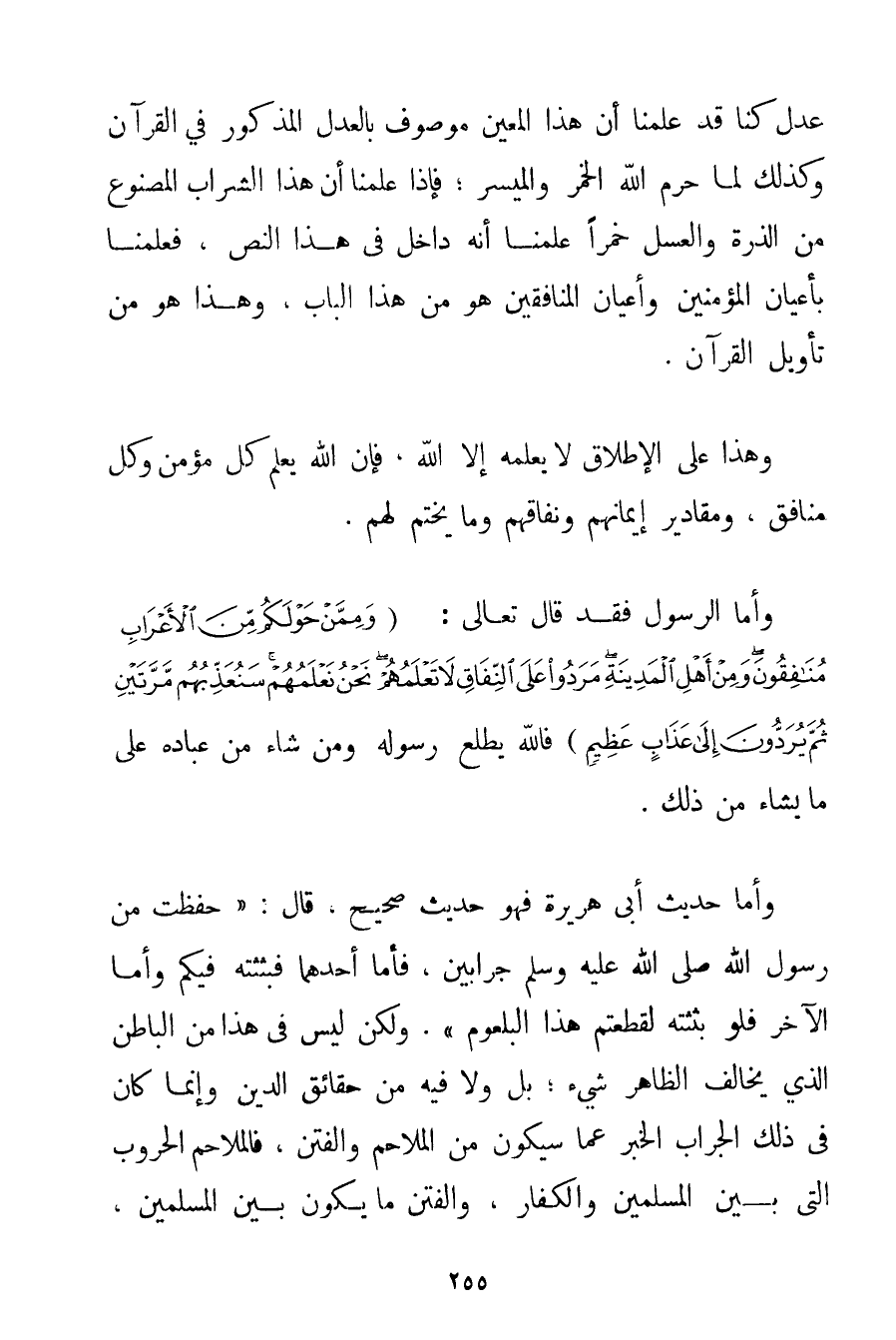 عَدْلٍ كُنَّا قَدْ عَلِمْنَا أَنَّ هَذَا الْمُعَيَّنَ مَوْصُوفٌ بِالْعَدْلِ الْمَذْكُورِ فِي الْقُرْآنِ وَكَذَلِكَ لِمَا حَرَّمَ اللَّهُ الْخَمْرَ وَالْمَيْسِرَ؛ فَإِذَا عَلِمْنَا أَنَّ هَذَا الشَّرَابَ الْمَصْنُوعَ مِنْ الذُّرَةِ وَالْعَسَلِ خَمْرًا عَلِمْنَا أَنَّهُ دَاخِلٌ فِي هَذَا النَّصِّ فَعَلِمْنَا بِأَعْيَانِ الْمُؤْمِنِينَ وَأَعْيَانِ الْمُنَافِقِينَ هُوَ مِنْ هَذَا الْبَابِ وَهَذَا هُوَ مِنْ تَأْوِيلِ الْقُرْآنِ. وَهَذَا عَلَى الْإِطْلَاقِ لَا يَعْلَمُهُ إلَّا اللَّهُ فَإِنَّ اللَّهَ يَعْلَمُ كُلَّ مُؤْمِنٍ وَكُلَّ مُنَافِقٍ وَمَقَادِيرَ إيمَانِهِمْ وَنِفَاقِهِمْ وَمَا يُخْتَمُ لَهُمْ. وَأَمَّا الرَّسُولُ فَقَدْ قَالَ تَعَالَى: {وَمِمَّنْ حَوْلَكُمْ مِنَ الْأَعْرَابِ مُنَافِقُونَ وَمِنْ أَهْلِ الْمَدِينَةِ مَرَدُوا عَلَى النِّفَاقِ لَا تَعْلَمُهُمْ نَحْنُ نَعْلَمُهُمْ سَنُعَذِّبُهُمْ مَرَّتَيْنِ ثُمَّ يُرَدُّونَ إلَى عَذَابٍ عَظِيمٍ} فَاَللَّهُ يُطْلِعُ رَسُولَهُ وَمَنْ شَاءَ مِنْ عِبَادِهِ عَلَى مَا يَشَاءُ مِنْ ذَلِكَ. وَأَمَّا حَدِيثُ أَبِي هُرَيْرَةَ فَهُوَ حَدِيثٌ صَحِيحٌ قَالَ: " حَفِظْت مِنْ رَسُولِ اللَّهِ صَلَّى اللَّهُ عَلَيْهِ وَسَلَّمَ جِرَابَيْنِ فَأَمَّا أَحَدُهُمَا فَبَثَثْته فِيكُمْ وَأَمَّا الْآخَرُ فَلَوْ بَثَثْته لَقَطَعْتُمْ هَذَا الْبُلْعُومَ ". وَلَكِنْ لَيْسَ فِي هَذَا مِنْ الْبَاطِنِ الَّذِي يُخَالِفُ الظَّاهِرَ شَيْءٌ؛ بَلْ وَلَا فِيهِ مِنْ حَقَائِقِ الدِّينِ وَإِنَّمَا كَانَ فِي ذَلِكَ الْجِرَابِ الْخَبَرُ عَمَّا سَيَكُونُ مِنْ الْمَلَاحِمِ وَالْفِتَنِ فَالْمَلَاحِمُ الْحُرُوبُ الَّتِي بَيْنَ الْمُسْلِمِينَ وَالْكُفَّارِ وَالْفِتَنِ مَا يَكُونُ بَيْنَ الْمُسْلِمِينَ