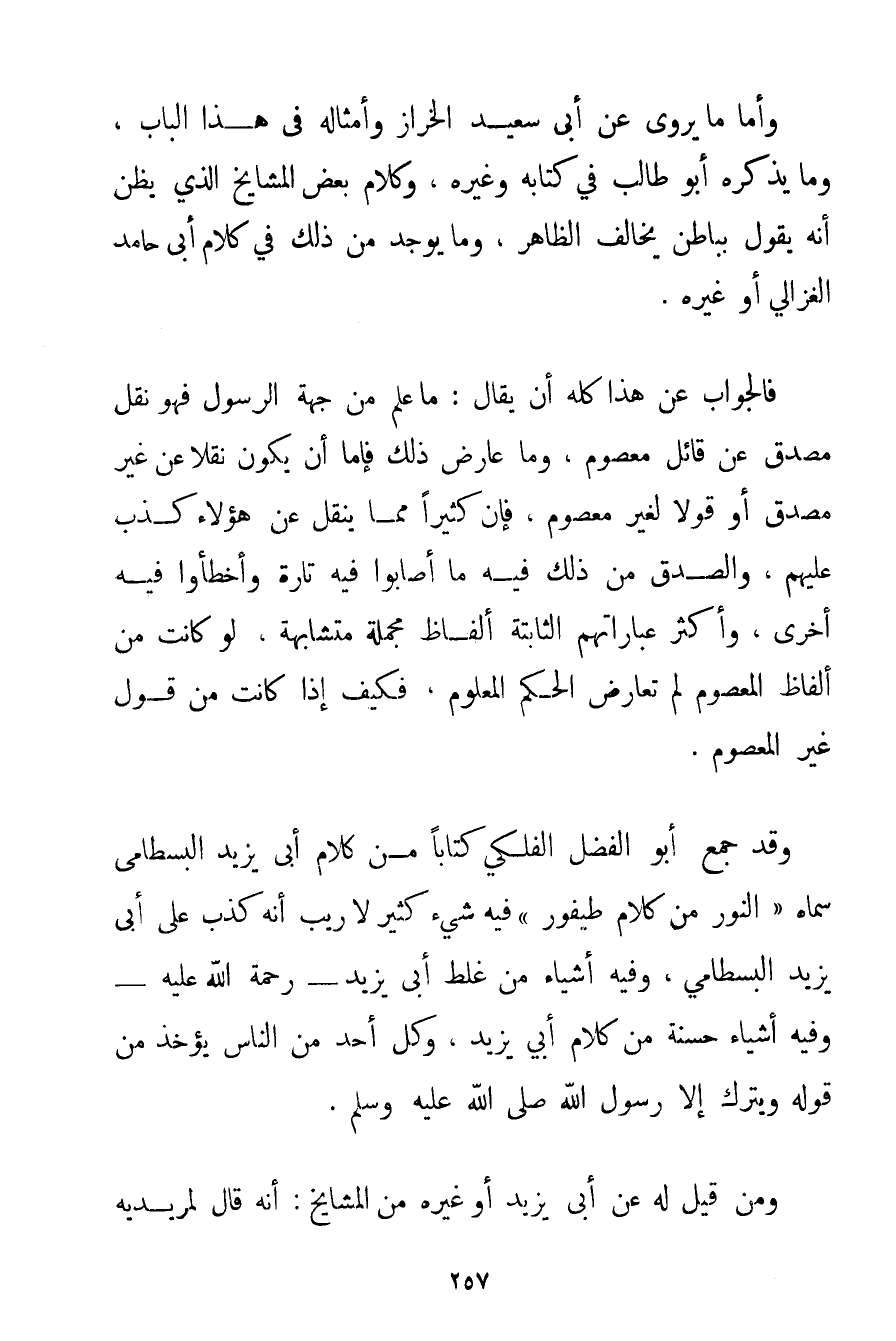 وَأَمَّا مَا يُرْوَى عَنْ أَبِي سَعِيدٍ الْخَرَّازِ وَأَمْثَالِهِ فِي هَذَا الْبَابِ وَمَا يَذْكُرُهُ أَبُو طَالِبٍ فِي كِتَابِهِ وَغَيْرُهُ وَكَلَامُ بَعْضِ الْمَشَايِخِ الَّذِي يَظُنُّ أَنَّهُ يَقُولُ بِبَاطِنِ يُخَالِفُ الظَّاهِرَ وَمَا يُوجَدُ مِنْ ذَلِكَ فِي كَلَامِ أَبِي حَامِدٍ الْغَزَالِيِّ أَوْ غَيْرِهِ. فَالْجَوَابُ عَنْ هَذَا كُلِّهِ أَنْ يُقَالَ: مَا عُلِمَ مِنْ جِهَةِ الرَّسُولِ فَهُوَ نَقْلُ مُصَدِّقٍ عَنْ قَائِلٍ مَعْصُومٍ وَمَا عَارَضَ ذَلِكَ فَإِمَّا أَنْ يَكُونَ نَقْلًا عَنْ غَيْرِ مُصَدِّقٍ أَوْ قَوْلًا لِغَيْرِ مَعْصُومٍ فَإِنَّ كَثِيرًا مِمَّا يُنْقَلُ عَنْ هَؤُلَاءِ كَذِبٌ عَلَيْهِمْ وَالصِّدْقُ مِنْ ذَلِكَ فِيهِ مَا أَصَابُوا فِيهِ تَارَةً وَأَخْطَئُوا فِيهِ أُخْرَى وَأَكْثَرُ عِبَارَاتِهِمْ الثَّابِتَةِ أَلْفَاظٌ مُجْمَلَةٌ مُتَشَابِهَةٌ لَوْ كَانَتْ مِنْ أَلْفَاظِ الْمَعْصُومِ لَمْ تُعَارِضْ الْحُكْمَ الْمَعْلُومَ فَكَيْفَ إذَا كَانَتْ مِنْ قَوْلِ غَيْرِ الْمَعْصُومِ. وَقَدْ جَمَعَ أَبُو الْفَضْلِ الْفَلَكِيُّ كِتَابًا مِنْ كَلَامِ أَبِي يَزِيدَ البسطامي سَمَّاهُ " النُّور مِنْ كَلَامِ طيفور " فِيهِ شَيْءٌ كَثِيرٌ لَا رَيْبَ أَنَّهُ كَذِبٌ عَلَى أَبِي يَزِيدَ البسطامي وَفِيهِ أَشْيَاءُ مِنْ غَلَطِ أَبِي يَزِيدَ - رَحْمَةُ اللَّهِ عَلَيْهِ - وَفِيهِ أَشْيَاءُ حَسَنَةٌ مِنْ كَلَامِ أَبِي يَزِيدَ وَكُلُّ أَحَدٍ مِنْ النَّاسِ يُؤْخَذُ مِنْ قَوْلِهِ وَيُتْرَكُ إلَّا رَسُولَ اللَّهِ صَلَّى اللَّهُ عَلَيْهِ وَسَلَّمَ.