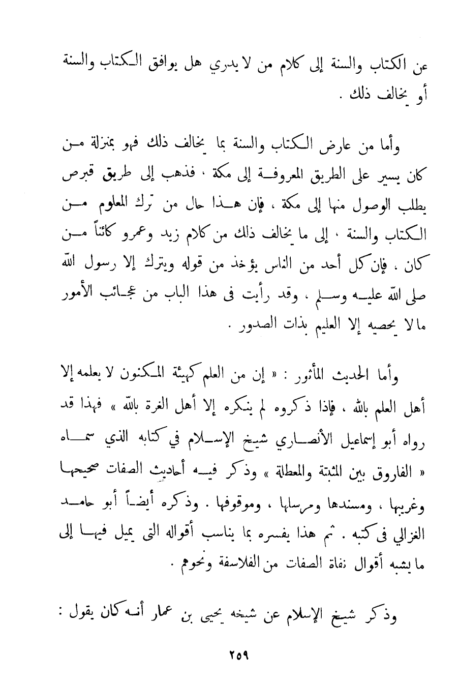 عَنْ الْكِتَابِ وَالسُّنَّةِ إلَى كَلَامِ مَنْ لَا يَدْرِي هَلْ يُوَافِقُ الْكِتَابَ وَالسُّنَّةَ أَوْ يُخَالِفُ ذَلِكَ. وَأَمَّا مَنْ عَارَضَ الْكِتَابَ وَالسُّنَّةَ بِمَا يُخَالِفُ ذَلِكَ فَهُوَ بِمَنْزِلَةِ مَنْ كَانَ يَسِيرُ عَلَى الطَّرِيقِ الْمَعْرُوفَةِ إلَى مَكَّةَ فَذَهَبَ إلَى طَرِيقِ قُبْرُصَ يَطْلُبُ الْوُصُولَ مِنْهَا إلَى مَكَّةَ فَإِنَّ هَذَا حَالُ مَنْ تَرَكَ الْمَعْلُومَ مِنْ الْكِتَابِ وَالسُّنَّةِ إلَى مَا يُخَالِفُ ذَلِكَ مِنْ كَلَامِ زَيْدٍ وَعَمْرٍو كَائِنًا مَنْ كَانَ فَإِنَّ كُلَّ أَحَدٍ مِنْ النَّاسِ يُؤْخَذُ مِنْ قَوْلِهِ وَيُتْرَكُ إلَّا رَسُولَ اللَّهِ صَلَّى اللَّهُ عَلَيْهِ وَسَلَّمَ وَقَدْ رَأَيْت فِي هَذَا الْبَابِ مِنْ عَجَائِبِ الْأُمُورِ مَا لَا يُحْصِيهِ إلَّا الْعَلِيمُ بِذَاتِ الصُّدُورِ. وَأَمَّا الْحَدِيثُ الْمَأْثُورُ: {إنَّ مِنْ الْعِلْمِ كَهَيْئَةِ الْمَكْنُونِ لَا يَعْلَمُهُ إلَّا أَهْلُ الْعِلْمِ بِاَللَّهِ فَإِذَا ذَكَرُوهُ لَمْ يُنْكِرْهُ إلَّا أَهْلُ الْغِرَّةِ بِاَللَّهِ} فَهَذَا قَدْ رَوَاهُ أَبُو إسْمَاعِيلَ الْأَنْصَارِيُّ شَيْخُ الْإِسْلَامِ فِي كِتَابِهِ الَّذِي سَمَّاهُ " الْفَارُوقُ بَيْنَ الْمُثْبِتَةِ وَالْمُعَطِّلَةِ " وَذَكَرَ فِيهِ أَحَادِيثَ الصِّفَاتِ صَحِيحَهَا وَغَرِيبَهَا وَمُسْنَدَهَا وَمُرْسَلَهَا وَمَوْقُوفَهَا. وَذَكَرَهُ أَيْضًا أَبُو حَامِدٍ الْغَزَالِيُّ فِي كُتُبِهِ. ثُمَّ هَذَا يُفَسِّرُهُ بِمَا يُنَاسِبُ أَقْوَالَهُ الَّتِي يَمِيلُ فِيهَا إلَى مَا يُشْبِهُ أَقْوَالَ نفاة الصِّفَاتِ مِنْ الْفَلَاسِفَةِ وَنَحْوِهِمْ. وَذَكَرَ شَيْخُ الْإِسْلَامِ عَنْ شَيْخِهِ يَحْيَى بْنِ عَمَّارٍ أَنَّهُ كَانَ يَقُولُ: