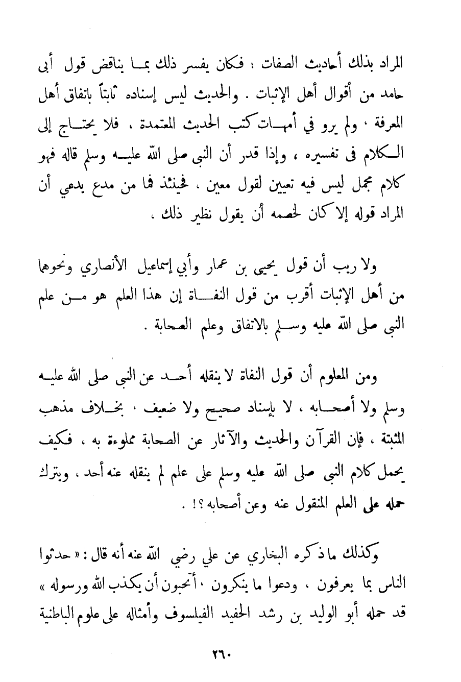 الْمُرَادُ بِذَلِكَ أَحَادِيثُ الصِّفَاتِ؛ فَكَانَ يُفَسِّرُ ذَلِكَ بِمَا يُنَاقِضُ قَوْلَ أَبِي حَامِدٍ مِنْ أَقْوَالِ أَهْلِ الْإِثْبَاتِ. وَالْحَدِيثُ لَيْسَ إسْنَادُهُ ثَابِتًا بِاتِّفَاقِ أَهْلِ الْمَعْرِفَةِ وَلَمْ يُرْوَ فِي أُمَّهَاتِ كُتُبِ الْحَدِيثِ الْمُعْتَمَدَةِ فَلَا يَحْتَاجُ إلَى الْكَلَامِ فِي تَفْسِيرِهِ وَإِذَا قُدِّرَ أَنَّ النَّبِيَّ صَلَّى اللَّهُ عَلَيْهِ وَسَلَّمَ قَالَهُ فَهُوَ كَلَامٌ مُجْمَلٌ لَيْسَ فِيهِ تَعْيِينٌ لِقَوْلِ مُعَيَّنٍ فَحِينَئِذٍ فَمَا مِنْ مُدَّعٍ يَدَّعِي أَنَّ الْمُرَادَ قَوْلُهُ إلَّا كَانَ لِخَصْمِهِ أَنْ يَقُولَ نَظِيرَ ذَلِكَ. وَلَا رَيْبَ أَنَّ قَوْلَ يَحْيَى بْنِ عَمَّارٍ وَأَبِي إسْمَاعِيلَ الْأَنْصَارِيِّ وَنَحْوِهِمَا مِنْ أَهْلِ الْإِثْبَاتِ أَقْرَبُ مِنْ قَوْلِ الْنُّفَاةِ إنَّ هَذَا الْعِلْمَ هُوَ مِنْ عِلْمِ النَّبِيِّ صَلَّى اللَّهُ عَلَيْهِ وَسَلَّمَ بِالِاتِّفَاقِ وَعِلْمِ الصَّحَابَةِ. وَمِنْ الْمَعْلُومِ أَنَّ قَوْلَ الْنُّفَاةِ لَا يَنْقُلُهُ أَحَدٌ عَنْ النَّبِيِّ صَلَّى اللَّهُ عَلَيْهِ وَسَلَّمَ وَلَا أَصْحَابِهِ لَا بِإِسْنَادِ صَحِيحٍ وَلَا ضَعِيفٍ بِخِلَافِ مَذْهَبِ الْمُثْبِتَةِ فَإِنَّ الْقُرْآنَ وَالْحَدِيثَ وَالْآثَارَ عَنْ الصَّحَابَةِ مَمْلُوءَةٌ بِهِ فَكَيْفَ يُحْمَلُ كَلَامُ النَّبِيِّ صَلَّى اللَّهُ عَلَيْهِ وَسَلَّمَ عَلَى عِلْمٍ لَمْ يَنْقُلْهُ عَنْهُ أَحَدٌ وَيُتْرَكُ حَمْلُهُ عَلَى الْعِلْمِ الْمَنْقُولِ عَنْهُ وَعَنْ أَصْحَابِهِ. وَكَذَلِكَ مَا ذَكَرَهُ الْبُخَارِيُّ عَنْ عَلِيٍّ رَضِيَ اللَّهُ عَنْهُ أَنَّهُ قَالَ: {حَدِّثُوا النَّاسَ بِمَا يَعْرِفُونَ وَدَعُوا مَا يُنْكِرُونَ أَتُحِبُّونَ أَنْ يُكَذَّبَ اللَّهُ وَرَسُولُهُ} قَدْ حَمَلَهُ أَبُو الْوَلِيدِ بْنُ رُشْدٍ الْحَفِيدُ الْفَيْلَسُوفُ وَأَمْثَالُهُ عَلَى عُلُومِ الْبَاطِنِيَّةِ
