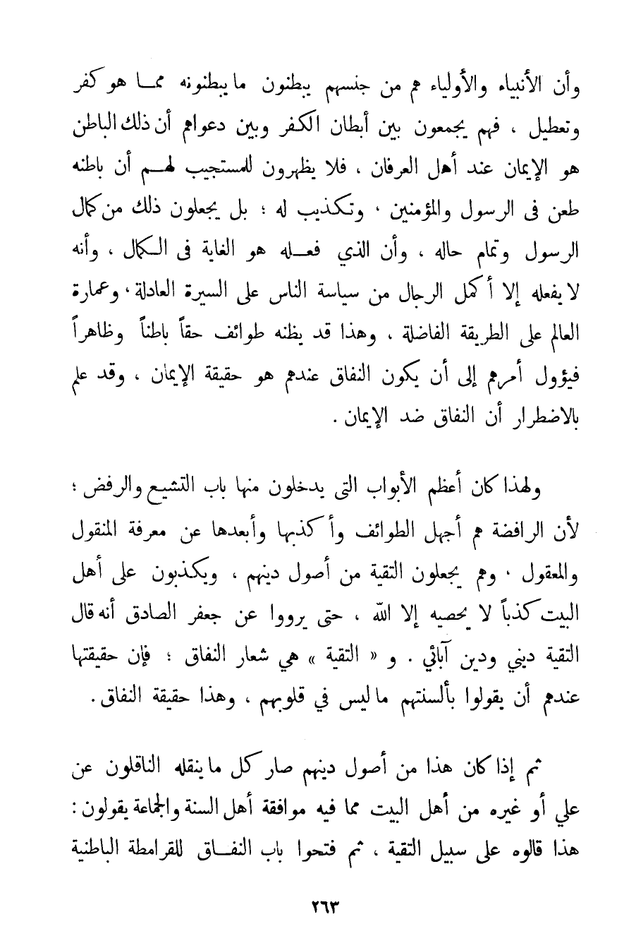 وَأَنَّ الْأَنْبِيَاءَ وَالْأَوْلِيَاءَ هُمْ مِنْ جِنْسِهِمْ يُبْطِنُونَ مَا يُبْطِنُونَهُ مِمَّا هُوَ كُفْرٌ وَتَعْطِيلٌ فَهُمْ يَجْمَعُونَ بَيْنَ إبْطَانِ الْكُفْرِ وَبَيْنَ دَعْوَاهُمْ أَنَّ ذَلِكَ الْبَاطِنَ هُوَ الْإِيمَانُ عِنْدَ أَهْلِ الْعِرْفَانِ فَلَا يُظْهِرُونَ لِلْمُسْتَجِيبِ لَهُمْ أَنَّ بَاطِنَهُ طَعْنٌ فِي الرَّسُولِ وَالْمُؤْمِنِينَ وَتَكْذِيبٌ لَهُ؛ بَلْ يَجْعَلُونَ ذَلِكَ مِنْ كَمَالِ الرَّسُولِ وَتَمَامِ حَالِهِ وَأَنَّ الَّذِي فَعَلَهُ هُوَ الْغَايَةُ فِي الْكَمَالِ وَأَنَّهُ لَا يَفْعَلُهُ إلَّا أَكْمَلُ الرِّجَالِ مِنْ سِيَاسَةِ النَّاسِ عَلَى السِّيرَةِ الْعَادِلَةِ وَعِمَارَةِ الْعَالَمِ عَلَى الطَّرِيقَةِ الْفَاضِلَةِ وَهَذَا قَدْ يَظُنُّهُ طَوَائِفُ حَقًّا بَاطِنًا وَظَاهِرًا فَيَئُولُ أَمْرُهُمْ إلَى أَنْ يَكُونَ النِّفَاقُ عِنْدَهُمْ هُوَ حَقِيقَةُ الْإِيمَانِ وَقَدْ عَلِمَ بِالِاضْطِرَارِ أَنَّ النِّفَاقَ ضِدُّ الْإِيمَانِ. وَلِهَذَا كَانَ أَعْظَمُ الْأَبْوَابِ الَّتِي يَدْخُلُونَ مِنْهَا بَابَ التَّشَيُّعِ وَالرَّفْضِ؛ لِأَنَّ الرَّافِضَةَ هُمْ أَجْهَلُ الطَّوَائِفِ وَأَكْذَبُهَا وَأَبْعَدُهَا عَنْ مَعْرِفَةِ الْمَنْقُولِ وَالْمَعْقُولِ وَهُمْ يَجْعَلُونَ التَّقِيَّةَ مِنْ أُصُولِ دِينِهِمْ وَيَكْذِبُونَ عَلَى أَهْلِ الْبَيْتِ كَذِبًا لَا يُحْصِيهِ إلَّا اللَّهُ حَتَّى يَرْوُوا عَنْ جَعْفَرٍ الصَّادِقِ أَنَّهُ قَالَ التَّقِيَّةُ دِينِي وَدِينُ آبَائِي. و " التَّقِيَّةُ " هِيَ شِعَارُ النِّفَاقِ؛ فَإِنَّ حَقِيقَتَهَا عِنْدَهُمْ أَنْ يَقُولُوا بِأَلْسِنَتِهِمْ مَا لَيْسَ فِي قُلُوبِهِمْ وَهَذَا حَقِيقَةُ النِّفَاقِ. ثُمَّ إذَا كَانَ هَذَا مِنْ أُصُولِ دِينِهِمْ صَارَ كُلُّ مَا يَنْقُلُهُ النَّاقِلُونَ عَنْ عَلِيٍّ أَوْ غَيْرِهِ مِنْ أَهْلِ الْبَيْتِ مِمَّا فِيهِ مُوَافَقَةُ أَهْلِ السُّنَّةِ وَالْجَمَاعَةِ يَقُولُونَ: هَذَا قَالُوهُ عَلَى سَبِيلِ التَّقِيَّةِ ثُمَّ فَتَحُوا بَابَ النِّفَاقِ لِلْقَرَامِطَةِ الْبَاطِنِيَّةِ
