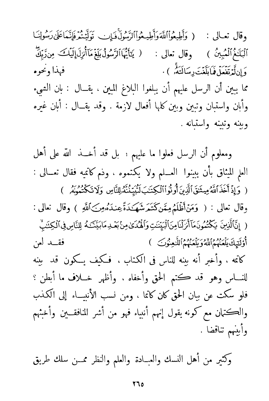 الْبَلَاغُ الْمُبِينُ} وَقَالَ تَعَالَى: {وَأَطِيعُوا اللَّهَ وَأَطِيعُوا الرَّسُولَ فَإِنْ تَوَلَّيْتُمْ فَإِنَّمَا عَلَى رَسُولِنَا الْبَلَاغُ الْمُبِينُ} وَقَالَ تَعَالَى: {يَا أَيُّهَا الرَّسُولُ بَلِّغْ مَا أُنْزِلَ إلَيْكَ مِنْ رَبِّكَ وَإِنْ لَمْ تَفْعَلْ فَمَا بَلَّغْتَ رِسَالَتَهُ} . فَهَذَا وَنَحْوُهُ مِمَّا يُبَيِّنُ أَنَّ الرُّسُلَ عَلَيْهِمْ أَنْ يُبَلِّغُوا الْبَلَاغَ الْمُبِينَ يُقَالُ: بَانَ الشَّيْءُ وَأَبَانَ وَاسْتَبَانَ وَتَبَيَّنَ وَبَيَّنَ كُلُّهَا أَفْعَالٌ لَازِمَةٌ. وَقَدْ يُقَالُ: أَبَانَ غَيْرُهُ وَبَيَّنَهُ وَتَبَيَّنَهُ وَاسْتَبَانَهُ. وَمَعْلُومٌ أَنَّ الرُّسُلَ فَعَلُوا مَا عَلَيْهِمْ؛ بَلْ قَدْ أَخَذَ اللَّهُ عَلَى أَهْلِ الْعِلْمِ الْمِيثَاقَ بِأَنْ يُبَيِّنُوا الْعِلْمَ وَلَا يَكْتُمُوهُ وَذَمَّ كَاتِمِيهِ فَقَالَ تَعَالَى: {وَإِذْ أَخَذَ اللَّهُ مِيثَاقَ الَّذِينَ أُوتُوا الْكِتَابَ لَتُبَيِّنُنَّهُ لِلنَّاسِ وَلَا تَكْتُمُونَهُ} وَقَالَ تَعَالَى: {وَمَنْ أَظْلَمُ مِمَّنْ كَتَمَ شَهَادَةً عِنْدَهُ مِنَ اللَّهِ} وَقَالَ تَعَالَى: {إنَّ الَّذِينَ يَكْتُمُونَ مَا أَنْزَلْنَا مِنَ الْبَيِّنَاتِ وَالْهُدَى مِنْ بَعْدِ مَا بَيَّنَّاهُ لِلنَّاسِ فِي الْكِتَابِ أُولَئِكَ يَلْعَنُهُمُ اللَّهُ وَيَلْعَنُهُمُ اللَّاعِنُونَ} فَقَدْ لَعَنَ كَاتِمَهُ وَأَخْبَرَ أَنَّهُ بَيَّنَهُ لِلنَّاسِ فِي الْكِتَابِ فَكَيْفَ يَكُونُ قَدْ بَيَّنَهُ لِلنَّاسِ وَهُوَ قَدْ كَتَمَ الْحَقَّ وَأَخْفَاهُ وَأَظْهَرَ خِلَافَ مَا أَبْطَنَ؟ فَلَوْ سَكَتَ عَنْ بَيَانِ الْحَقِّ كَانَ كَاتِمًا وَمَنْ نَسَبَ الْأَنْبِيَاءَ إلَى الْكَذِبِ وَالْكِتْمَانِ مَعَ كَوْنِهِ يَقُولُ إنَّهُمْ أَنْبِيَاءُ فَهُوَ مِنْ أَشَرِّ الْمُنَافِقِينَ وَأَخْبَثِهِمْ وَأَبْيَنِهِمْ تَنَاقُضًا. وَكَثِيرٌ مِنْ أَهْلِ النُّسُكِ وَالْعِبَادَةِ وَالْعِلْمِ وَالنَّظَرِ مِمَّنْ سَلَكَ طَرِيقَ