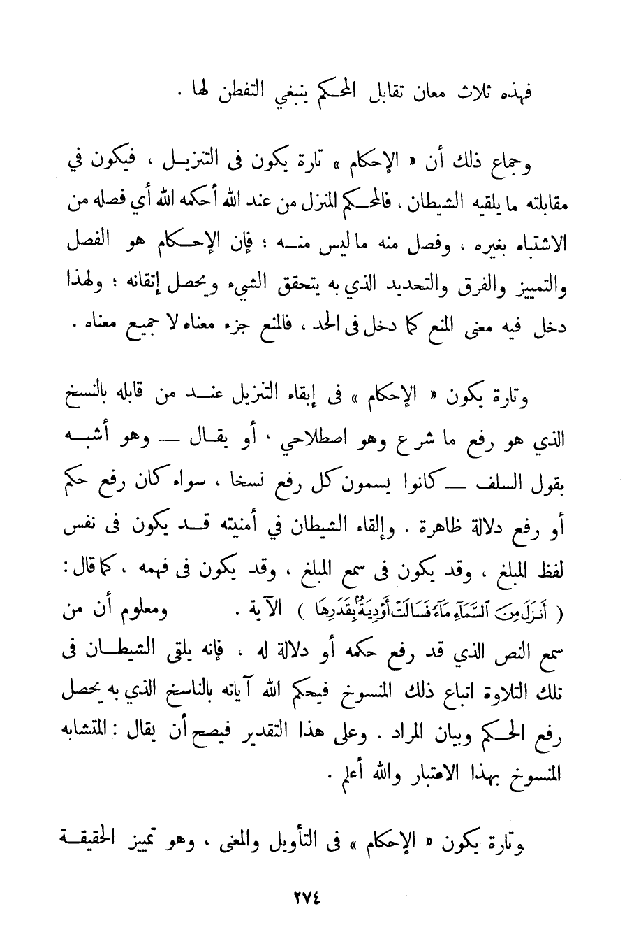 فَهَذِهِ ثَلَاثُ مَعَانٍ تُقَابِلُ الْمُحْكَمَ يَنْبَغِي التَّفَطُّنُ لَهَا. وَجِمَاعُ ذَلِكَ أَنَّ " الْإِحْكَامَ " تَارَةً يَكُونُ فِي التَّنْزِيلِ فَيَكُونُ فِي مُقَابَلَتِهِ مَا يُلْقِيهِ الشَّيْطَانُ فَالْمُحْكَمُ الْمُنَزَّلُ مِنْ عِنْدِ اللَّهِ أَحْكَمَهُ اللَّهُ أَيْ فَصَلَهُ مِنْ الِاشْتِبَاهِ بِغَيْرِهِ وَفَصَلَ مِنْهُ مَا لَيْسَ مِنْهُ؛ فَإِنَّ الْإِحْكَامَ هُوَ الْفَصْلُ وَالتَّمْيِيزُ وَالْفَرْقُ وَالتَّحْدِيدُ الَّذِي بِهِ يَتَحَقَّقُ الشَّيْءُ وَيَحْصُلُ إتْقَانُهُ؛ وَلِهَذَا دَخَلَ فِيهِ مَعْنَى الْمَنْعِ كَمَا دَخَلَ فِي الْحَدِّ فَالْمَنْعُ جُزْءُ مَعْنَاهُ لَا جَمِيعُ مَعْنَاهُ. وَتَارَةً يَكُونُ " الْإِحْكَامُ " فِي إبْقَاءِ التَّنْزِيلِ عِنْدَ مَنْ قَابَلَهُ بِالنَّسْخِ الَّذِي هُوَ رَفْعُ مَا شُرِعَ وَهُوَ اصْطِلَاحِيٌّ أَوْ يُقَالُ - وَهُوَ أَشْبَهُ بِقَوْلِ السَّلَفِ - كَانُوا يُسَمُّونَ كُلَّ رَفْعٍ نَسْخًا سَوَاءٌ كَانَ رَفْعَ حُكْمٍ أَوْ رَفْعَ دَلَالَةٍ ظَاهِرَةٍ. وَإِلْقَاءُ الشَّيْطَانِ فِي أُمْنِيَّتِهِ قَدْ يَكُونُ فِي نَفْسِ لَفْظِ الْمُبَلِّغِ وَقَدْ يَكُونُ فِي سَمْعِ الْمُبَلِّغِ وَقَدْ يَكُونُ فِي فَهْمِهِ كَمَا قَالَ: {أَنْزَلَ مِنَ السَّمَاءِ مَاءً فَسَالَتْ أَوْدِيَةٌ بِقَدَرِهَا} الْآيَةَ. وَمَعْلُومٌ أَنَّ مَنْ سَمِعَ النَّصَّ الَّذِي قَدْ رُفِعَ حُكْمُهُ أَوْ دَلَالَةً لَهُ فَإِنَّهُ يُلْقِي الشَّيْطَانُ فِي تِلْكَ التِّلَاوَةِ اتِّبَاعَ ذَلِكَ الْمَنْسُوخِ فَيُحْكِمُ اللَّهُ آيَاتِهِ بِالنَّاسِخِ الَّذِي بِهِ يَحْصُلُ رَفْعُ الْحُكْمِ وَبَيَانُ الْمُرَادِ. وَعَلَى هَذَا التَّقْدِيرِ فَيَصِحُّ أَنْ يُقَالَ: الْمُتَشَابِهُ الْمَنْسُوخُ بِهَذَا الِاعْتِبَارِ وَاَللَّهُ أَعْلَمُ. وَتَارَةً يَكُونُ " الْإِحْكَامُ " فِي التَّأْوِيلِ وَالْمَعْنَى وَهُوَ تَمْيِيزُ الْحَقِيقَةِ