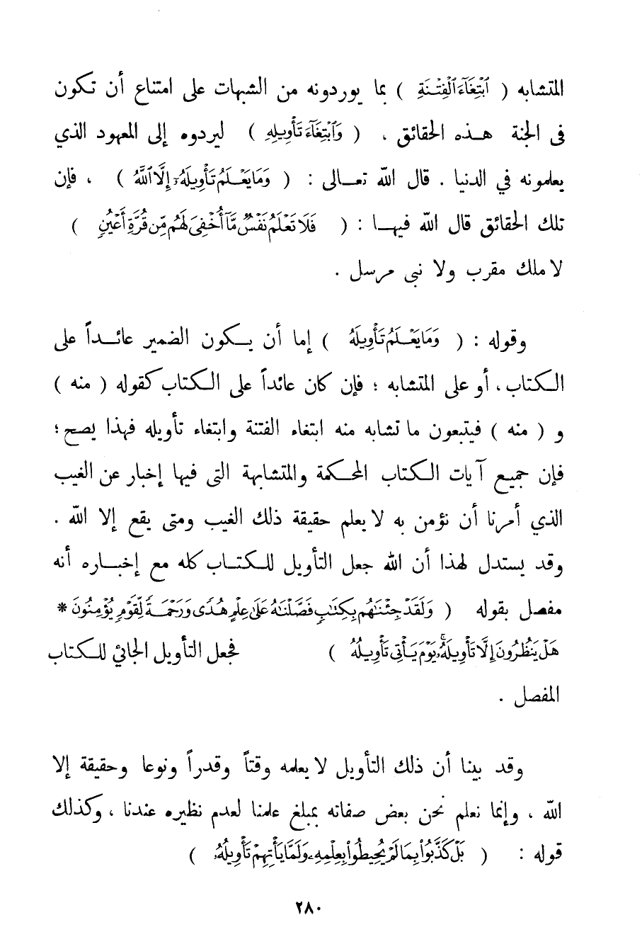 الْمُتَشَابِهَ {ابْتِغَاءَ الْفِتْنَةِ} بِمَا يُورِدُونَهُ مِنْ الشُّبُهَاتِ عَلَى امْتِنَاعِ أَنْ تَكُونَ فِي الْجَنَّةِ هَذِهِ الْحَقَائِقُ {وَابْتِغَاءَ تَأْوِيلِهِ} لِيَرُدُّوهُ إلَى الْمَعْهُودِ الَّذِي يَعْلَمُونَهُ فِي الدُّنْيَا. قَالَ اللَّهُ تَعَالَى: {وَمَا يَعْلَمُ تَأْوِيلَهُ إلَّا اللَّهُ} فَإِنَّ تِلْكَ الْحَقَائِقَ قَالَ اللَّهُ فِيهَا: {فَلَا تَعْلَمُ نَفْسٌ مَا أُخْفِيَ لَهُمْ مِنْ قُرَّةِ أَعْيُنٍ} لَا مَلَكٌ مُقَرَّبٌ وَلَا نَبِيٌّ مُرْسَلٌ. وَقَوْلُهُ: {وَمَا يَعْلَمُ تَأْوِيلَهُ} إمَّا أَنْ يَكُونَ الضَّمِيرُ عَائِدًا عَلَى الْكِتَابِ أَوْ عَلَى الْمُتَشَابِهِ؛ فَإِنْ كَانَ عَائِدًا عَلَى الْكِتَابِ كَقَوْلِهِ (مِنْهُ و (مِنْهُ {فَيَتَّبِعُونَ مَا تَشَابَهَ مِنْهُ ابْتِغَاءَ الْفِتْنَةِ وَابْتِغَاءَ تَأْوِيلِهِ} فَهَذَا يَصِحُّ؛ فَإِنَّ جَمِيعَ آيَاتِ الْكِتَابِ الْمُحْكَمَةِ وَالْمُتَشَابِهَةِ الَّتِي فِيهَا إخْبَارٌ عَنْ الْغَيْبِ الَّذِي أُمِرْنَا أَنْ نُؤْمِنَ بِهِ لَا يَعْلَمُ حَقِيقَةَ ذَلِكَ الْغَيْبِ وَمَتَى يَقَعُ إلَّا اللَّهُ. وَقَدْ يُسْتَدَلُّ لِهَذَا أَنَّ اللَّهَ جَعَلَ التَّأْوِيلَ لِلْكِتَابِ كُلِّهِ مَعَ إخْبَارِهِ أَنَّهُ مُفَصَّلٌ بِقَوْلِهِ {وَلَقَدْ جِئْنَاهُمْ بِكِتَابٍ فَصَّلْنَاهُ عَلَى عِلْمٍ هُدًى وَرَحْمَةً لِقَوْمٍ يُؤْمِنُونَ} {هَلْ يَنْظُرُونَ إلَّا تَأْوِيلَهُ يَوْمَ يَأْتِي تَأْوِيلُهُ} فَجَعَلَ التَّأْوِيلَ الْجَائِي لِلْكِتَابِ الْمُفَصَّلِ. وَقَدْ بَيَّنَّا أَنَّ ذَلِكَ التَّأْوِيلَ لَا يَعْلَمُهُ وَقْتًا وَقَدْرًا وَنَوْعًا وَحَقِيقَةً إلَّا اللَّهُ وَإِنَّمَا نَعْلَمُ نَحْنُ بَعْضَ صِفَاتِهِ بِمَبْلَغِ عِلْمِنَا لِعَدَمِ نَظِيرِهِ عِنْدَنَا وَكَذَلِكَ قَوْلُهُ: {بَلْ كَذَّبُوا بِمَا لَمْ يُحِيطُوا بِعِلْمِهِ وَلَمَّا يَأْتِهِمْ تَأْوِيلُهُ}