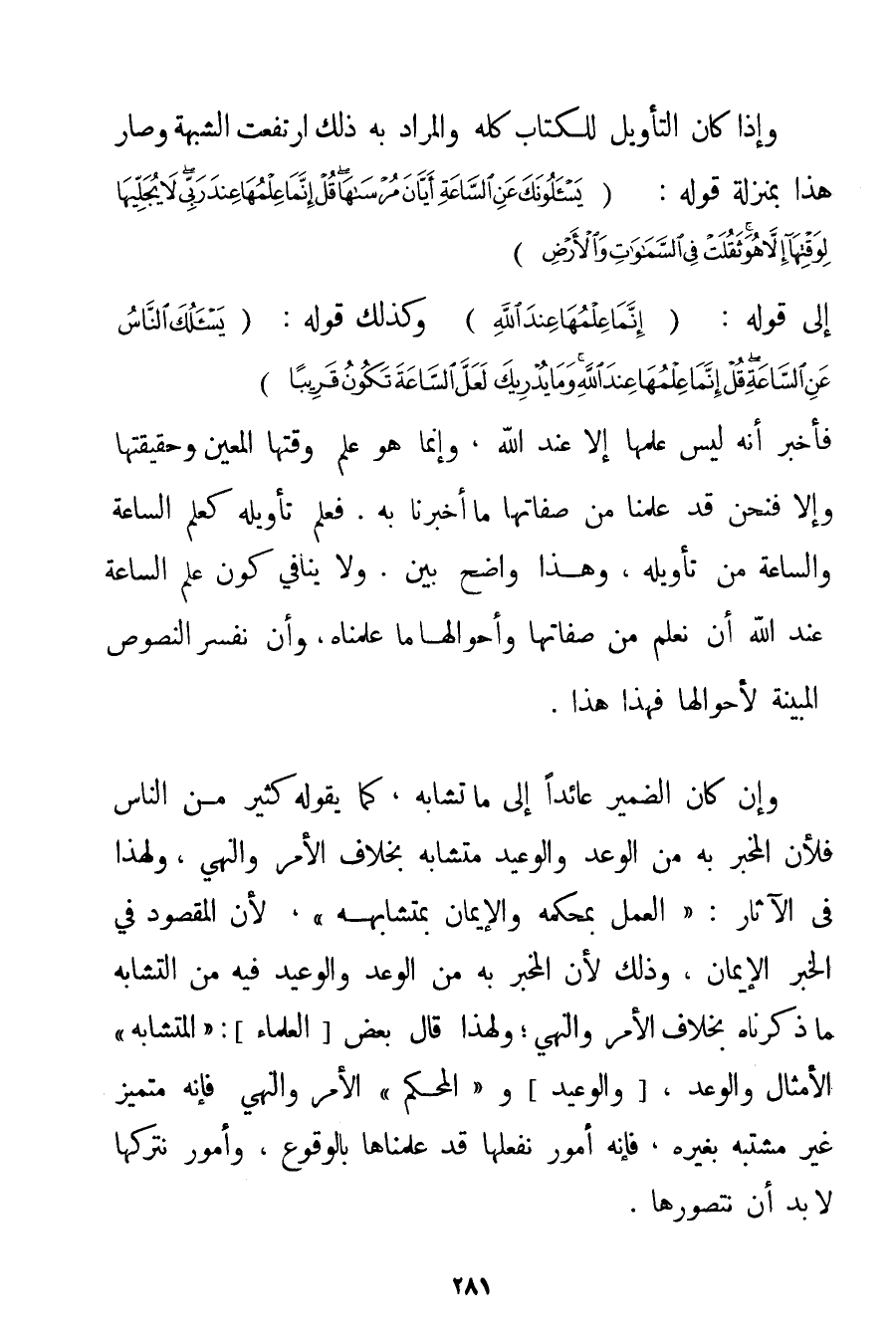 وَإِذَا كَانَ التَّأْوِيلُ لِلْكِتَابِ كُلِّهِ وَالْمُرَادُ بِهِ ذَلِكَ ارْتَفَعَتْ الشُّبْهَةُ وَصَارَ هَذَا بِمَنْزِلَةِ قَوْلِهِ: {يَسْأَلُونَكَ عَنِ السَّاعَةِ أَيَّانَ مُرْسَاهَا قُلْ إنَّمَا عِلْمُهَا عِنْدَ رَبِّي لَا يُجَلِّيهَا لِوَقْتِهَا إلَّا هُوَ ثَقُلَتْ فِي السَّمَاوَاتِ وَالْأَرْضِ} إلَى قَوْلِهِ: {إنَّمَا عِلْمُهَا عِنْدَ اللَّهِ} وَكَذَلِكَ قَوْلُهُ: {يَسْأَلُكَ النَّاسُ عَنِ السَّاعَةِ قُلْ إنَّمَا عِلْمُهَا عِنْدَ اللَّهِ وَمَا يُدْرِيكَ لَعَلَّ السَّاعَةَ تَكُونُ قَرِيبًا} فَأَخْبَرَ أَنَّهُ لَيْسَ عِلْمُهَا إلَّا عِنْدَ اللَّهِ وَإِنَّمَا هُوَ عِلْمُ وَقْتِهَا الْمُعَيَّنِ وَحَقِيقَتِهَا وَإِلَّا فَنَحْنُ قَدْ عَلِمْنَا مِنْ صِفَاتِهَا مَا أَخْبَرَنَا بِهِ. فَعِلْمُ تَأْوِيلِهِ كَعِلْمِ السَّاعَةِ وَالسَّاعَةُ مِنْ تَأْوِيلِهِ وَهَذَا وَاضِحٌ بَيِّنٌ. وَلَا يُنَافِي كَوْنَ عِلْمِ السَّاعَةِ عِنْدَ اللَّهِ أَنْ نَعْلَمَ مِنْ صِفَاتِهَا وَأَحْوَالِهَا مَا عَلِمْنَاهُ وَأَنْ نُفَسِّرَ النُّصُوصَ الْمُبَيِّنَةَ لِأَحْوَالِهَا فَهَذَا هَذَا. وَإِنْ كَانَ الضَّمِيرُ عَائِدًا إلَى مَا تَشَابَهَ كَمَا يَقُولُهُ كَثِيرٌ مِنْ النَّاسِ فَلِأَنَّ الْمُخْبَرَ بِهِ مِنْ الْوَعْدِ وَالْوَعِيدِ مُتَشَابِهٌ بِخِلَافِ الْأَمْرِ وَالنَّهْيِ وَلِهَذَا فِي الْآثَارِ: " الْعَمَلُ بِمُحْكَمِهِ وَالْإِيمَانُ بِمُتَشَابِهِهِ " لِأَنَّ الْمَقْصُودَ فِي الْخَبَرِ الْإِيمَانُ وَذَلِكَ لِأَنَّ الْمُخْبَرَ بِهِ مِنْ الْوَعْدِ وَالْوَعِيدِ فِيهِ مِنْ التَّشَابُهِ مَا ذَكَرْنَاهُ بِخِلَافِ الْأَمْرِ وَالنَّهْيِ؛ وَلِهَذَا قَالَ بَعْضُ الْعُلَمَاءِ: " الْمُتَشَابِهُ " الْأَمْثَالُ وَالْوَعْدُ وَالْوَعِيدُ و " الْمُحْكَمُ " الْأَمْرُ وَالنَّهْيُ فَإِنَّهُ مُتَمَيِّزٌ غَيْرُ مُشْتَبِهٍ بِغَيْرِهِ فَإِنَّهُ أُمُورٌ نَفْعَلُهَا قَدْ عَلِمْنَاهَا بِالْوُقُوعِ وَأُمُورٌ نَتْرُكُهَا لَا بُدَّ أَنْ نَتَصَوَّرَهَا.