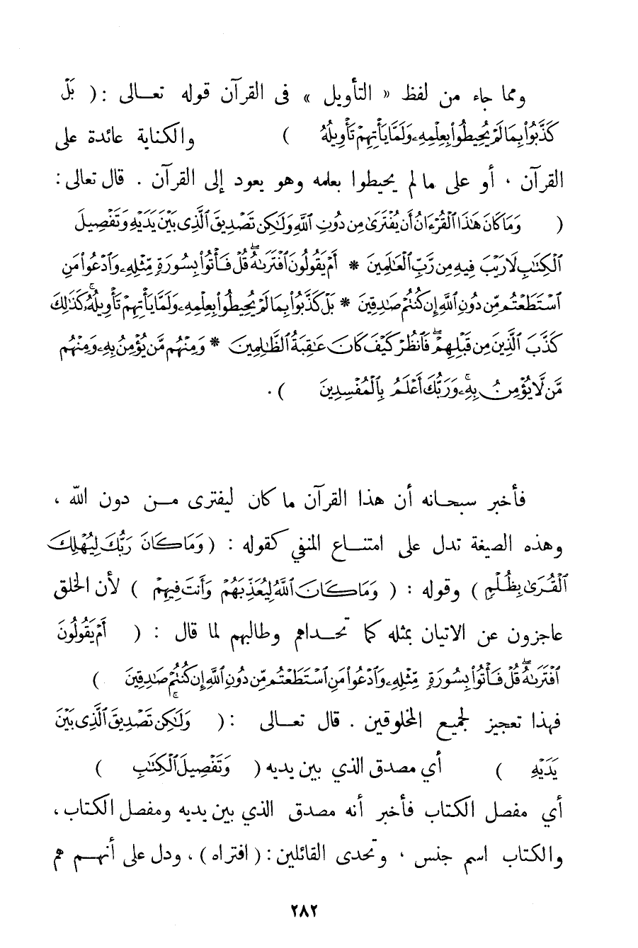 وَمِمَّا جَاءَ مِنْ لَفْظِ " التَّأْوِيلِ " فِي الْقُرْآنِ قَوْله تَعَالَى {بَلْ كَذَّبُوا بِمَا لَمْ يُحِيطُوا بِعِلْمِهِ وَلَمَّا يَأْتِهِمْ تَأْوِيلُهُ} وَالْكِنَايَةُ عَائِدَةٌ عَلَى الْقُرْآنِ أَوْ عَلَى مَا لَمْ يُحِيطُوا بِعِلْمِهِ وَهُوَ يَعُودُ إلَى الْقُرْآنِ. قَالَ تَعَالَى: {وَمَا كَانَ هَذَا الْقُرْآنُ أَنْ يُفْتَرَى مِنْ دُونِ اللَّهِ وَلَكِنْ تَصْدِيقَ الَّذِي بَيْنَ يَدَيْهِ وَتَفْصِيلَ الْكِتَابِ لَا رَيْبَ فِيهِ مِنْ رَبِّ الْعَالَمِينَ} {أَمْ يَقُولُونَ افْتَرَاهُ قُلْ فَأْتُوا بِسُورَةٍ مِثْلِهِ وَادْعُوا مَنِ اسْتَطَعْتُمْ مِنْ دُونِ اللَّهِ إنْ كُنْتُمْ صَادِقِينَ} {بَلْ كَذَّبُوا بِمَا لَمْ يُحِيطُوا بِعِلْمِهِ وَلَمَّا يَأْتِهِمْ تَأْوِيلُهُ كَذَلِكَ كَذَّبَ الَّذِينَ مِنْ قَبْلِهِمْ فَانْظُرْ كَيْفَ كَانَ عَاقِبَةُ الظَّالِمِينَ} {وَمِنْهُمْ مَنْ يُؤْمِنُ بِهِ وَمِنْهُمْ مَنْ لَا يُؤْمِنُ بِهِ وَرَبُّكَ أَعْلَمُ بِالْمُفْسِدِينَ} . فَأَخْبَرَ سُبْحَانَهُ أَنَّ هَذَا الْقُرْآنَ مَا كَانَ لِيُفْتَرَى مِنْ دُونِ اللَّهِ وَهَذِهِ الصِّيغَةُ تَدُلُّ عَلَى امْتِنَاعِ الْمَنْفِيِّ كَقَوْلِهِ: {وَمَا كَانَ رَبُّكَ لِيُهْلِكَ الْقُرَى بِظُلْمٍ} وَقَوْلِهِ: {وَمَا كَانَ اللَّهُ لِيُعَذِّبَهُمْ وَأَنْتَ فِيهِمْ} لِأَنَّ الْخَلْقَ عَاجِزُونَ عَنْ الْإِتْيَانِ بِمِثْلِهِ كَمَا تَحَدَّاهُمْ وَطَالَبَهُمْ لَمَّا قَالَ: {أَمْ يَقُولُونَ افْتَرَاهُ قُلْ فَأْتُوا بِسُورَةٍ مِثْلِهِ وَادْعُوا مَنِ اسْتَطَعْتُمْ مِنْ دُونِ اللَّهِ إنْ كُنْتُمْ صَادِقِينَ} فَهَذَا تَعْجِيزٌ لِجَمِيعِ الْمَخْلُوقِينَ. قَالَ تَعَالَى: {وَلَكِنْ تَصْدِيقَ الَّذِي بَيْنَ يَدَيْهِ} أَيْ مُصَدِّقَ الَّذِي بَيْنَ يَدَيْهِ {وَتَفْصِيلَ الْكِتَابِ} أَيْ مُفَصِّلَ الْكِتَابِ فَأَخْبَرَ أَنَّهُ مُصَدِّقُ الَّذِي بَيْنَ يَدَيْهِ وَمُفَصَّلُ الْكِتَابِ وَالْكِتَابُ اسْمُ جِنْسٍ وَتَحَدَّى الْقَائِلِينَ: افْتَرَاهُ وَدَلَّ عَلَى أَنَّهُمْ هُمْ