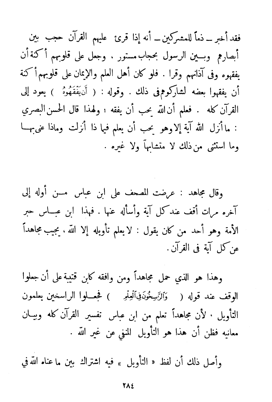 الْقُرْآنِ وَحْدَهُ وَلَّوْا عَلَى أَدْبَارِهِمْ نُفُورًا} فَقَدْ أَخْبَرَ - ذَمًّا لِلْمُشْرِكِينَ - أَنَّهُ إذَا قُرِئَ عَلَيْهِمْ الْقُرْآنُ حُجِبَ بَيْنَ أَبْصَارِهِمْ وَبَيْنَ الرَّسُولِ بِحِجَابِ مَسْتُورٍ وَجَعَلَ عَلَى قُلُوبِهِمْ أَكِنَّةً أَنْ يَفْقَهُوهُ وَفِي آذَانِهِمْ وَقْرًا. فَلَوْ كَانَ أَهْلُ الْعِلْمِ وَالْإِيمَانِ عَلَى قُلُوبِهِمْ أَكِنَّةٌ أَنْ يَفْقَهُوا بَعْضَهُ لَشَارَكُوهُمْ فِي ذَلِكَ. وَقَوْلُهُ: {أَنْ يَفْقَهُوهُ} يَعُودُ إلَى الْقُرْآنِ كُلِّهِ. فَعَلِمَ أَنَّ اللَّهَ يُحِبُّ أَنْ يُفْقَهَ؛ وَلِهَذَا قَالَ الْحَسَنُ الْبَصْرِيُّ: مَا أَنْزَلَ اللَّهُ آيَةً إلَّا وَهُوَ يُحِبُّ أَنْ يُعْلَمَ فِي مَاذَا أُنْزِلَتْ وَمَاذَا عَنَى بِهَا وَمَا اسْتَثْنَى مِنْ ذَلِكَ لَا مُتَشَابِهًا وَلَا غَيْرَهُ. وَقَالَ مُجَاهِدٌ: عَرَضْت الْمُصْحَفَ عَلَى ابْنِ عَبَّاسٍ مِنْ أَوَّلِهِ إلَى آخِرِهِ مَرَّاتٍ أَقِفُ عِنْدَ كُلِّ آيَةٍ وَأَسْأَلُهُ عَنْهَا. فَهَذَا ابْنُ عَبَّاسٍ حَبْرُ الْأُمَّةِ وَهُوَ أَحَدُ مَنْ كَانَ يَقُولُ: لَا يَعْلَمُ تَأْوِيلَهُ إلَّا اللَّهُ يُجِيبُ مُجَاهِدًا عَنْ كُلِّ آيَةٍ فِي الْقُرْآنِ. وَهَذَا هُوَ الَّذِي حَمَلَ مُجَاهِدًا وَمَنْ وَافَقَهُ كَابْنِ قُتَيْبَةَ عَلَى أَنْ جَعَلُوا الْوَقْفَ عِنْدَ قَوْلِهِ {وَالرَّاسِخُونَ فِي الْعِلْمِ} فَجَعَلُوا الرَّاسِخِينَ يَعْلَمُونَ التَّأْوِيلَ لِأَنَّ مُجَاهِدًا تَعَلَّمَ مِنْ ابْنِ عَبَّاسٍ تَفْسِيرَ الْقُرْآنِ كُلِّهِ وَبَيَانَ مَعَانِيهِ فَظَنَّ أَنَّ هَذَا هُوَ التَّأْوِيلُ الْمَنْفِيُّ عَنْ غَيْرِ اللَّهِ. وَأَصْلُ ذَلِكَ أَنَّ لَفْظَ " التَّأْوِيلِ " فِيهِ اشْتِرَاكٌ بَيْنَ مَا عَنَاهُ اللَّهُ فِي