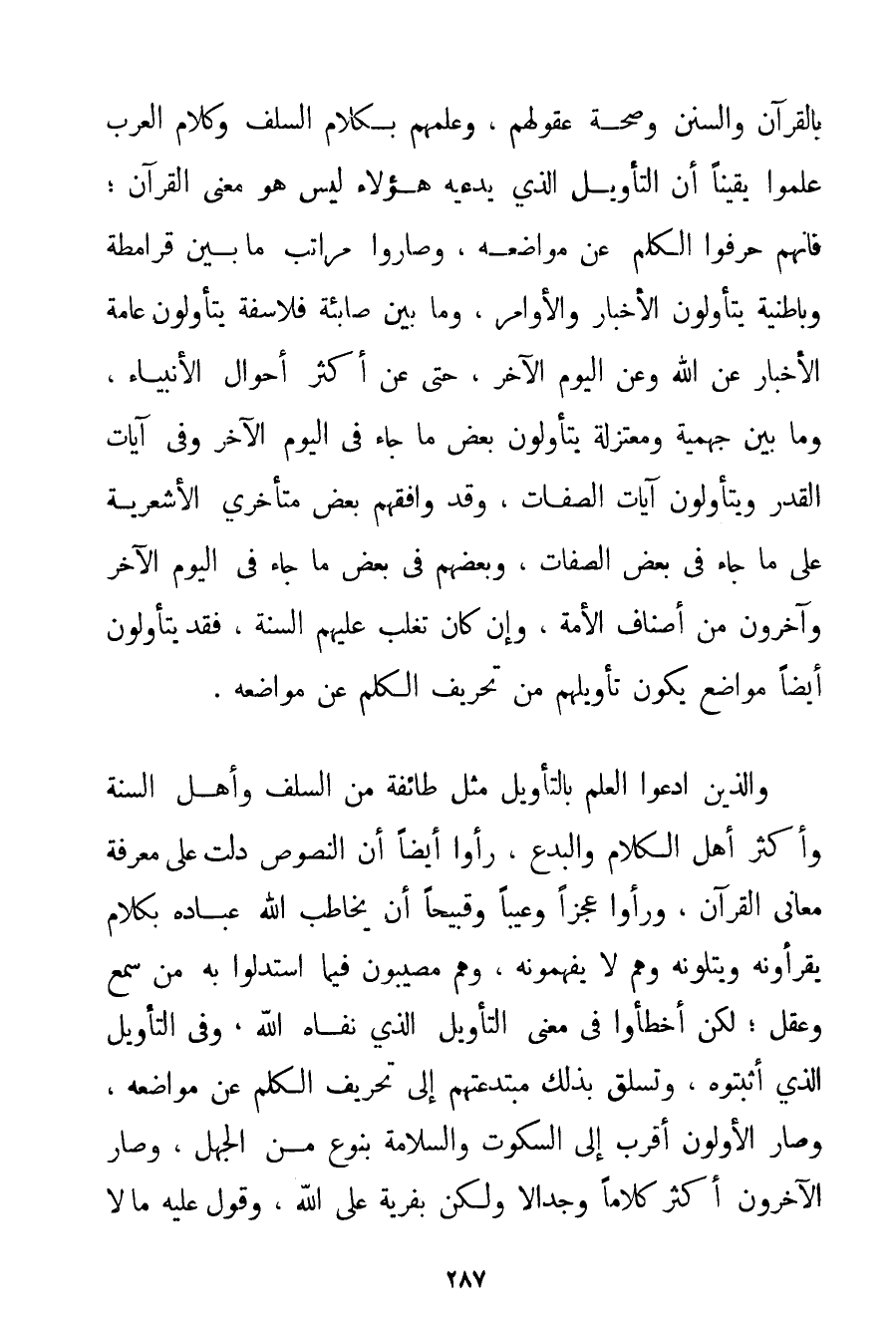 بِالْقُرْآنِ وَالسُّنَنِ وَصِحَّةِ عُقُولِهِمْ وَعِلْمِهِمْ بِكَلَامِ السَّلَفِ وَكَلَامِ الْعَرَبِ عَلِمُوا يَقِينًا أَنَّ التَّأْوِيلَ الَّذِي يَدَّعِيهِ هَؤُلَاءِ لَيْسَ هُوَ مَعْنَى الْقُرْآنِ؛ فَإِنَّهُمْ حَرَّفُوا الْكَلِمَ عَنْ مَوَاضِعِهِ وَصَارُوا مَرَاتِبَ مَا بَيْنَ قَرَامِطَةٍ وَبَاطِنِيَّةٍ يَتَأَوَّلُونَ الْأَخْبَارَ وَالْأَوَامِرَ وَمَا بَيْنَ صَابِئَةٍ فَلَاسِفَةٍ يَتَأَوَّلُونَ عَامَّةَ الْأَخْبَارِ عَنْ اللَّهِ وَعَنْ الْيَوْمِ الْآخِرِ حَتَّى عَنْ أَكْثَرِ أَحْوَالِ الْأَنْبِيَاءِ وَمَا بَيْنَ جهمية وَمُعْتَزِلَةٍ يَتَأَوَّلُونَ بَعْضَ مَا جَاءَ فِي الْيَوْمِ الْآخِرِ وَفِي آيَاتِ الْقَدَرِ وَيَتَأَوَّلُونَ آيَاتِ الصِّفَاتِ وَقَدْ وَافَقَهُمْ بَعْضُ مُتَأَخِّرِي الْأَشْعَرِيَّةِ عَلَى مَا جَاءَ فِي بَعْضِ الصِّفَاتِ وَبَعْضُهُمْ فِي بَعْضِ مَا جَاءَ فِي الْيَوْمِ الْآخِرِ وَآخَرُونَ مِنْ أَصْنَافِ الْأُمَّةِ وَإِنْ كَانَ تَغْلِبُ عَلَيْهِمْ السُّنَّةُ فَقَدْ يَتَأَوَّلُونَ أَيْضًا مَوَاضِعَ يَكُونُ تَأْوِيلُهُمْ مِنْ تَحْرِيفِ الْكَلِمِ عَنْ مَوَاضِعِهِ. وَاَلَّذِينَ ادَّعَوْا الْعِلْمَ بِالتَّأْوِيلِ مِثْلُ طَائِفَةٍ مِنْ السَّلَفِ وَأَهْلِ السُّنَّةِ وَأَكْثَرِ أَهْلِ الْكَلَامِ وَالْبِدَعِ رَأَوْا أَيْضًا أَنَّ النُّصُوصَ دَلَّتْ عَلَى مَعْرِفَةِ مَعَانِي الْقُرْآنِ وَرَأَوْا عَجْزًا وَعَيْبًا وَقَبِيحًا أَنْ يُخَاطِبَ اللَّهُ عِبَادَهُ بِكَلَامِ يَقْرَءُونَهُ وَيَتْلُونَهُ وَهُمْ لَا يَفْهَمُونَهُ وَهُمْ مُصِيبُونَ فِيمَا اسْتَدَلُّوا بِهِ مِنْ سَمْعٍ وَعَقْلٍ؛ لَكِنْ أَخْطَئُوا فِي مَعْنَى التَّأْوِيلِ الَّذِي نَفَاهُ اللَّهُ وَفِي التَّأْوِيلِ الَّذِي أَثْبَتُوهُ وَتَسَلَّقَ بِذَلِكَ مُبْتَدِعَتُهُمْ إلَى تَحْرِيفِ الْكَلِمِ عَنْ مَوَاضِعِهِ وَصَارَ الْأَوَّلُونَ أَقْرَبَ إلَى السُّكُوتِ وَالسَّلَامَةِ بِنَوْعِ مِنْ الْجَهْلِ وَصَارَ الْآخَرُونَ أَكْثَرَ كَلَامًا وَجِدَالًا وَلَكِنْ بِفِرْيَةِ عَلَى اللَّهِ وَقَوْلٍ عَلَيْهِ مَا لَا