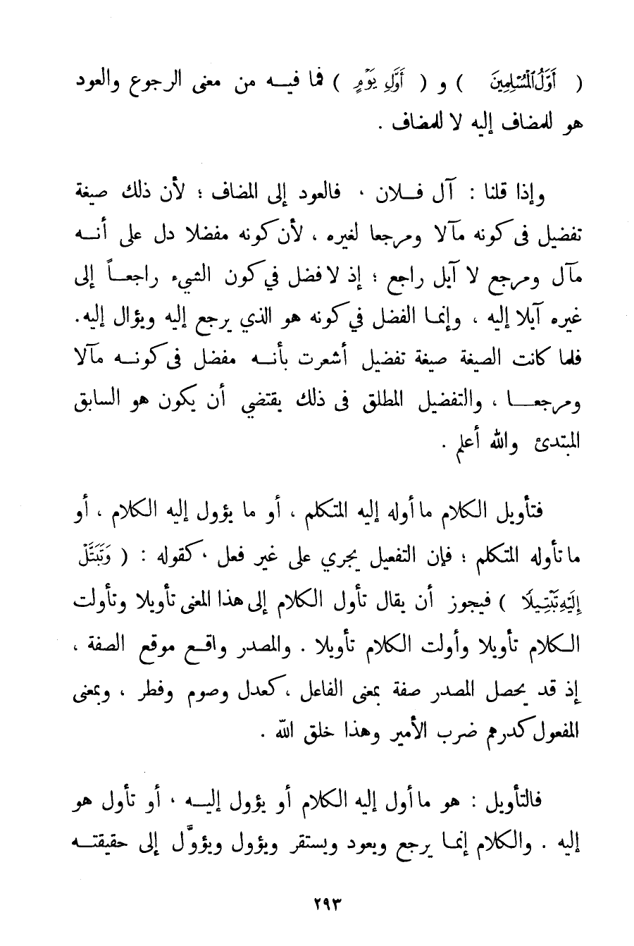 أَوَّلُ الْمُسْلِمِينَ وأَوَّلُ يَوْمٍ فَمَا فِيهِ مِنْ مَعْنَى الرُّجُوعِ وَالْعَوْدِ هُوَ لِلْمُضَافِ إلَيْهِ لَا لِلْمُضَافِ. وَإِذَا قُلْنَا: آلُ فُلَانٍ فَالْعَوْدُ إلَى الْمُضَافِ؛ لِأَنَّ ذَلِكَ صِيغَةُ تَفْضِيلٍ فِي كَوْنِهِ مَآلًا وَمَرْجِعًا لِغَيْرِهِ لِأَنَّ كَوْنَهُ مُفَضَّلًا دَلَّ عَلَى أَنَّهُ مَآلٌ وَمَرْجِعٌ لَا آيِلٌ رَاجِعٌ؛ إذْ لَا فَضْلَ فِي كَوْنِ الشَّيْءِ رَاجِعًا إلَى غَيْرِهِ آيِلًا إلَيْهِ وَإِنَّمَا الْفَضْلُ فِي كَوْنِهِ هُوَ الَّذِي يُرْجَعُ إلَيْهِ وَيُؤَالُ إلَيْهِ. فَلَمَّا كَانَتْ الصِّيغَةُ صِيغَةَ تَفْضِيلٍ أَشْعَرَتْ بِأَنَّهُ مُفَضَّلٌ فِي كَوْنِهِ مَآلًا وَمَرْجِعًا وَالتَّفْضِيلُ الْمُطْلَقُ فِي ذَلِكَ يَقْتَضِي أَنْ يَكُونَ هُوَ السَّابِقَ الْمُبْتَدِئَ وَاَللَّهُ أَعْلَمُ. فَتَأْوِيلُ الْكَلَامِ مَا أَوَّلَهُ إلَيْهِ الْمُتَكَلِّمُ أَوْ مَا يُؤَوَّلُ إلَيْهِ الْكَلَامُ أَوْ مَا تَأَوَّلَهُ الْمُتَكَلِّمُ؛ فَإِنَّ التَّفْعِيلَ يَجْرِي عَلَى غَيْرِ فِعْلٍ كَقَوْلِ: {وَتَبَتَّلْ إلَيْهِ تَبْتِيلًا} فَيَجُوزُ أَنْ يُقَالَ تَأَوَّلَ الْكَلَامُ إلَى هَذَا الْمَعْنَى تَأْوِيلًا وَتَأَوَّلْت الْكَلَامَ تَأْوِيلًا وَأَوَّلْت الْكَلَامَ تَأْوِيلًا. وَالْمَصْدَرُ وَاقِعٌ مَوْقِعَ الصِّفَةِ إذْ قَدْ يَحْصُلُ الْمَصْدَرُ صِفَةً بِمَعْنَى الْفَاعِلِ كَعَدْلِ وَصَوْمٍ وَفِطْرٍ وَبِمَعْنَى الْمَفْعُولِ كَدِرْهَمِ ضَرْبِ الْأَمِيرِ وَهَذَا خَلْقُ اللَّهِ. فَالتَّأْوِيلُ: هُوَ مَا أُوِّلَ إلَيْهِ الْكَلَامُ أَوْ يُؤَوَّلُ إلَيْهِ أَوْ تَأَوَّلَ هُوَ إلَيْهِ. وَالْكَلَامُ إنَّمَا يَرْجِعُ وَيَعُودُ وَيَسْتَقِرُّ وَيَؤُولُ وَيُؤَوَّلُ إلَى حَقِيقَتِهِ