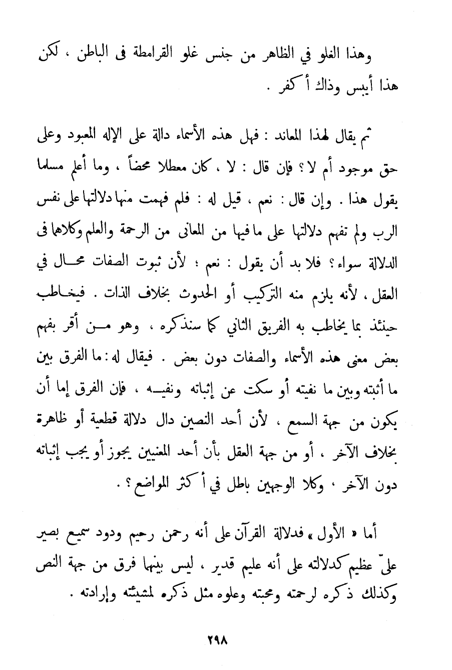 الْغُلُوُّ فِي الظَّاهِرِ مِنْ جِنْسِ غُلُوِّ الْقَرَامِطَةِ فِي الْبَاطِنِ لَكِنَّ هَذَا أَيْبَسُ وَذَاكَ أَكْفَرُ. ثُمَّ يُقَالُ لِهَذَا الْمُعَانِدِ: فَهَلْ هَذِهِ الْأَسْمَاءُ دَالَّةٌ عَلَى الْإِلَهِ الْمَعْبُودِ وَعَلَى حَقٍّ مَوْجُودٍ أَمْ لَا؟ فَإِنْ قَالَ: لَا كَانَ مُعَطِّلًا مَحْضًا وَمَا أَعْلَمُ مُسْلِمًا يَقُولُ هَذَا. وَإِنْ قَالَ: نَعَمْ قِيلَ لَهُ: فَلِمَ فَهِمْت مِنْهَا دَلَالَتَهَا عَلَى نَفْسِ الرَّبِّ وَلَمْ تَفْهَمْ دَلَالَتَهَا عَلَى مَا فِيهَا مِنْ الْمَعَانِي مِنْ الرَّحْمَةِ وَالْعِلْمِ وَكِلَاهُمَا فِي الدَّلَالَةِ سَوَاءٌ؟ فَلَا بُدَّ أَنْ يَقُولَ: نَعَمْ؛ لِأَنَّ ثُبُوتَ الصِّفَاتِ مُحَالٌ فِي الْعَقْلِ لِأَنَّهُ يَلْزَمُ مِنْهُ التَّرْكِيبُ أَوْ الْحُدُوثُ بِخِلَافِ الذَّاتِ. فَيُخَاطَبُ حِينَئِذٍ بِمَا يُخَاطَبُ بِهِ الْفَرِيقُ الثَّانِي كَمَا سَنَذْكُرُهُ وَهُوَ مَنْ أَقَرَّ بِفَهْمِ بَعْضِ مَعْنَى هَذِهِ الْأَسْمَاءِ وَالصِّفَاتِ دُونَ بَعْضٍ. فَيُقَالُ لَهُ: مَا الْفَرْقُ بَيْنَ مَا أَثَبَتّه وَبَيْنَ مَا نَفَيْته أَوْ سَكَتّ عَنْ إثْبَاتِهِ وَنَفْيِهِ فَإِنَّ الْفَرْقَ إمَّا أَنْ يَكُونَ مِنْ جِهَةِ السَّمْعِ لِأَنَّ أَحَدَ النَّصَّيْنِ دَالٌّ دَلَالَةً قَطْعِيَّةً أَوْ ظَاهِرَةً بِخِلَافِ الْآخَرِ أَوْ مِنْ جِهَةِ الْعَقْلِ بِأَنَّ أَحَدَ الْمَعْنَيَيْنِ يَجُوزُ أَوْ يَجِبُ إثْبَاتُهُ دُونَ الْآخَرِ وَكِلَا الْوَجْهَيْنِ بَاطِلٌ فِي أَكْثَرِ الْمَوَاضِعِ؟ . أَمَّا " الْأَوَّلُ " فَدَلَالَةُ الْقُرْآنِ عَلَى أَنَّهُ رَحْمَنٌ رَحِيمٌ وَدُودٌ سَمِيعٌ بَصِيرٌ عَلِيٌّ عَظِيمٌ كَدَلَالَتِهِ عَلَى أَنَّهُ عَلِيمٌ قَدِيرٌ لَيْسَ بَيْنَهُمَا فَرْقٌ مِنْ جِهَةِ النَّصِّ وَكَذَلِكَ ذَكَرَهُ لِرَحْمَتِهِ وَمَحَبَّتِهِ وَعُلُوِّهِ مِثْلَ ذِكْرِهِ لِمَشِيئَتِهِ وَإِرَادَتِهِ.