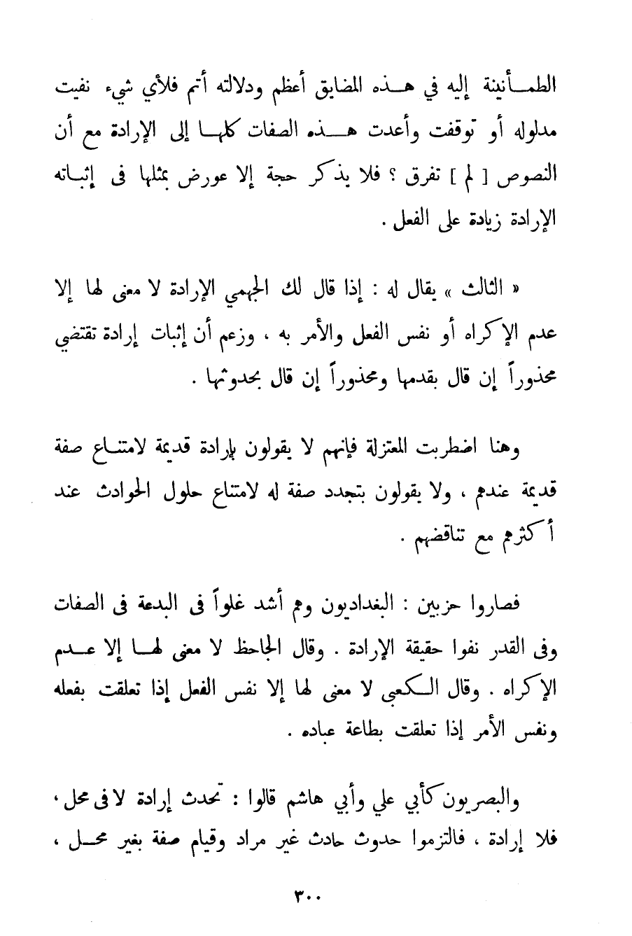 الطُّمَأْنِينَةُ إلَيْهِ فِي هَذِهِ الْمَضَايِقِ أَعْظَمُ وَدَلَالَتُهُ أَتَمُّ فَلِأَيِّ شَيْءٍ نَفَيْت مَدْلُولَهُ أَوْ تَوَقَّفْت وَأَعَدْت هَذِهِ الصِّفَاتِ كُلَّهَا إلَى الْإِرَادَةِ مَعَ أَنَّ النُّصُوصَ لَمْ تُفَرِّقْ؟ فَلَا يَذْكُرُ حُجَّةً إلَّا عُورِضَ بِمِثْلِهَا فِي إثْبَاتِهِ الْإِرَادَةَ زِيَادَةً عَلَى الْفِعْلِ. " الثَّالِثُ " يُقَالُ لَهُ: إذَا قَالَ لَك الجهمي الْإِرَادَةُ لَا مَعْنَى لَهَا إلَّا عَدَمَ الْإِكْرَاهِ أَوْ نَفْسَ الْفِعْلِ وَالْأَمْرِ بِهِ وَزَعَمَ أَنَّ إثْبَاتَ إرَادَةٍ تَقْتَضِي مَحْذُورًا إنْ قَالَ بِقِدَمِهَا وَمَحْذُورًا إنْ قَالَ بِحُدُوثِهَا. وَهُنَا اضْطَرَبَتْ الْمُعْتَزِلَةُ فَإِنَّهُمْ لَا يَقُولُونَ بِإِرَادَةِ قَدِيمَةٍ لِامْتِنَاعِ صِفَةٍ قَدِيمَةٍ عِنْدَهُمْ وَلَا يَقُولُونَ بِتَجَدُّدِ صِفَةٍ لَهُ لِامْتِنَاعِ حُلُولِ الْحَوَادِثِ عِنْدَ أَكْثَرِهِمْ مَعَ تَنَاقُضِهِمْ. فَصَارُوا حِزْبَيْنِ: الْبَغْدَادِيُّونَ وَهُمْ أَشَدُّ غُلُوًّا فِي الْبِدْعَةِ فِي الصِّفَاتِ وَفِي الْقَدَرِ نَفَوْا حَقِيقَةَ الْإِرَادَةِ. وَقَالَ الْجَاحِظُ لَا مَعْنَى لَهَا إلَّا عَدَمَ الْإِكْرَاهِ. وَقَالَ الْكَعْبِيُّ لَا مَعْنَى لَهَا إلَّا نَفْسَ الْفِعْلِ إذَا تَعَلَّقَتْ بِفِعْلِهِ وَنَفْسَ الْأَمْرِ إذَا تَعَلَّقَتْ بِطَاعَةِ عِبَادِهِ. وَالْبَصْرِيُّونَ كَأَبِي عَلِيٍّ وَأَبِي هَاشِمٍ قَالُوا: تَحْدُثُ إرَادَةٌ لَا فِي مَحَلٍّ فَلَا إرَادَةَ فَالْتَزَمُوا حُدُوثَ حَادِثٍ غَيْرِ مُرَادٍ وَقِيَامَ صِفَةٍ بِغَيْرِ مُحَلٍّ،