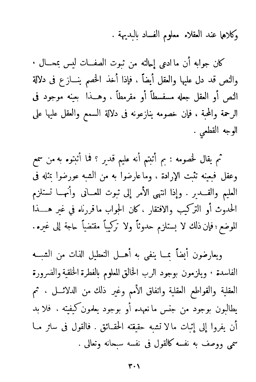 وَكِلَاهُمَا عِنْدَ الْعُقَلَاءِ مَعْلُومُ الْفَسَادِ بِالْبَدِيهَةِ. كَانَ جَوَابُهُ أَنَّ مَا ادَّعَى إحَالَتَهُ مِنْ ثُبُوتِ الصِّفَاتِ لَيْسَ بِمُحَالِ وَالنَّصُّ قَدْ دَلَّ عَلَيْهَا وَالْعَقْلُ أَيْضًا فَإِذَا أَخَذَ الْخَصْمُ يُنَازِعُ فِي دَلَالَةِ النَّصِّ أَوْ الْعَقْلِ جَعَلَهُ مُسَفْسِطًا أَوْ مُقَرْمِطًا وَهَذَا بِعَيْنِهِ مَوْجُودٌ فِي الرَّحْمَةِ وَالْمَحَبَّةِ فَإِنَّ خُصُومَهُ يُنَازِعُونَهُ فِي دَلَالَةِ السَّمْعِ وَالْعَقْلِ عَلَيْهَا عَلَى الْوَجْهِ الْقَطْعِيِّ. ثُمَّ يُقَالُ لِخُصُومِهِ: بِمَ أَثْبَتُّمْ أَنَّهُ عَلِيمٌ قَدِيرٌ؟ فَمَا أَثْبَتُوهُ بِهِ مِنْ سَمْعٍ وَعَقْلٍ فَبِعَيْنِهِ تَثْبُتُ الْإِرَادَةُ وَمَا عَارَضُوا بِهِ مِنْ الشُّبَهِ عُورِضُوا بِمِثْلِهِ فِي الْعَلِيمِ وَالْقَدِيرِ. وَإِذَا انْتَهَى الْأَمْرُ إلَى ثُبُوتِ الْمَعَانِي وَأَنَّهَا تَسْتَلْزِمُ الْحُدُوثَ أَوْ التَّرْكِيبَ وَالِافْتِقَارَ كَانَ الْجَوَابُ مَا قَرَّرْنَاهُ فِي غَيْرِ هَذَا الْمَوْضِعِ؛ فَإِنَّ ذَلِكَ لَا يَسْتَلْزِمُ حُدُوثًا وَلَا تَرْكِيبًا مُقْتَضِيًا حَاجَةً إلَى غَيْرِهِ. وَيُعَارِضُونَ أَيْضًا بِمَا يَنْفِي بِهِ أَهْلُ التَّعْطِيلِ الذَّاتَ مِنْ الشُّبَهِ الْفَاسِدَةِ وَيُلْزِمُونَ بِوُجُودِ الرَّبِّ الْخَالِقِ الْمَعْلُومِ بِالْفِطْرَةِ الْخِلْقِيَّةِ وَالضَّرُورَةِ الْعَقْلِيَّةِ وَالْقَوَاطِعِ الْعَقْلِيَّةِ وَاتِّفَاقِ الْأُمَمِ وَغَيْرِ ذَلِكَ مِنْ الدَّلَائِلِ ثُمَّ يُطَالِبُونَ بِوُجُودِ مِنْ جِنْسِ مَا نَعْهَدُهُ أَوْ بِوُجُودِ يَعْلَمُونَ كَيْفِيَّتَهُ فَلَا بُدَّ أَنْ يَفِرُّوا إلَى إثْبَاتِ مَا لَا تُشْبِهُ حَقِيقَتُهُ الْحَقَائِقَ. فَالْقَوْلُ فِي سَائِرِ مَا سَمَّى وَوَصَفَ بِهِ نَفْسَهُ كَالْقَوْلِ فِي نَفْسِهِ سُبْحَانَهُ وَتَعَالَى.