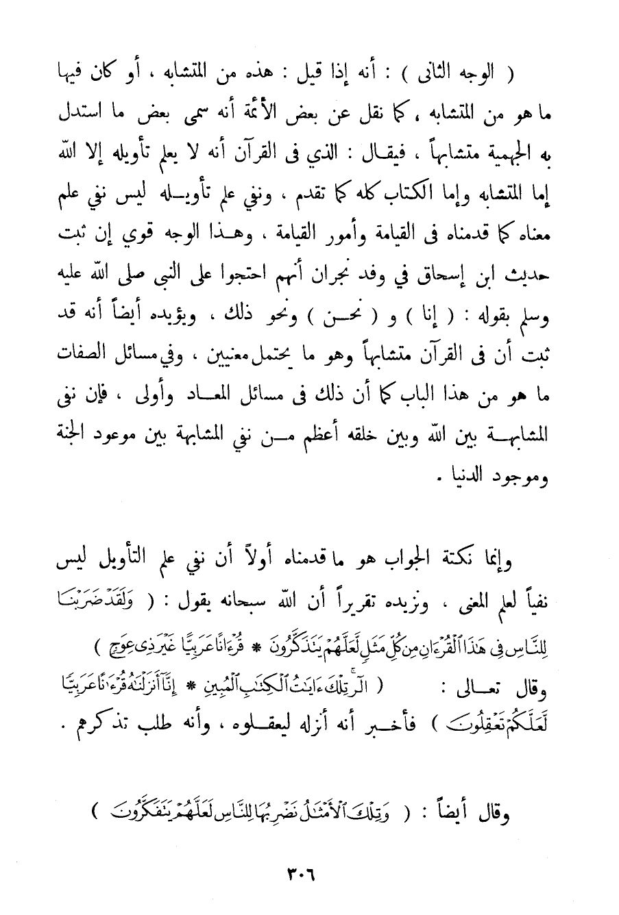 الْوَجْهُ الثَّانِي: أَنَّهُ إذَا قِيلَ: هَذِهِ مِنْ الْمُتَشَابِهِ أَوْ كَانَ فِيهَا مَا هُوَ مِنْ الْمُتَشَابِهِ كَمَا نُقِلَ عَنْ بَعْضِ الْأَئِمَّةِ أَنَّهُ سَمَّى بَعْضَ مَا اسْتَدَلَّ بِهِ الْجَهْمِيَّة مُتَشَابِهًا فَيُقَالُ: الَّذِي فِي الْقُرْآنِ أَنَّهُ لَا يَعْلَمُ تَأْوِيلَهُ إلَّا اللَّهُ إمَّا الْمُتَشَابِهُ وَإِمَّا الْكِتَابُ كُلُّهُ كَمَا تَقَدَّمَ وَنَفْيُ عِلْمِ تَأْوِيلِهِ لَيْسَ نَفْيَ عِلْمِ مَعْنَاهُ كَمَا قَدَّمْنَاهُ فِي الْقِيَامَةِ وَأُمُورِ الْقِيَامَةِ وَهَذَا الْوَجْهُ قَوِيٌّ إنْ ثَبَتَ حَدِيثُ ابْنِ إسْحَاقَ فِي وَفْدِ نَجْرَانَ أَنَّهُمْ احْتَجُّوا عَلَى النَّبِيِّ صَلَّى اللَّهُ عَلَيْهِ وَسَلَّمَ بِقَوْلِهِ: (إنَّا و (نَحْنُ وَنَحْوِ ذَلِكَ وَيُؤَيِّدُهُ أَيْضًا أَنَّهُ قَدْ ثَبَتَ أَنَّ فِي الْقُرْآنِ مُتَشَابِهًا وَهُوَ مَا يَحْتَمِلُ مَعْنَيَيْنِ وَفِي مَسَائِلِ الصِّفَاتِ مَا هُوَ مِنْ هَذَا الْبَابِ كَمَا أَنَّ ذَلِكَ فِي مَسَائِلِ الْمَعَادِ وَأَوْلَى فَإِنَّ نَفْيَ الْمُشَابَهَةِ بَيْنَ اللَّهِ وَبَيْنَ خَلْقِهِ أَعْظَمُ مِنْ نَفْيِ الْمُشَابَهَةِ بَيْنَ مَوْعُودِ الْجَنَّةِ وَمَوْجُودِ الدُّنْيَا. وَإِنَّمَا نُكْتَةُ الْجَوَابِ هُوَ مَا قَدَّمْنَاهُ أَوَّلًا أَنَّ نَفْيَ عِلْمِ التَّأْوِيلِ لَيْسَ نَفْيًا لِعِلْمِ الْمَعْنَى وَنَزِيدُهُ تَقْرِيرًا أَنَّ اللَّهَ سُبْحَانَهُ يَقُولُ: {وَلَقَدْ ضَرَبْنَا لِلنَّاسِ فِي هَذَا الْقُرْآنِ مِنْ كُلِّ مَثَلٍ لَعَلَّهُمْ يَتَذَكَّرُونَ} {قُرْءَانًا عَرَبِيًّا غَيْرَ ذِي عِوَجٍ لَعَلَّهُمْ يَتَّقُونَ} وَقَالَ تَعَالَى: {الر تِلْكَ آيَاتُ الْكِتَابِ الْمُبِينِ} {إنَّا أَنْزَلْنَاهُ قُرْآنًا عَرَبِيًّا لَعَلَّكُمْ تَعْقِلُونَ} فَأَخْبَرَ أَنَّهُ أَنْزَلَهُ لِيَعْقِلُوهُ وَأَنَّهُ طَلَبَ تَذَكُّرَهُمْ. وَقَالَ أَيْضًا: {وَتِلْكَ الْأَمْثَالُ نَضْرِبُهَا لِلنَّاسِ لَعَلَّهُمْ يَتَفَكَّرُونَ}