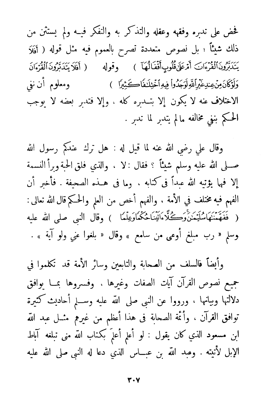 فَحَضَّ عَلَى تَدَبُّرِهِ وَفِقْهِهِ وَعَقْلِهِ وَالتَّذَكُّرِ بِهِ وَالتَّفَكُّرِ فِيهِ وَلَمْ يَسْتَثْنِ مِنْ ذَلِكَ شَيْئًا؛ بَلْ نُصُوصٌ مُتَعَدِّدَةٌ تُصَرِّحُ بِالْعُمُومِ فِيهِ مِثْلَ قَوْلِهِ {أَفَلَا يَتَدَبَّرُونَ الْقُرْآنَ أَمْ عَلَى قُلُوبٍ أَقْفَالُهَا} وَقَوْلِهِ {أَفَلَا يَتَدَبَّرُونَ الْقُرْآنَ وَلَوْ كَانَ مِنْ عِنْدِ غَيْرِ اللَّهِ لَوَجَدُوا فِيهِ اخْتِلَافًا كَثِيرًا} وَمَعْلُومٌ أَنَّ نَفْيَ الِاخْتِلَافِ عَنْهُ لَا يَكُونُ إلَّا بِتَدَبُّرِهِ كُلِّهِ وَإِلَّا فَتَدَبُّرُ بَعْضِهِ لَا يُوجِبُ الْحُكْمَ بِنَفْيِ مُخَالِفِهِ مَا لَمْ يَتَدَبَّرْ لِمَا تَدَبَّرَ. وَقَالَ عَلِيٌّ رَضِيَ اللَّهُ عَنْهُ لَمَّا قِيلَ لَهُ: هَلْ تَرَكَ عِنْدَكُمْ رَسُولُ اللَّهِ صَلَّى اللَّهُ عَلَيْهِ وَسَلَّمَ شَيْئًا؟ فَقَالَ: لَا وَاَلَّذِي فَلَقَ الْحَبَّةَ وَبَرَأَ النَّسَمَةَ إلَّا فَهْمًا يُؤْتِيهِ اللَّهُ عَبْدًا فِي كِتَابِهِ وَمَا فِي هَذِهِ الصَّحِيفَةِ. فَأَخْبَرَ أَنَّ الْفَهْمَ فِيهِ مُخْتَلِفٌ فِي الْأُمَّةِ وَالْفَهْمُ أَخَصُّ مِنْ الْعِلْمِ وَالْحُكْمِ قَالَ اللَّهُ تَعَالَى: {فَفَهَّمْنَاهَا سُلَيْمَانَ وَكُلًّا آتَيْنَا حُكْمًا وَعِلْمًا} وَقَالَ النَّبِيُّ صَلَّى اللَّهُ عَلَيْهِ وَسَلَّمَ {رُبَّ مُبَلِّغٍ أَوْعَى مِنْ سَامِعٍ} وَقَالَ {بَلِّغُوا عَنِّي وَلَوْ آيَةً} . وَأَيْضًا فَالسَّلَفُ مِنْ الصَّحَابَةِ وَالتَّابِعِينَ وَسَائِرِ الْأُمَّةِ قَدْ تَكَلَّمُوا فِي جَمِيعِ نُصُوصِ الْقُرْآنِ آيَاتِ الصِّفَاتِ وَغَيْرِهَا وَفَسَّرُوهَا بِمَا يُوَافِقُ دَلَالَتَهَا وَبَيَانَهَا وَرَوَوْا عَنْ النَّبِيِّ صَلَّى اللَّهُ عَلَيْهِ وَسَلَّمَ أَحَادِيثَ كَثِيرَةً تُوَافِقُ الْقُرْآنَ وَأَئِمَّةُ الصَّحَابَةِ فِي هَذَا أَعْظَمُ مِنْ غَيْرِهِمْ مِثْلُ عَبْدِ اللَّهِ بْنِ مَسْعُودٍ الَّذِي كَانَ يَقُولُ: لَوْ أَعْلَمُ أَعْلَمَ بِكِتَابِ اللَّهِ مِنِّي تَبْلُغُهُ آبَاطُ الْإِبِلِ لَأَتَيْته. وَعَبْدُ اللَّهِ بْنُ عَبَّاسٍ الَّذِي دَعَا لَهُ النَّبِيُّ صَلَّى اللَّهُ عَلَيْهِ وَسَلَّمَ