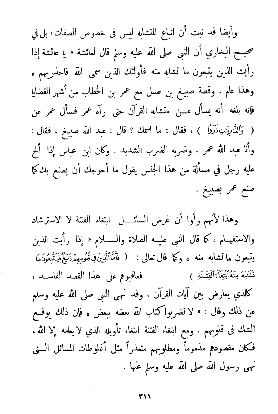 وَأَيْضًا قَدْ ثَبَتَ أَنَّ اتِّبَاعَ الْمُتَشَابِهِ لَيْسَ فِي خُصُوصِ الصِّفَاتِ؛ بَلْ فِي صَحِيحِ الْبُخَارِيِّ {أَنَّ النَّبِيَّ صَلَّى اللَّهُ عَلَيْهِ وَسَلَّمَ قَالَ لِعَائِشَةَ يَا عَائِشَةُ إذَا رَأَيْت الَّذِينَ يَتَّبِعُونَ مَا تَشَابَهَ مِنْهُ فَأُولَئِكَ الَّذِينَ سَمَّى اللَّهُ فَاحْذَرِيهِمْ} وَهَذَا عَامٌّ. وَقِصَّةُ صَبِيغِ بْنِ عَسَلٍ مَعَ عُمَرَ بْنِ الْخَطَّابِ مِنْ أَشْهَرِ الْقَضَايَا فَإِنَّهُ بَلَّغَهُ أَنَّهُ يَسْأَلُ عَنْ مُتَشَابِهِ الْقُرْآنِ حَتَّى رَآهُ عُمَرُ فَسَأَلَ عُمَرَ عَنْ {وَالذَّارِيَاتِ ذَرْوًا} فَقَالَ: مَا اسْمُك؟ قَالَ: عَبْدُ اللَّهِ صَبِيغٌ فَقَالَ: وَأَنَا عَبْدُ اللَّهِ عُمَرُ وَضَرَبَهُ الضَّرْبَ الشَّدِيدَ. وَكَانَ ابْنُ عَبَّاسٍ إذَا أَلَحَّ عَلَيْهِ رَجُلٌ فِي مَسْأَلَةٍ مِنْ هَذَا الْجِنْسِ يَقُولُ مَا أَحْوَجَك أَنْ يُصْنَعَ بِك كَمَا صَنَعَ عُمَرُ بِصَبِيغِ. وَهَذَا لِأَنَّهُمْ رَأَوْا أَنَّ غَرَضَ السَّائِلِ ابْتِغَاءُ الْفِتْنَةِ لَا الِاسْتِرْشَادُ وَالِاسْتِفْهَامُ كَمَا قَالَ النَّبِيُّ عَلَيْهِ الصَّلَاةُ وَالسَّلَامُ {إذَا رَأَيْت الَّذِينَ يَتَّبِعُونَ مَا تَشَابَهَ مِنْهُ} وَكَمَا قَالَ تَعَالَى: {فَأَمَّا الَّذِينَ فِي قُلُوبِهِمْ زَيْغٌ فَيَتَّبِعُونَ مَا تَشَابَهَ مِنْهُ ابْتِغَاءَ الْفِتْنَةِ} فَعَاقَبُوهُمْ عَلَى هَذَا الْقَصْدِ الْفَاسِدِ كَاَلَّذِي يُعَارِضُ بَيْنَ آيَاتِ الْقُرْآنِ وَقَدْ نَهَى النَّبِيُّ صَلَّى اللَّهُ عَلَيْهِ وَسَلَّمَ عَنْ ذَلِكَ وَقَالَ: {لَا تَضْرِبُوا كِتَابَ اللَّهِ بَعْضَهُ بِبَعْضِ} فَإِنَّ ذَلِكَ يُوقِعُ الشَّكَّ فِي قُلُوبِهِمْ. وَمَعَ ابْتِغَاءِ الْفِتْنَةِ ابْتِغَاءُ تَأْوِيلِهِ الَّذِي لَا يَعْلَمُهُ إلَّا اللَّهُ فَكَانَ مَقْصُودُهُمْ مَذْمُومًا وَمَطْلُوبُهُمْ مُتَعَذِّرًا مِثْلَ أُغْلُوطَاتِ الْمَسَائِلِ الَّتِي نَهَى رَسُولُ اللَّهِ صَلَّى اللَّهُ عَلَيْهِ وَسَلَّمَ عَنْهَا.