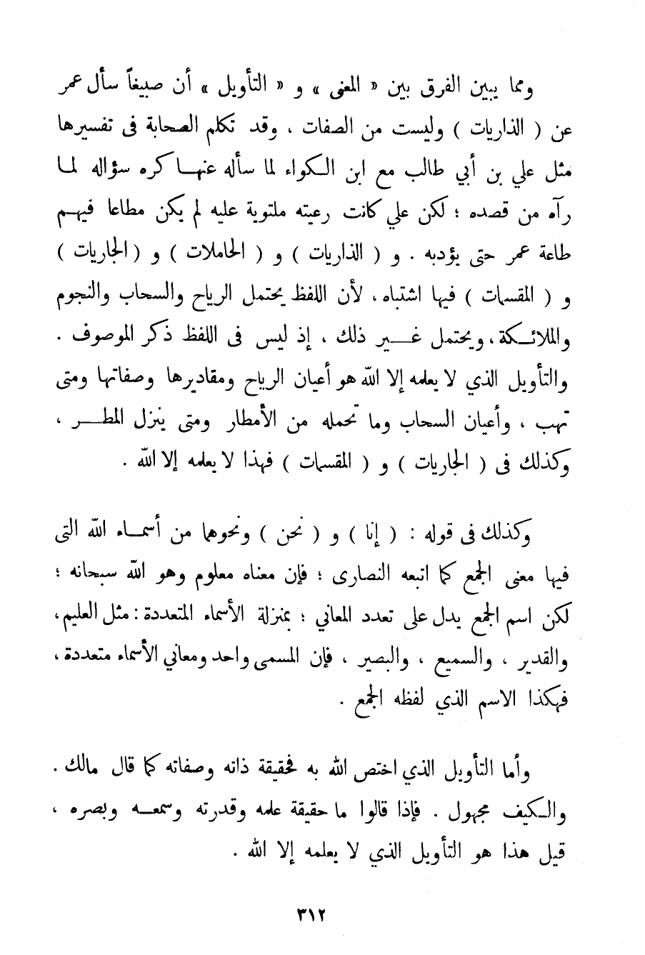 وَمِمَّا يُبَيِّنُ الْفَرْقَ بَيْنَ " الْمَعْنَى " و " التَّأْوِيلِ " أَنَّ صَبِيغًا سَأَلَ عُمَرَ عَنْ (الذَّارِيَاتِ وَلَيْسَتْ مِنْ الصِّفَاتِ وَقَدْ تَكَلَّمَ الصَّحَابَةُ فِي تَفْسِيرِهَا مِثْلَ عَلِيِّ بْنِ أَبِي طَالِبٍ مَعَ ابْنِ الْكِوَاءِ لَمَّا سَأَلَهُ عَنْهَا كَرِهَ سُؤَالَهُ لِمَا رَآهُ مِنْ قَصْدِهِ؛ لَكِنْ عَلِيٌّ كَانَتْ رَعِيَّتُهُ مُلْتَوِيَةً عَلَيْهِ لَمْ يَكُنْ مُطَاعًا فِيهِمْ طَاعَةَ عُمَرَ حَتَّى يُؤَدِّبَهُ. و (الذَّارِيَاتُ و (الْحَامِلَاتُ و (الْجَارِيَاتُ و (الْمُقَسِّمَاتُ فِيهَا اشْتِبَاهٌ لِأَنَّ اللَّفْظَ يَحْتَمِلُ الرِّيَاحَ وَالسَّحَابَ وَالنُّجُومَ وَالْمَلَائِكَةَ وَيَحْتَمِلُ غَيْرَ ذَلِكَ إذْ لَيْسَ فِي اللَّفْظِ ذِكْرُ الْمَوْصُوفِ. وَالتَّأْوِيلُ الَّذِي لَا يَعْلَمُهُ إلَّا اللَّهُ هُوَ أَعْيَانُ الرِّيَاحِ وَمَقَادِيرُهَا وَصِفَاتُهَا وَمَتَى تَهُبُّ وَأَعْيَانُ السَّحَابِ وَمَا تَحْمِلُهُ مِنْ الْأَمْطَارِ وَمَتَى يَنْزِلُ الْمَطَرُ وَكَذَلِكَ فِي (الْجَارِيَاتِ) و (الْمُقَسِّمَاتِ) فَهَذَا لَا يَعْلَمُهُ إلَّا اللَّهُ. وَكَذَلِكَ فِي قَوْلِهِ: (إنَّا) و (نَحْنُ) وَنَحْوِهِمَا مِنْ أَسْمَاءِ اللَّهِ الَّتِي فِيهَا مَعْنَى الْجَمْعِ كَمَا اتَّبَعَهُ النَّصَارَى؛ فَإِنَّ مَعْنَاهُ مَعْلُومٌ وَهُوَ اللَّهُ سُبْحَانَهُ؛ لَكِنَّ اسْمَ الْجَمْعِ يَدُلُّ عَلَى تَعَدُّدِ الْمَعَانِي؛ بِمَنْزِلَةِ الْأَسْمَاءِ الْمُتَعَدِّدَةِ: مِثْلِ الْعَلِيمِ وَالْقَدِيرِ وَالسَّمِيعِ وَالْبَصِيرِ فَإِنَّ الْمُسَمَّى وَاحِدٌ وَمَعَانِي الْأَسْمَاءِ مُتَعَدِّدَةٌ فَهَكَذَا الِاسْمُ الَّذِي لَفْظُهُ الْجَمْعُ. وَأَمَّا التَّأْوِيلُ الَّذِي اخْتَصَّ اللَّهُ بِهِ فَحَقِيقَةُ ذَاتِهِ وَصِفَاتِهِ كَمَا قَالَ مَالِكٌ. وَالْكَيْفُ مَجْهُولٌ. فَإِذَا قَالُوا مَا حَقِيقَةُ عِلْمِهِ وَقُدْرَتِهِ وَسَمْعِهِ وَبَصَرِهِ قِيلَ هَذَا هُوَ التَّأْوِيلُ الَّذِي لَا يَعْلَمُهُ إلَّا اللَّهُ.