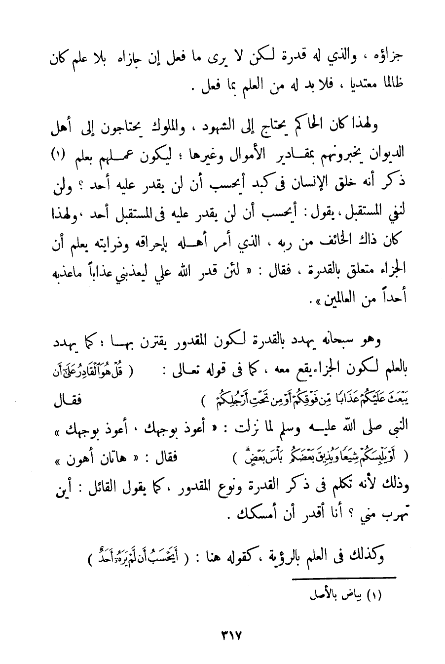 جَزَاؤُهُ وَاَلَّذِي لَهُ قُدْرَةٌ لَكِنْ لَا يَرَى مَا فَعَلَ إنْ جَازَاهُ بِلَا عِلْمٍ كَانَ ظَالِمًا مُعْتَدِيًا فَلَا بُدَّ لَهُ مِنْ الْعِلْمِ بِمَا فَعَلَ. وَلِهَذَا كَانَ الْحَاكِمُ يَحْتَاجُ إلَى الشُّهُودِ وَالْمُلُوكُ يَحْتَاجُونَ إلَى أَهْلِ الدِّيوَانِ يُخْبِرُونَهُمْ بِمَقَادِيرِ الْأَمْوَالِ وَغَيْرِهَا؛ لِيَكُونَ عَمَلُهُمْ بِعِلْمِ. . . (1) ذَكَرَ أَنَّهُ خَلَقَ الْإِنْسَانَ فِي كَبَدٍ أَيَحْسَبُ أَنْ لَنْ يَقْدِرَ عَلَيْهِ أَحَدٌ؟ وَلَنْ لِنَفْيِ الْمُسْتَقْبَلِ يَقُولُ: أَيَحْسَبُ أَنْ لَنْ يَقْدِرَ عَلَيْهِ فِي الْمُسْتَقْبَلِ أَحَدٌ وَلِهَذَا كَانَ ذَاكَ الْخَائِفُ مِنْ رَبِّهِ الَّذِي أَمَرَ أَهْلَهُ بِإِحْرَاقِهِ وذرايته يَعْلَمُ أَنَّ الْجَزَاءَ مُتَعَلِّقٌ بِالْقُدْرَةِ فَقَالَ: {لَئِنْ قَدَرَ اللَّهُ عَلَيَّ لَيُعَذِّبَنِّي عَذَابًا مَا عَذَّبَهُ أَحَدًا مِنْ الْعَالَمِينَ} . وَهُوَ سُبْحَانَهُ يُهَدِّدُ بِالْقُدْرَةِ لِكَوْنِ الْمَقْدُورِ يَقْتَرِنُ بِهَا؛ كَمَا يُهَدِّدُ بِالْعِلْمِ لِكَوْنِ الْجَزَاءِ يَقَعُ مَعَهُ كَمَا فِي {قَوْله تَعَالَى {قُلْ هُوَ الْقَادِرُ عَلَى أَنْ يَبْعَثَ عَلَيْكُمْ عَذَابًا مِنْ فَوْقِكُمْ أَوْ مِنْ تَحْتِ أَرْجُلِكُمْ} فَقَالَ النَّبِيُّ صَلَّى اللَّهُ عَلَيْهِ وَسَلَّمَ لَمَّا نَزَلَتْ: أَعُوذُ بِوَجْهِك أَعُوذُ بِوَجْهِك {أَوْ يَلْبِسَكُمْ شِيَعًا وَيُذِيقَ بَعْضَكُمْ بَأْسَ بَعْضٍ} فَقَالَ: هَاتَانِ أَهْوَنُ} وَذَلِكَ لِأَنَّهُ تَكَلَّمَ فِي ذِكْرِ الْقُدْرَةِ وَنَوْعِ الْمَقْدُورِ كَمَا يَقُولُ الْقَائِلُ: أَيْنَ تَهْرُبُ مِنِّي؟ أَنَا أَقْدِرُ أَنْ أُمْسِكَك. وَكَذَلِكَ فِي الْعِلْمِ بِالرُّؤْيَةِ كَقَوْلِهِ هُنَا: {أَيَحْسَبُ أَنْ لَمْ يَرَهُ أَحَدٌ}