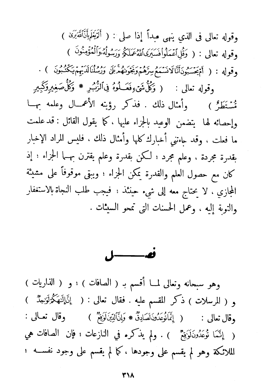وقَوْله تَعَالَى فِي الَّذِي يَنْهَى عَبْدًا إذَا صَلَّى: {أَلَمْ يَعْلَمْ بِأَنَّ اللَّهَ يَرَى} وقَوْله تَعَالَى {وَقُلِ اعْمَلُوا فَسَيَرَى اللَّهُ عَمَلَكُمْ وَرَسُولُهُ وَالْمُؤْمِنُونَ} وَقَوْلِهِ: {أَمْ يَحْسَبُونَ أَنَّا لَا نَسْمَعُ سِرَّهُمْ وَنَجْوَاهُمْ بَلَى وَرُسُلُنَا لَدَيْهِمْ يَكْتُبُونَ} . وقَوْله تَعَالَى {وَكُلُّ شَيْءٍ فَعَلُوهُ فِي الزُّبُرِ} {وَكُلُّ صَغِيرٍ وَكَبِيرٍ مُسْتَطَرٌ} وَأَمْثَالِ ذَلِكَ. فَذِكْرُ رُؤْيَتِهِ الْأَعْمَالَ وَعِلْمِهِ بِهَا وَإِحْصَائِهِ لَهَا يَتَضَمَّنُ الْوَعِيدَ بِالْجَزَاءِ عَلَيْهَا كَمَا يَقُولُ الْقَائِلُ: قَدْ عَلِمْت مَا فَعَلْت وَقَدْ جَاءَتْنِي أَخْبَارُك كُلُّهَا وَأَمْثَالُ ذَلِكَ فَلَيْسَ الْمُرَادُ الْإِخْبَارَ بِقُدْرَةِ مُجَرَّدَةٍ وَعِلْمٍ مُجَرَّدٍ؛ لَكِنْ بِقُدْرَةِ وَعِلْمٍ يَقْتَرِنُ بِهِمَا الْجَزَاءُ؛ إذْ كَانَ مَعَ حُصُولِ الْعِلْمِ وَالْقُدْرَةِ يُمْكِنُ الْجَزَاءُ؛ وَيَبْقَى مَوْقُوفًا عَلَى مَشِيئَةِ الْمُجَازِي لَا يَحْتَاجُ مَعَهُ إلَى شَيْءٍ حِينَئِذٍ؛ فَيَجِبُ طَلَبُ النَّجَاةِ بِالِاسْتِغْفَارِ وَالتَّوْبَةِ إلَيْهِ وَعَمَلِ الْحَسَنَاتِ الَّتِي تَمْحُو السَّيِّئَاتِ.