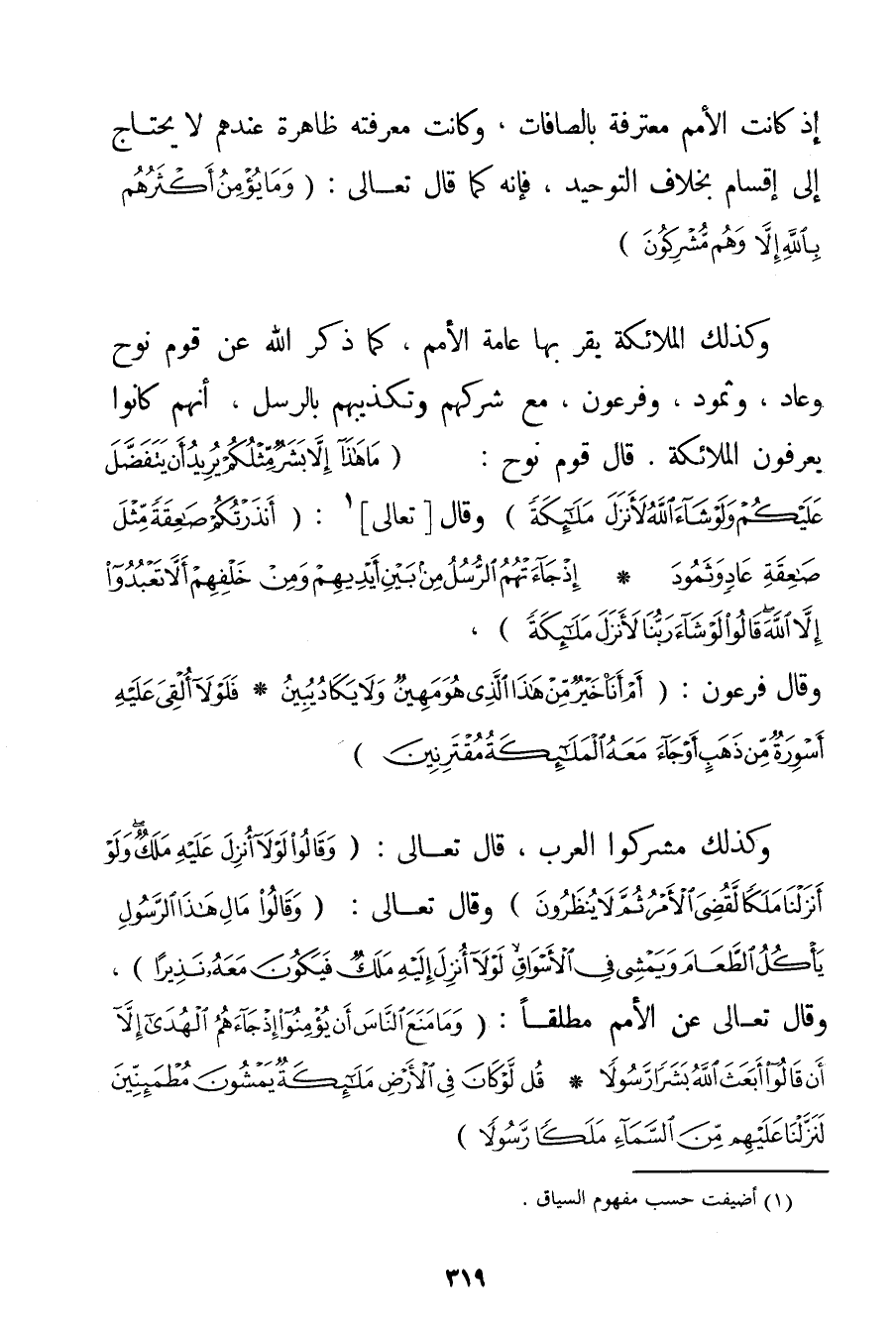 إذْ كَانَتْ الْأُمَمُ مُعْتَرِفَةً بِالصَّافَّاتِ وَكَانَتْ مَعْرِفَتُهُ ظَاهِرَةً عِنْدَهُمْ لَا يَحْتَاجُ إلَى إقْسَامٍ بِخِلَافِ التَّوْحِيدِ فَإِنَّهُ كَمَا قَالَ تَعَالَى: {وَمَا يُؤْمِنُ أَكْثَرُهُمْ بِاللَّهِ إلَّا وَهُمْ مُشْرِكُونَ} وَكَذَلِكَ الْمَلَائِكَةُ يُقِرُّ بِهَا عَامَّةُ الْأُمَمِ كَمَا ذَكَرَ اللَّهُ عَنْ قَوْمِ نُوحٍ وَعَادٍ وَثَمُودَ وَفِرْعَوْنَ مَعَ شِرْكِهِمْ وَتَكْذِيبِهِمْ بِالرُّسُلِ أَنَّهُمْ كَانُوا يَعْرِفُونَ الْمَلَائِكَةَ. قَالَ قَوْمُ نُوحٍ: {مَا هَذَا إلَّا بَشَرٌ مِثْلُكُمْ يُرِيدُ أَنْ يَتَفَضَّلَ عَلَيْكُمْ وَلَوْ شَاءَ اللَّهُ لَأَنْزَلَ مَلَائِكَةً} وَقَالَ تَعَالَى: {أَنْذَرْتُكُمْ صَاعِقَةً مِثْلَ صَاعِقَةِ عَادٍ وَثَمُودَ} {إذْ جَاءَتْهُمُ الرُّسُلُ مِنْ بَيْنِ أَيْدِيهِمْ وَمِنْ خَلْفِهِمْ أَلَّا تَعْبُدُوا إلَّا اللَّهَ قَالُوا لَوْ شَاءَ رَبُّنَا لَأَنْزَلَ مَلَائِكَةً} وَقَالَ فِرْعَوْنُ: {أَمْ أَنَا خَيْرٌ مِنْ هَذَا الَّذِي هُوَ مَهِينٌ وَلَا يَكَادُ يُبِينُ} {فَلَوْلَا أُلْقِيَ عَلَيْهِ أَسْوِرَةٌ مِنْ ذَهَبٍ أَوْ جَاءَ مَعَهُ الْمَلَائِكَةُ مُقْتَرِنِينَ} وَكَذَلِكَ مُشْرِكُو الْعَرَبِ قَالَ تَعَالَى: {وَقَالُوا لَوْلَا أُنْزِلَ عَلَيْهِ مَلَكٌ وَلَوْ أَنْزَلْنَا مَلَكًا لَقُضِيَ الْأَمْرُ ثُمَّ لَا يُنْظَرُونَ} وَقَالَ تَعَالَى: {وَقَالُوا مَالِ هَذَا الرَّسُولِ يَأْكُلُ الطَّعَامَ وَيَمْشِي فِي الْأَسْوَاقِ لَوْلَا أُنْزِلَ إلَيْهِ مَلَكٌ فَيَكُونَ مَعَهُ نَذِيرًا} وَقَالَ تَعَالَى عَنْ الْأُمَمِ مُطْلَقًا: {وَمَا مَنَعَ النَّاسَ أَنْ يُؤْمِنُوا إذْ جَاءَهُمُ الْهُدَى إلَّا أَنْ قَالُوا أَبَعَثَ اللَّهُ بَشَرًا رَسُولًا} {قُلْ لَوْ كَانَ فِي الْأَرْضِ مَلَائِكَةٌ يَمْشُونَ مُطْمَئِنِّينَ لَنَزَّلْنَا عَلَيْهِمْ مِنَ السَّمَاءِ مَلَكًا رَسُولًا}
